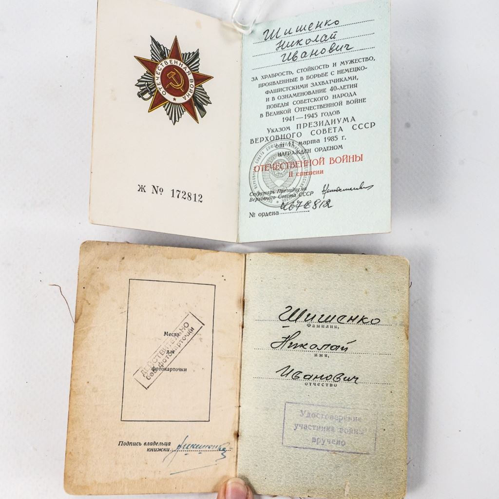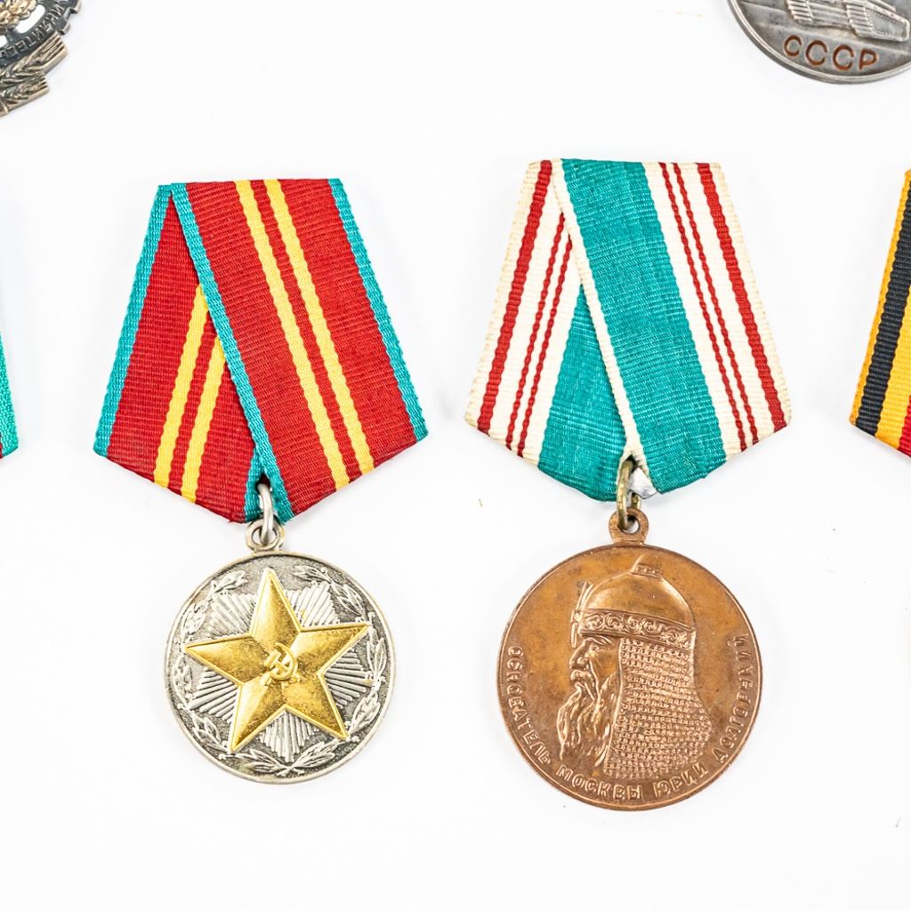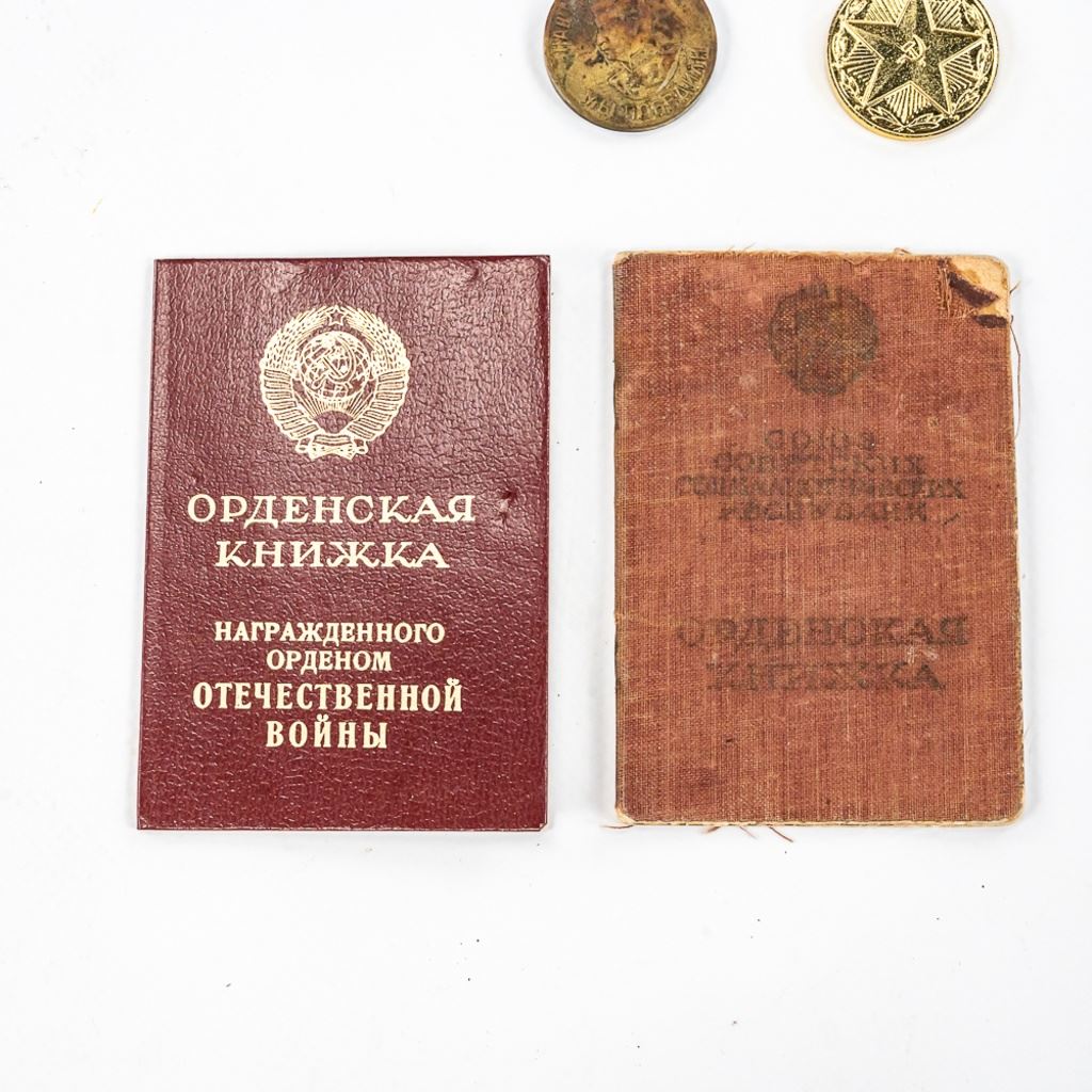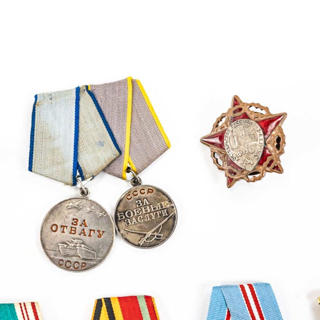 This lot of xx includes Numbered Red Banner Medal #746477, Numbered Red Star #2029770, parade mount of medals for bravery and combat (unnumbered) , War With Germany medal, 2 medal ID books, 1 Unknown Chernobyl numbered badge #62, and 11 other Soviet service medals.