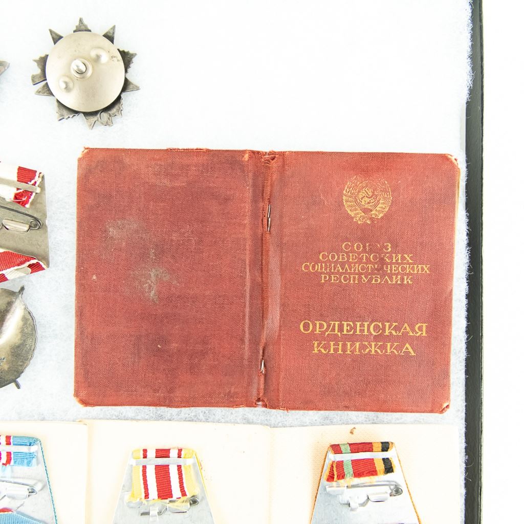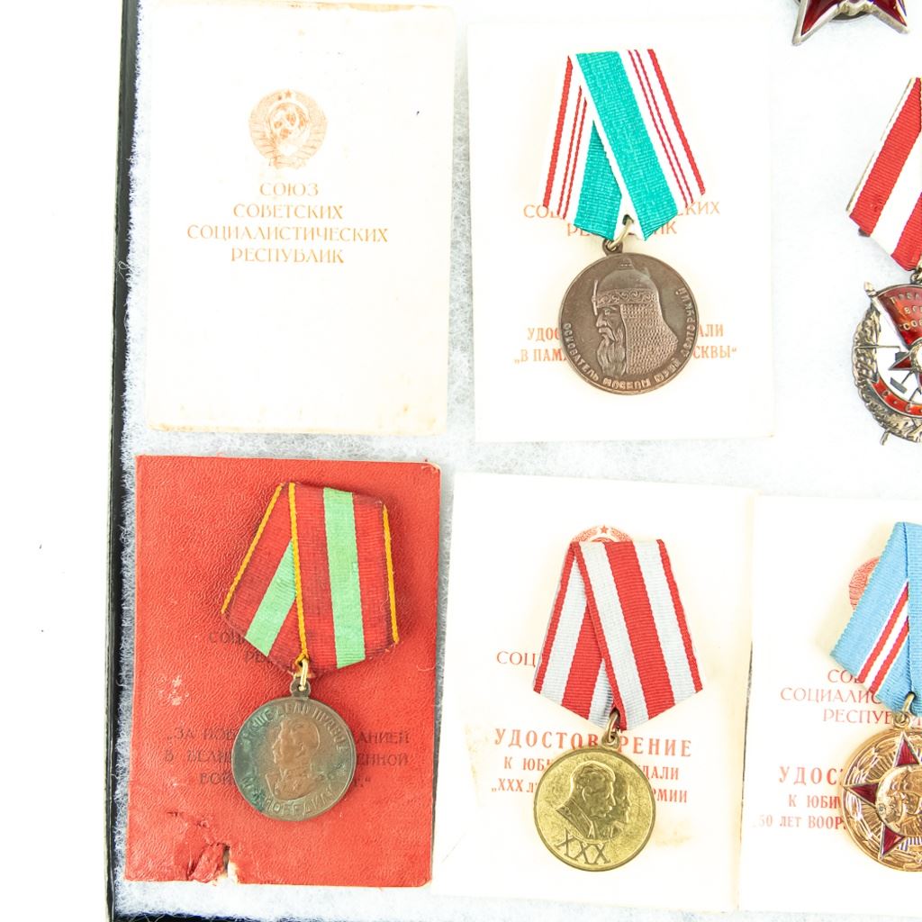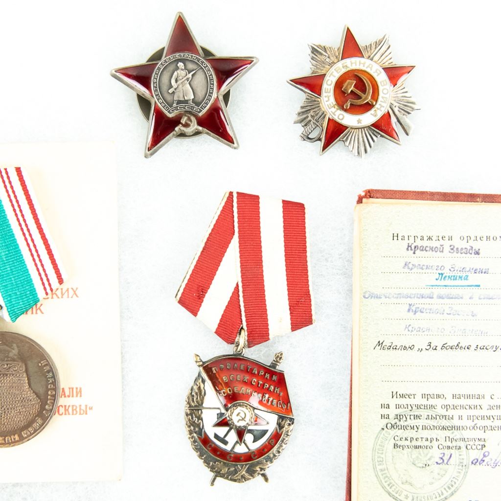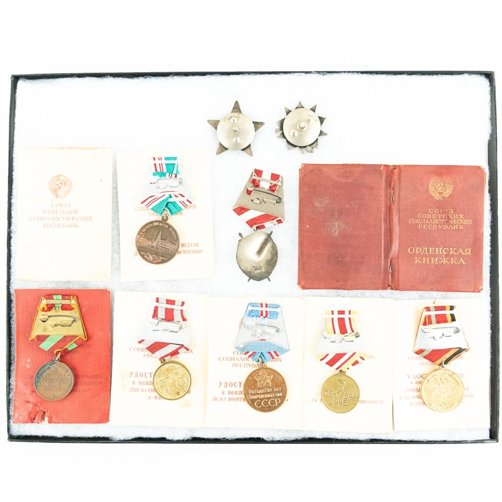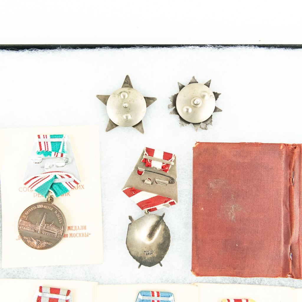 This lot is one soldier's grouping and has 8 matching name medal cards with 3 numbered awards the match. The awards include Order of Red Star #961141, Patriotic War Badge numbered #8155376 and Order of Red Banner #398022. Also included are 6 of the matching medals to their respective cards. This is nice example of a named and matching numbered grouping.