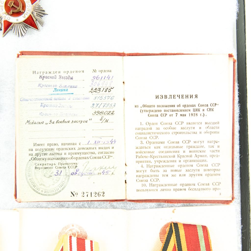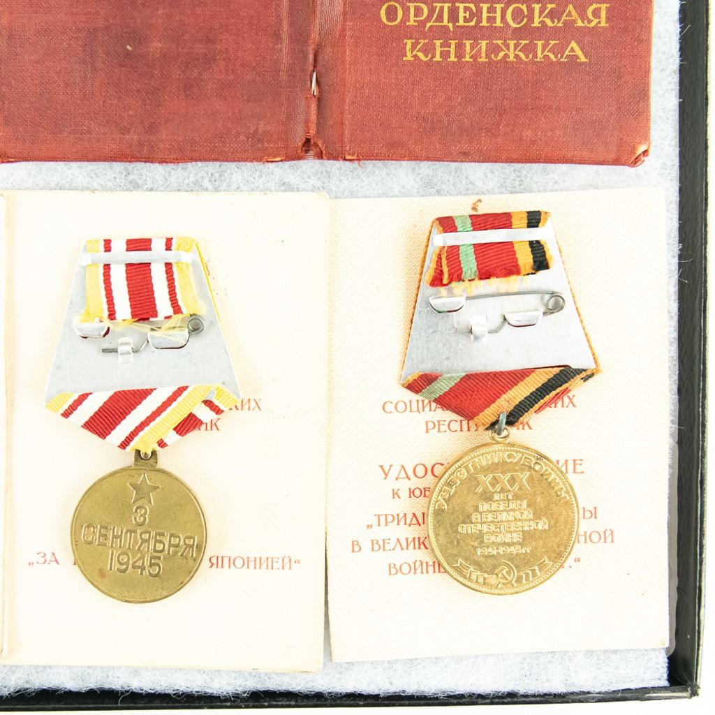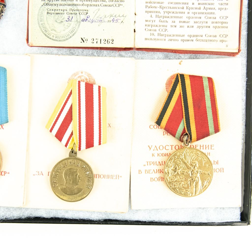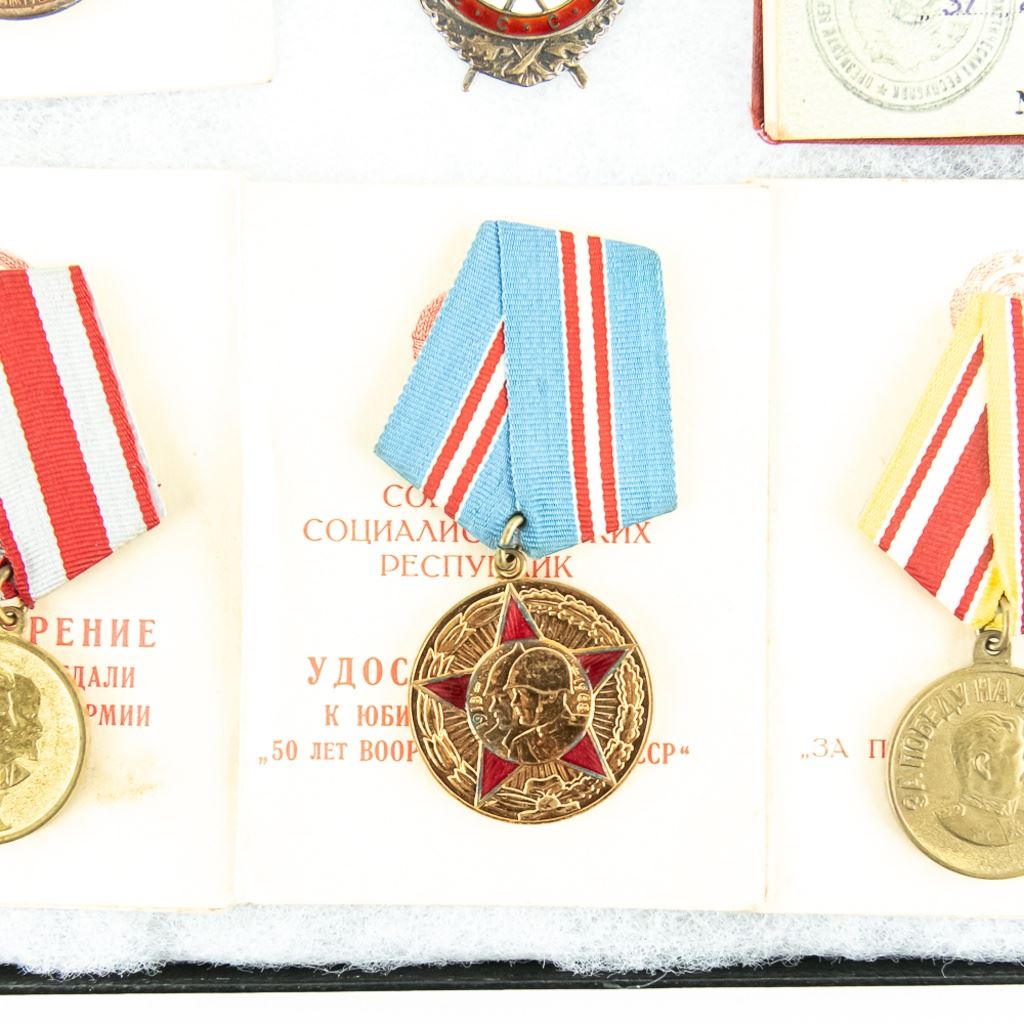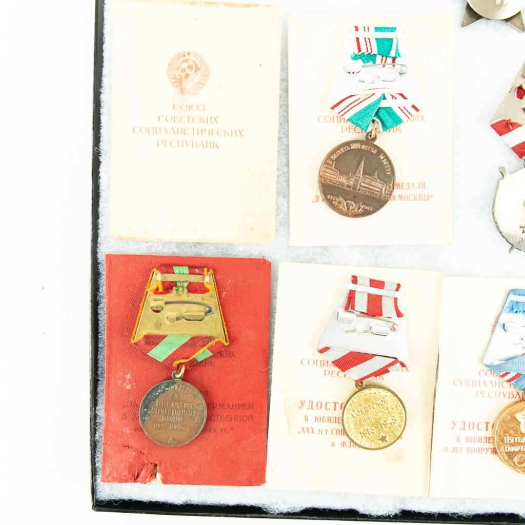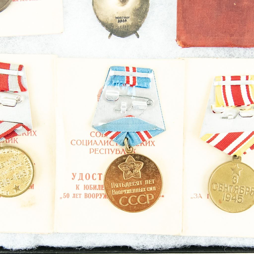 This lot is one soldier's grouping and has 8 matching name medal cards with 3 numbered awards the match. The awards include Order of Red Star #961141, Patriotic War Badge numbered #8155376 and Order of Red Banner #398022. Also included are 6 of the matching medals to their respective cards. This is nice example of a named and matching numbered grouping.