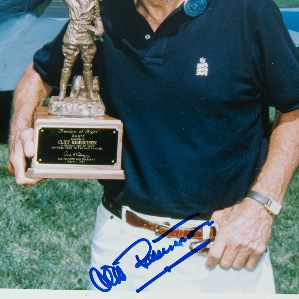 Both photos are Color 8 x 10 of Glenn posing in space suit and Cliff Robertson posing at the Oshkosh Air Show. Glenn's is signed and inscribed in black felt tip, "Best regards- John Glenn” In fine condition. Robertson's is signed in blue felt pen and is in fine condition. These were signed at the Oshkosh Air Show in the 1990s and are not graded. Note: Look for the other Robertson autograph in Scott Carpenter lot.