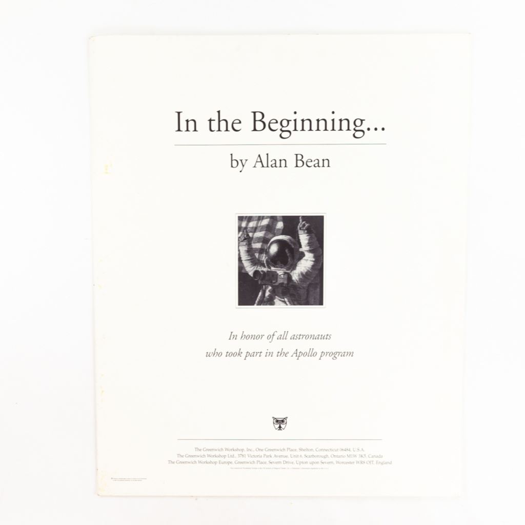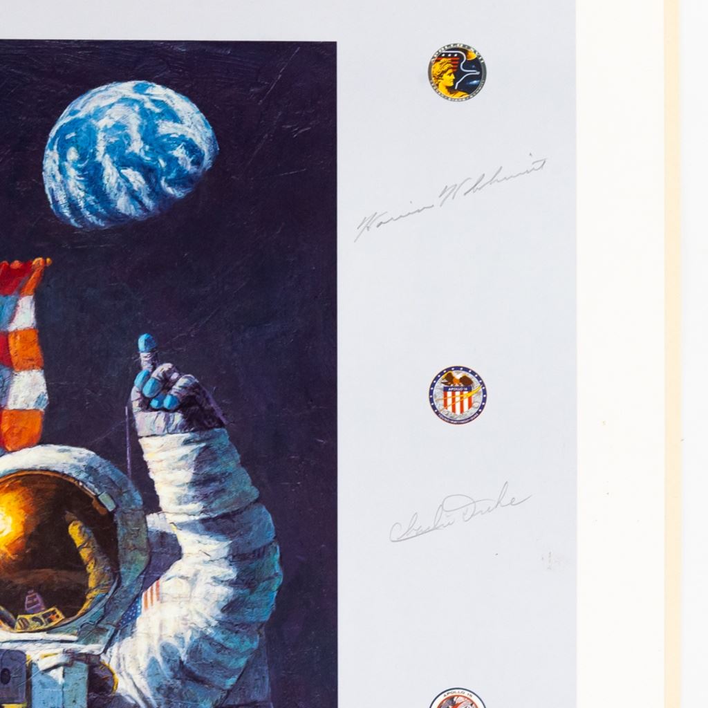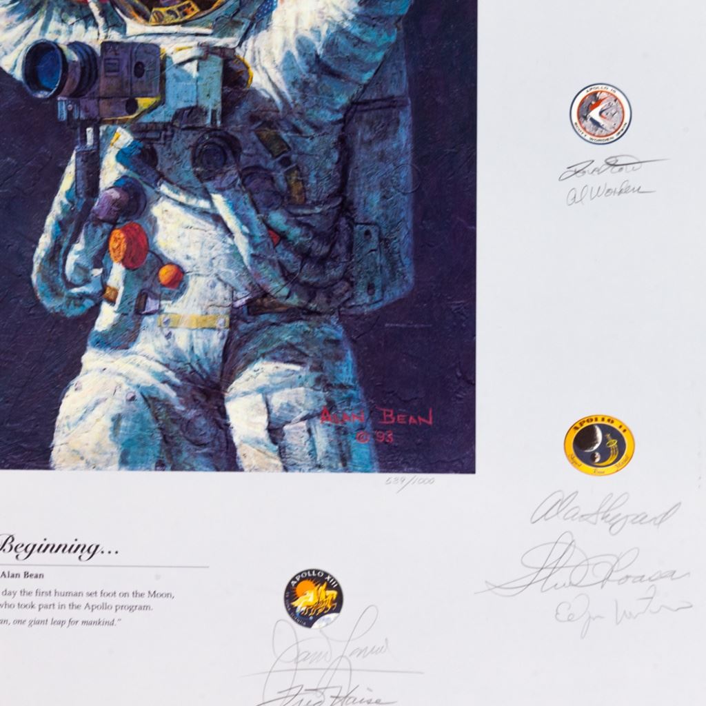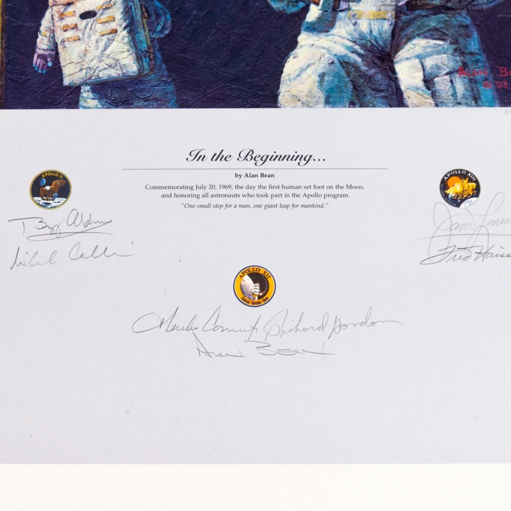 In 1994, "In the Beginning" was created to celebrate the anniversary. This is a portrait of Neil Armstrong, the first man on the moon, celebrating their accomplishment in red, white and blue while Gene Cernan, the latest moon explorer, gives a friendly wave at the planet they've temporarily left behind. A fine collection of Apollo astronaut signatures on this beautiful print by Alan Bean, a moon walker himself from Apollo 12. Signatures include: