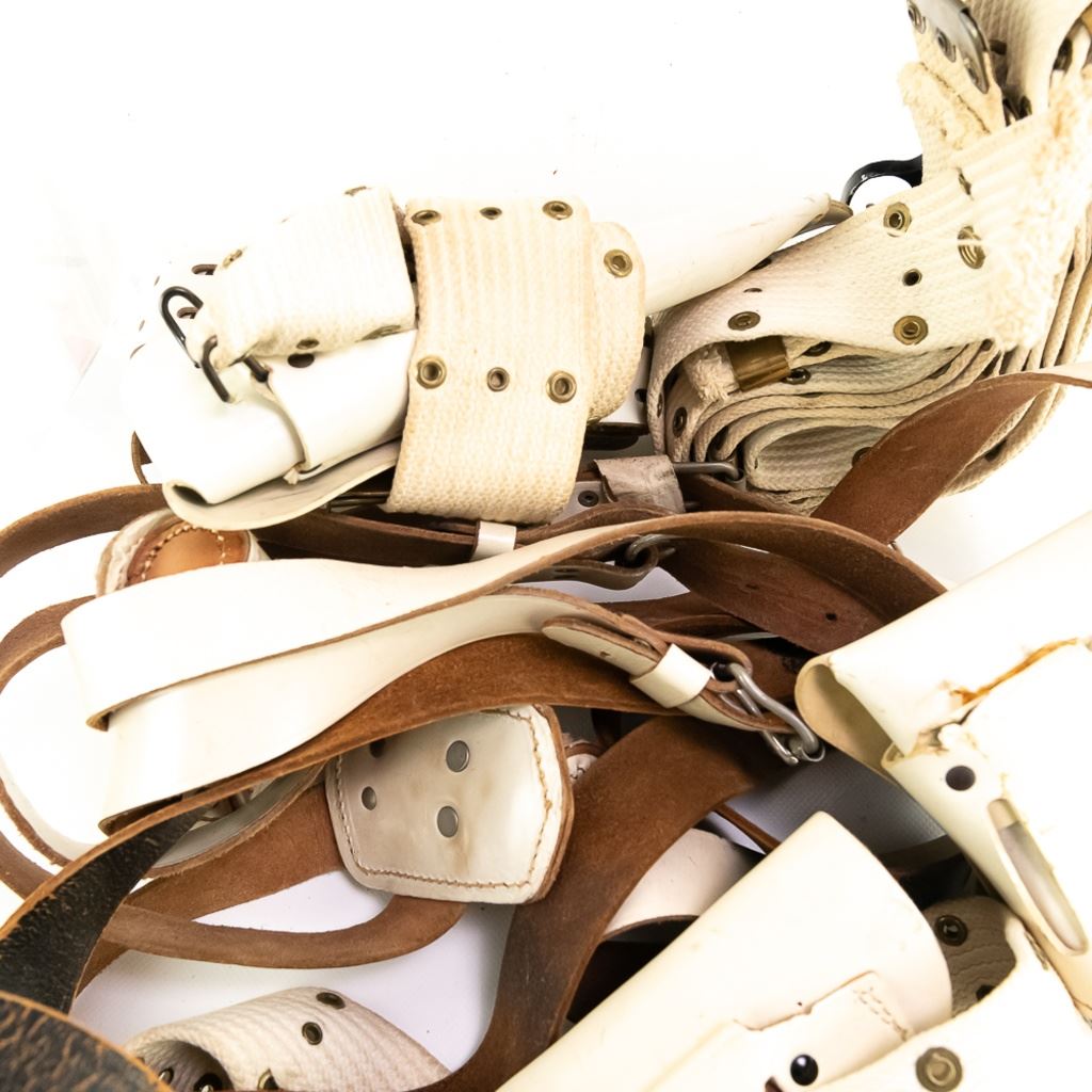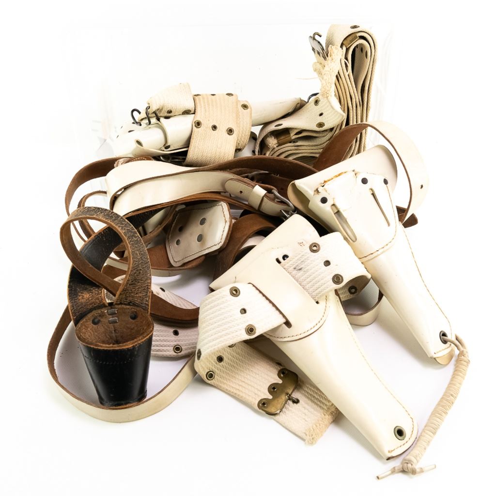 - 3x VFW White Flap Pistol Holsters, 5x white web holster belts, 2x white Garrison belts, all show wear