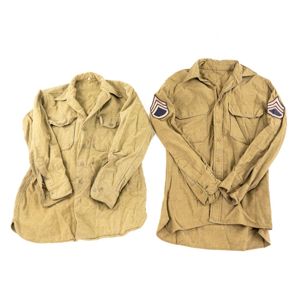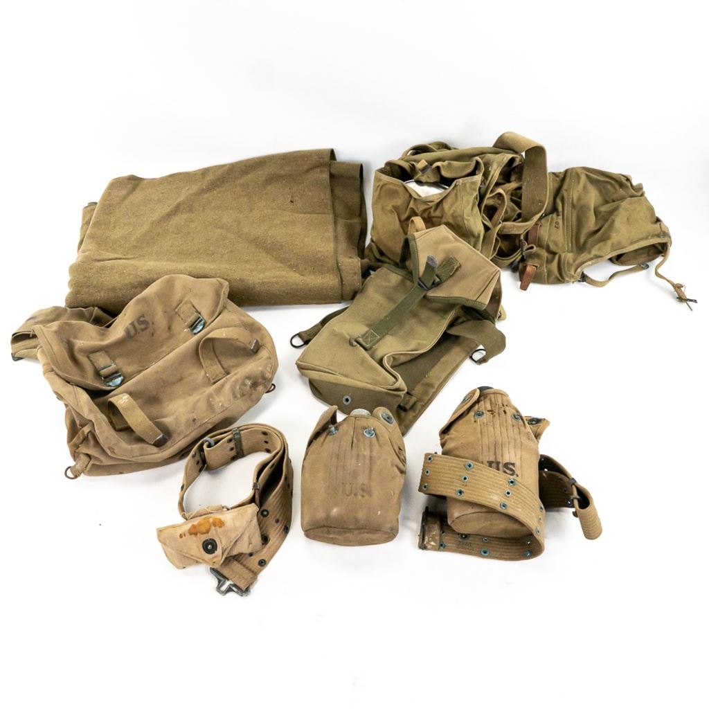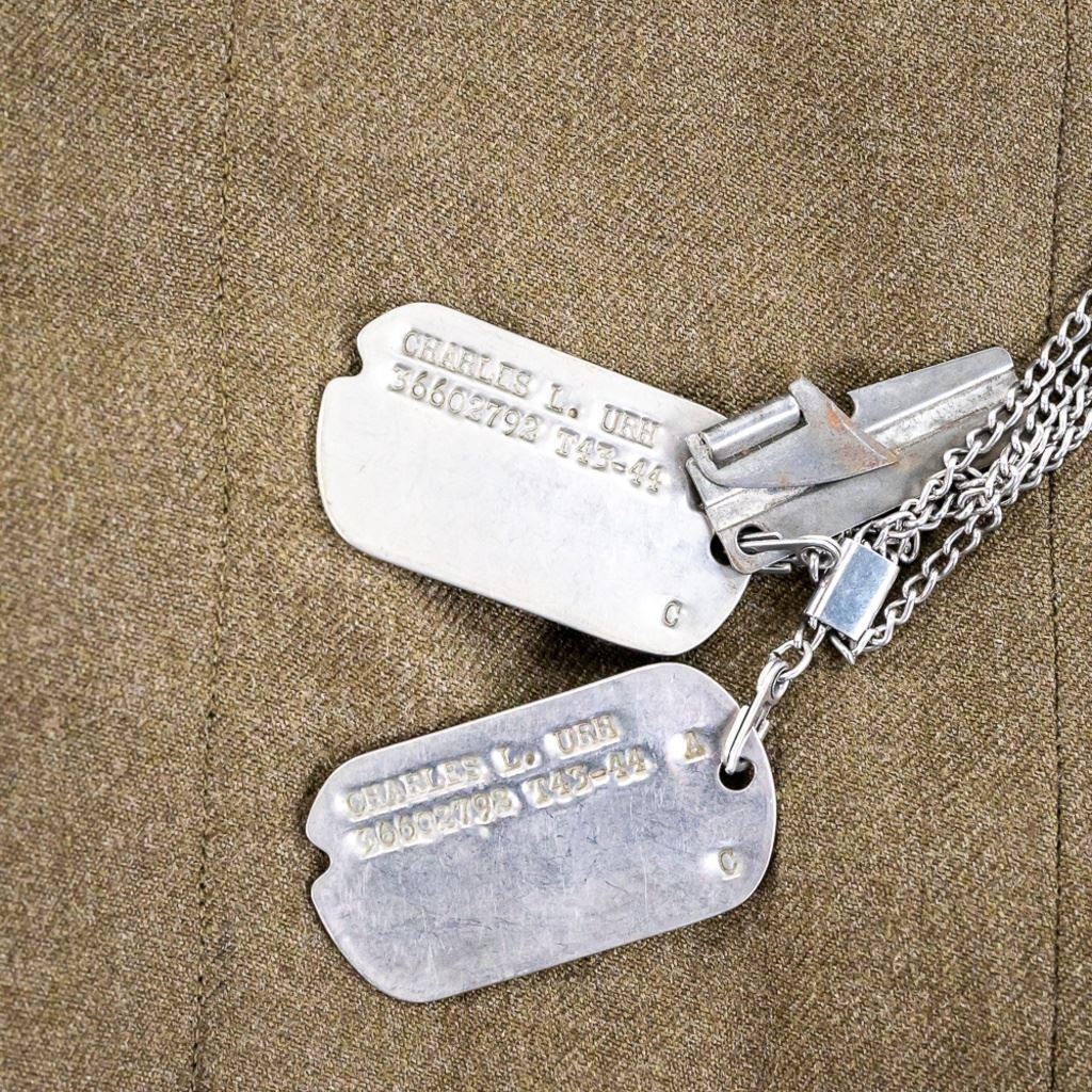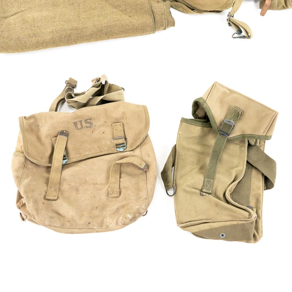 A grouping that is named to Charles Urh with his dog tags and part serial numbers and some of the gear. It includes Urh's Size 34L Ike jacket with 1st and 7th Army patches. 2 pairs of trousers W30xL33 and W32x31. 2 shirts with one with sergeant' chevron 15.5" x 33". Full size army blanket, 1944 dated ammo/grenade bag, 1942 date musette bag in poor condition, 1 pistol belt with very rusted Carlisle bandage in pouch. 1 pistol belt with 1944 dated canteen in 1918 dated cover, 1918 dated canteen in 1942 dated cover. 1941 dated shoulder backpack with 1944 dated mess kit with 3 rusted utensils. A lot of the brass, copper and steel fittings show corrosion and rust. This nice time capsule of one WWII Army veteran.