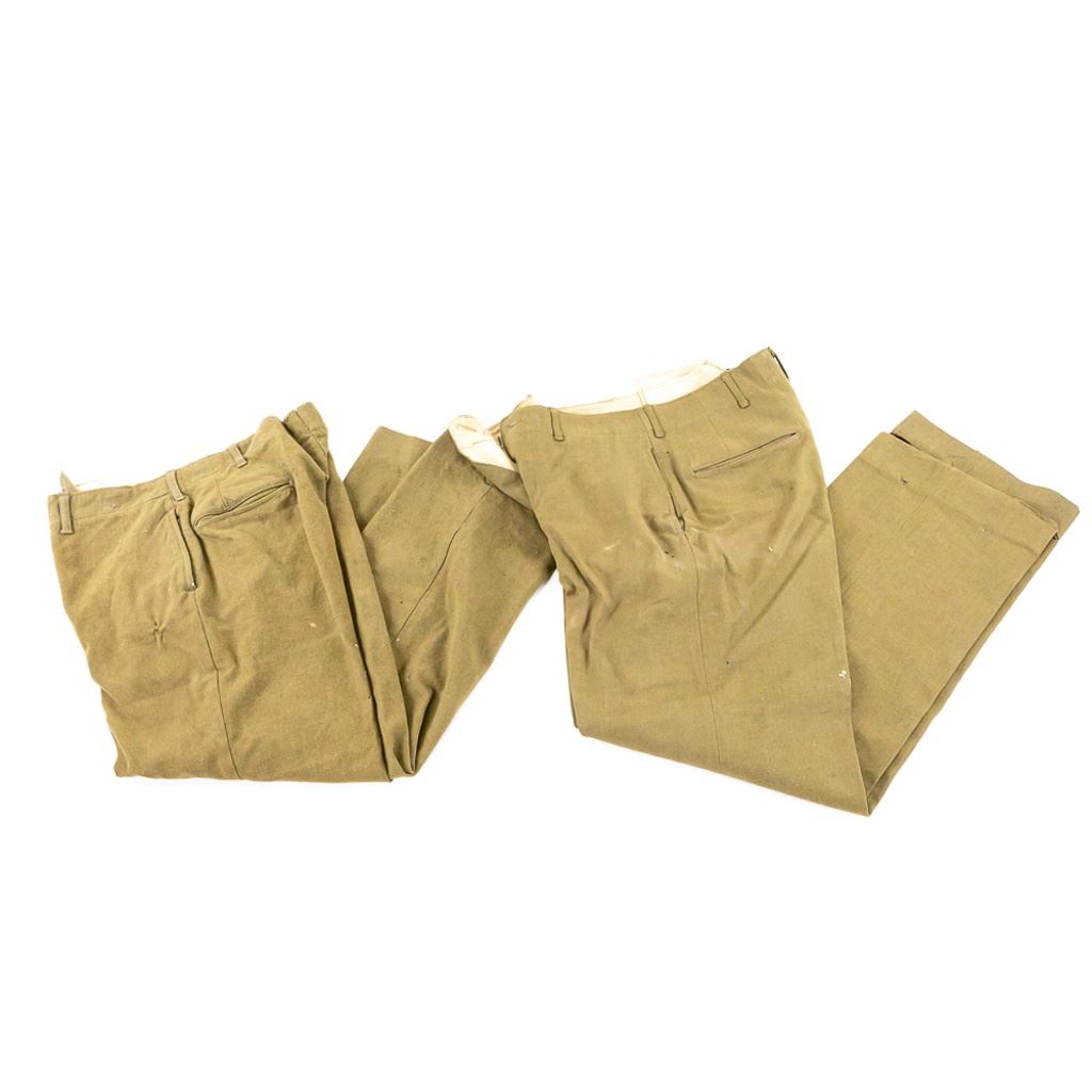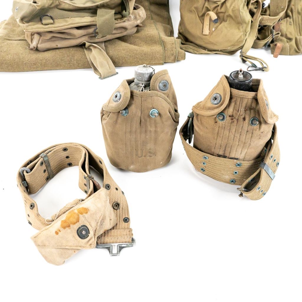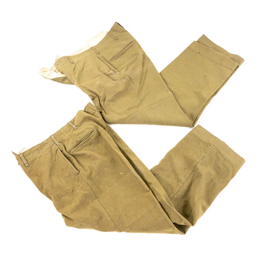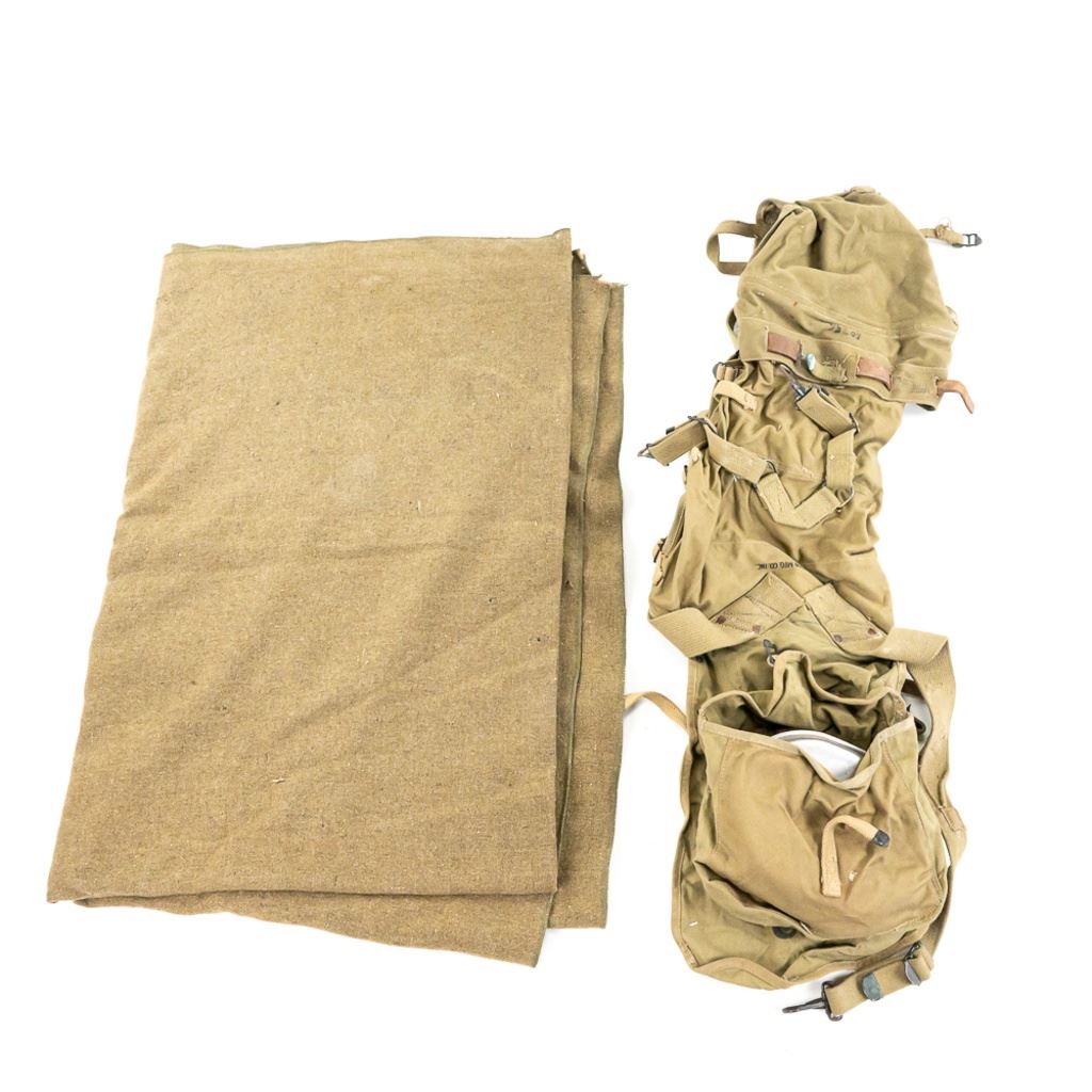 A grouping that is named to Charles Urh with his dog tags and part serial numbers and some of the gear. It includes Urh's Size 34L Ike jacket with 1st and 7th Army patches. 2 pairs of trousers W30xL33 and W32x31. 2 shirts with one with sergeant' chevron 15.5" x 33". Full size army blanket, 1944 dated ammo/grenade bag, 1942 date musette bag in poor condition, 1 pistol belt with very rusted Carlisle bandage in pouch. 1 pistol belt with 1944 dated canteen in 1918 dated cover, 1918 dated canteen in 1942 dated cover. 1941 dated shoulder backpack with 1944 dated mess kit with 3 rusted utensils. A lot of the brass, copper and steel fittings show corrosion and rust. This nice time capsule of one WWII Army veteran.