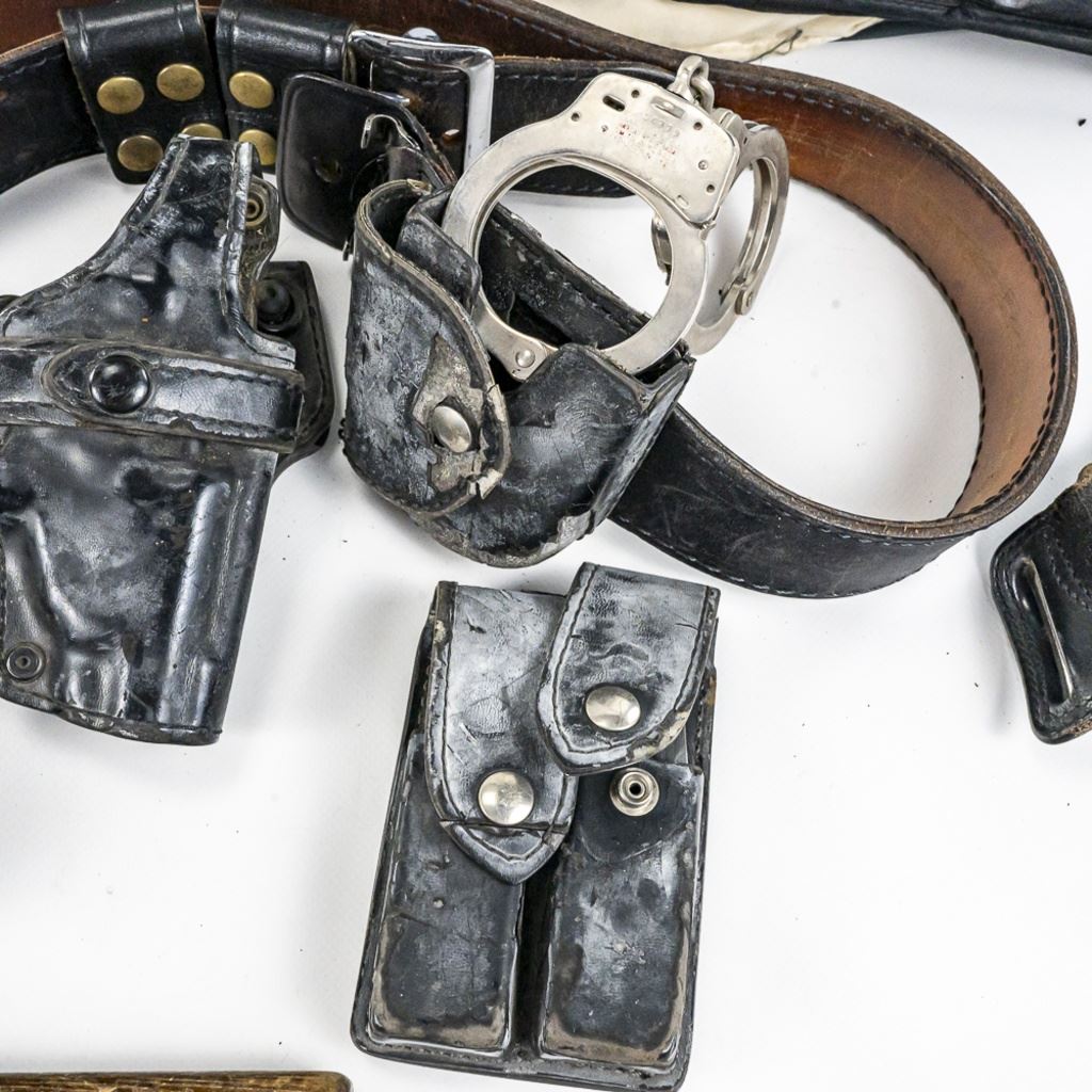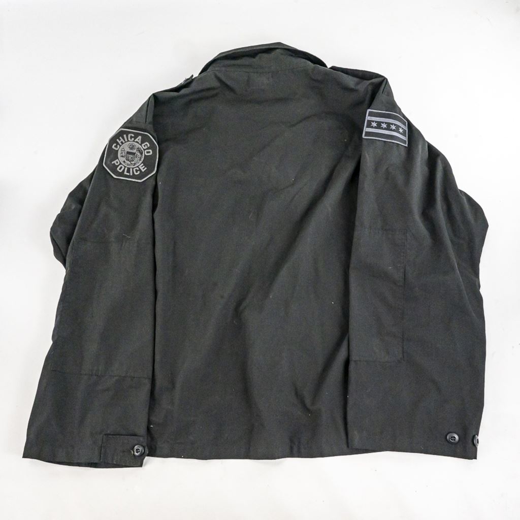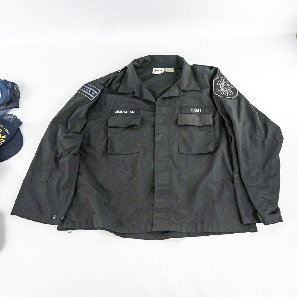 This obsolete uniform lot is from one retired Chicago Police officer from late 1990-2000 era. It includes his 1) private purchase XL Black ballistic vest with badge slot. Vest has front and back soft plates and is in poor to fair condition with much wear. 2) Black CPD satin jacket Size 52-54 XXL) 3) Black CPD tactical bottom shirt his stitched name and badge with number. Size XXXL 4-5) 2 CPD Visor hats with one with cap badge and his number Sizes 7.38. 6) Winter "Trooper" hat Size 7.38. 7) worn 23" wooden baton "Billy Club". 8) 2 CPD checkered bands for visor hat. 9-10) Two belt holster Galco 45 and poor condition 38 revolver. 11) Smith & Wesson Handcuffs with no key in pouch in poor but serviceable condition. 12) leather mace pouch 13) Gerber 650 locking blade knife with double mag pouch. 14-16) 3 leather snapping bands and 17) Poor condition gear belt in poor condition. The group came from a smoker's home. Look for the other Chicago Police Lot from same officer.