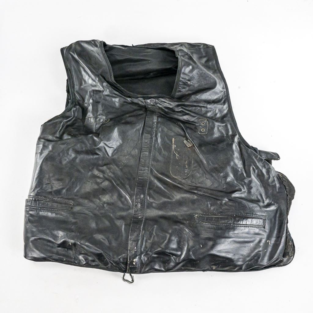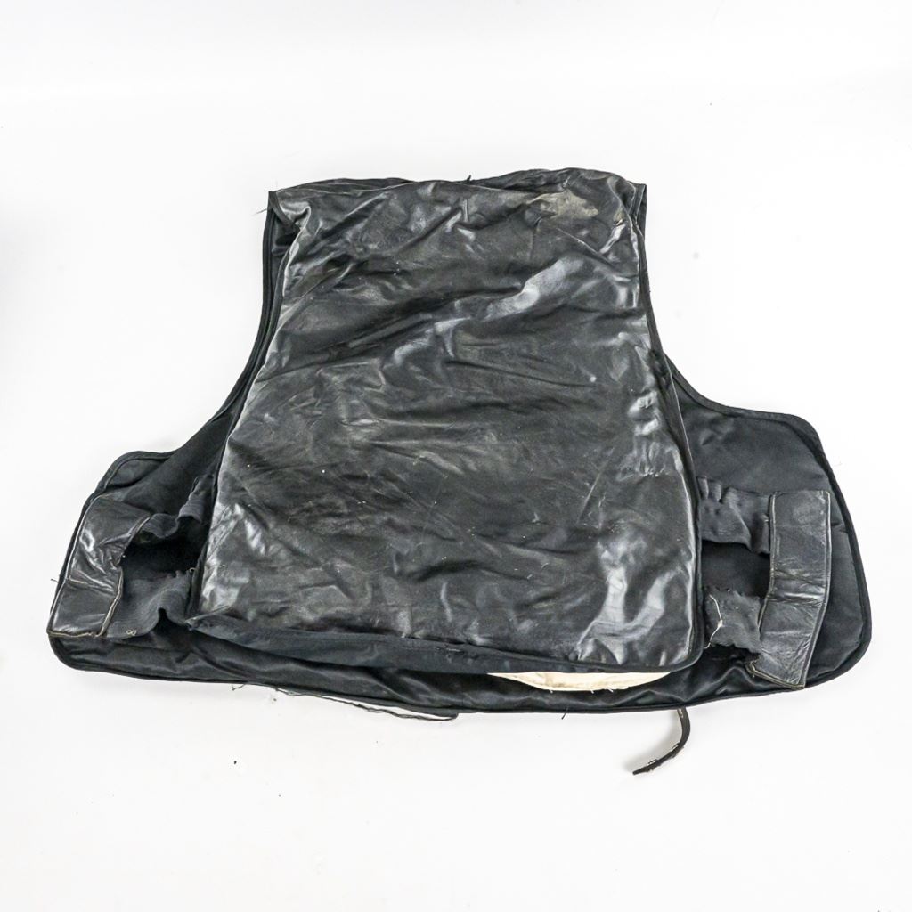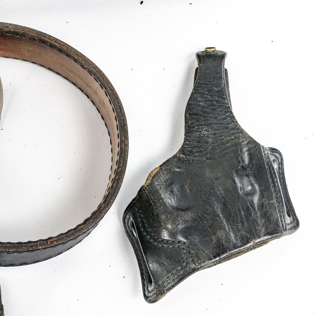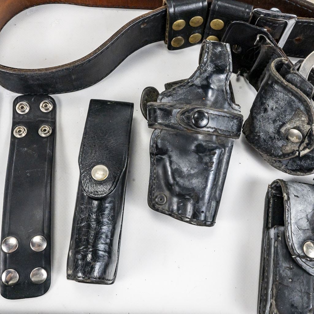This obsolete uniform lot is from one retired Chicago Police officer from late 1990-2000 era. It includes his 1) private purchase XL Black ballistic vest with badge slot. Vest has front and back soft plates and is in poor to fair condition with much wear. 2) Black CPD satin jacket Size 52-54 XXL) 3) Black CPD tactical bottom shirt his stitched name and badge with number. Size XXXL 4-5) 2 CPD Visor hats with one with cap badge and his number Sizes 7.38. 6) Winter "Trooper" hat Size 7.38. 7) worn 23" wooden baton "Billy Club". 8) 2 CPD checkered bands for visor hat. 9-10) Two belt holster Galco 45 and poor condition 38 revolver. 11) Smith & Wesson Handcuffs with no key in pouch in poor but serviceable condition. 12) leather mace pouch 13) Gerber 650 locking blade knife with double mag pouch. 14-16) 3 leather snapping bands and 17) Poor condition gear belt in poor condition. The group came from a smoker's home. Look for the other Chicago Police Lot from same officer.