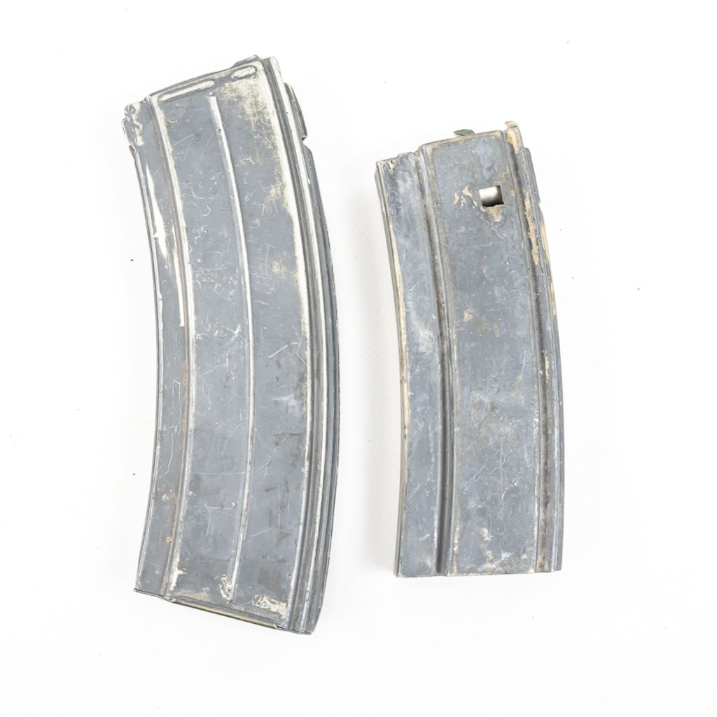 The very rare prototype 30? round magazine was part of the Special Purpose Individual Weapon (SPIW) program are started by the AAI Corporation in the in the 1960s to replace the M16. The SPIW program came up with the prototype XM19 Flechette Rifle. Very few rifles were made and very few of their 30? round magazines. This magazine is serial numbered 230 and it is our opinion that may be only 5 to 20 rifles in existences and thus very few magazines. It is fair condition and shows much wear and age. The follower is stuck at the top of the mag and won't push down and it has no spring. For the collectors that have one of the few weapons left, this is a golden opportunity. Also as a bonus is included a 7" prototype with no magazine bottom and numbered "3".