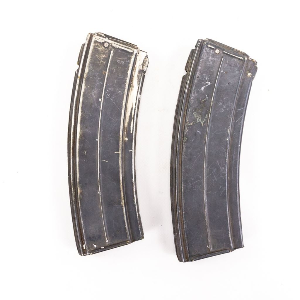 Two very rare prototype 30? round magazines were part of the Special Purpose Individual Weapon (SPIW) program are started by the AAI Corporation in the in the 1960s to replace the M16. The SPIW program came up with the prototype XM19 Flechette Rifle. Very few rifles were made and very few of their 30? round magazines. These are both the same and are numbered 135 and 195 respectfully. and it is our opinion that may be only 5 to 20 rifles in existence and thus very few magazines exist. It is fair condition and shows much wear and age. The follower is stuck at the top of the mag and won't push down and it has no spring. The family of Jim Geibel authorized Donley Auctions to release these two magazines for auction.