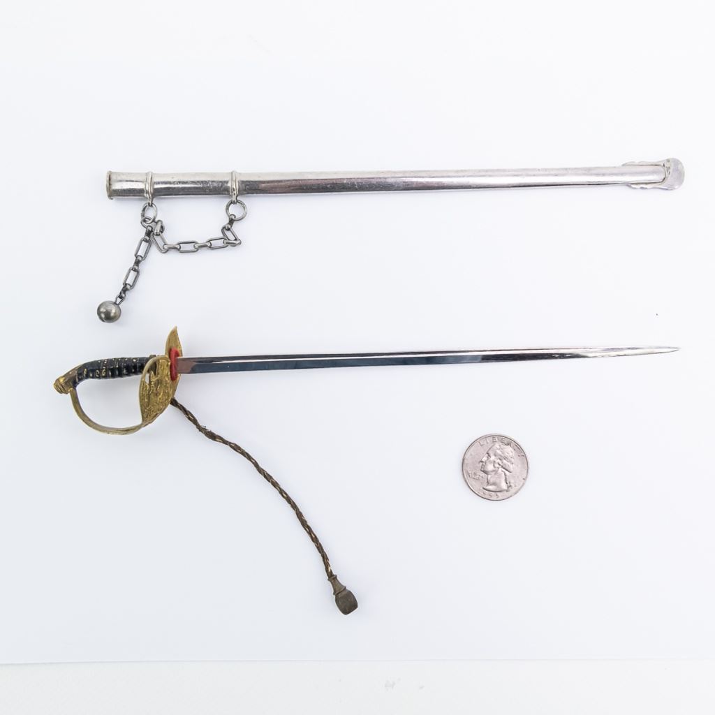 Miniature sword was most likely made in the post WWI period to Nazi era. It is 9.75" L and in very good condition. It does have some black painted grip and the portepee shows age. The unmarked blade is very bright with some minor in/out wear and has no flaking to the chrome. The detail on the crossguard is very good and hanger chain is present with an unusual steel ball at end of hanger.