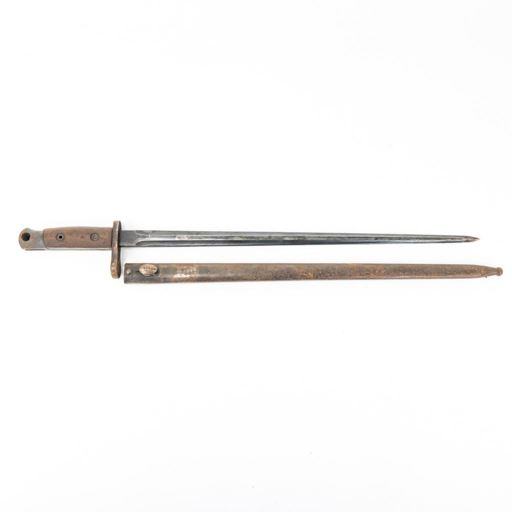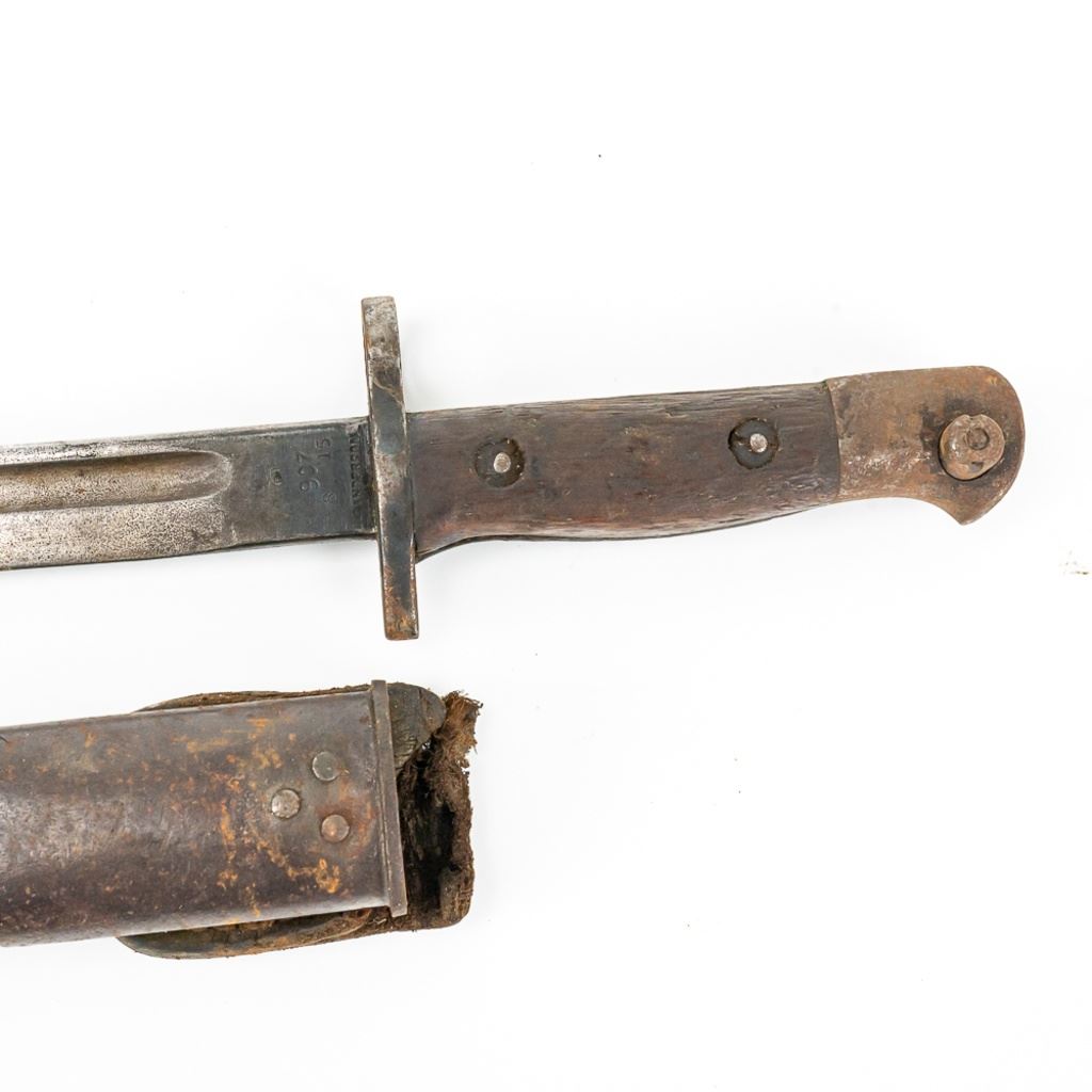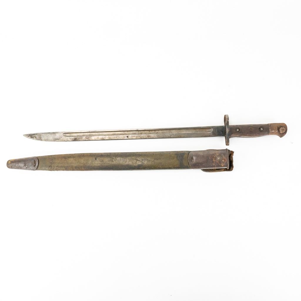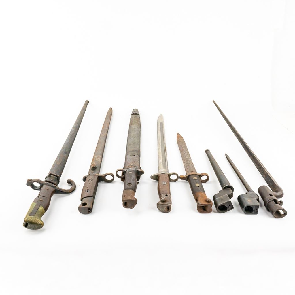 8 bayonets includes: Belgium M1916 bayonet missing lug button, French Gras Bayonet dated 1878 with unnumbered scabbard and carved name on handle, British Martini-Henry bayonet 25" with 21.25" blade. 2 British 1907 bayonets, Wilkinson and Anderson, one with US made scabbard, 2 British No. 4 Mk II spike bayonets and 1 British M1888 Lee-Metford and Long Lee-Enfield rifle bayonet with many markings. All of these bayonets are covered with surface rust from poor storage. They all need oil and a good cloth.