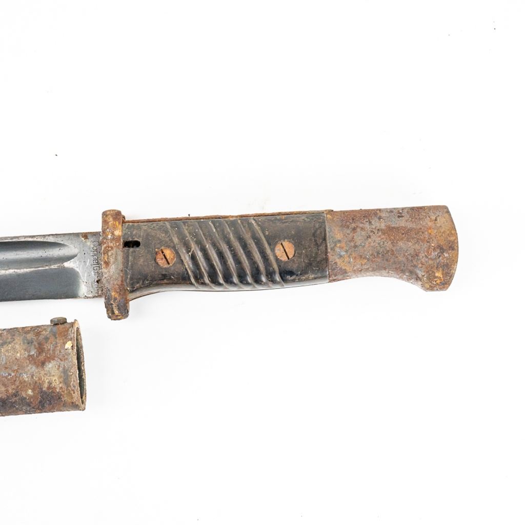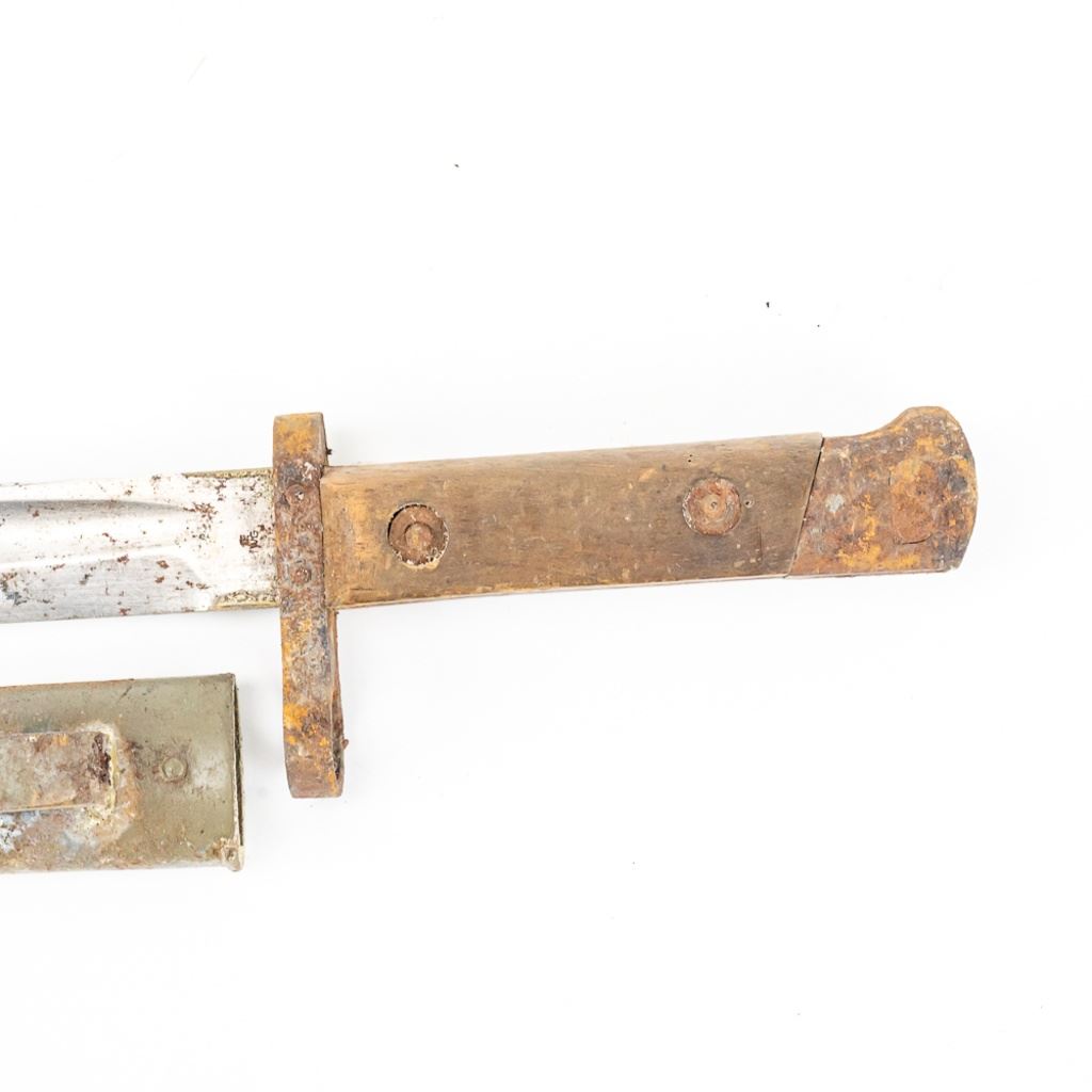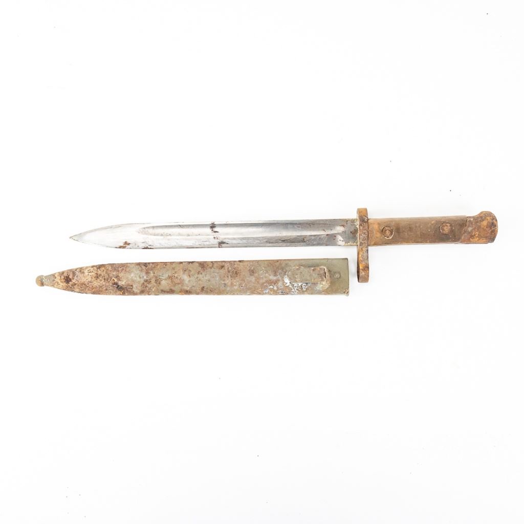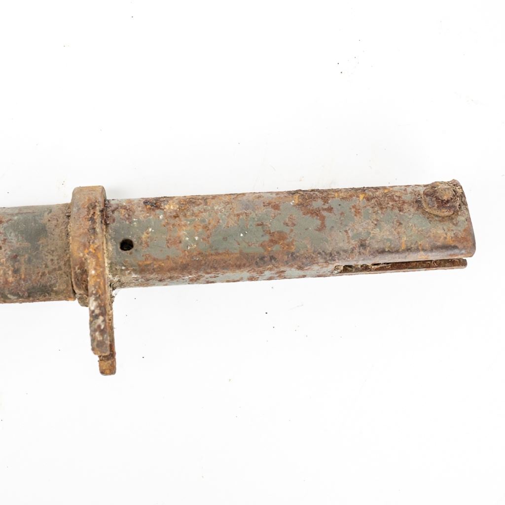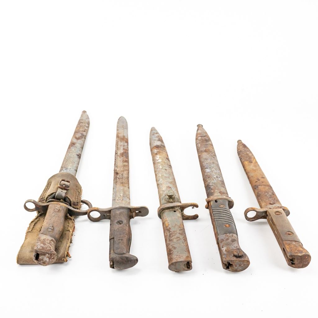 5 very rusty yet very cool bayonets that are still collectable. The lug buttons are frozen. 1) US 1918 dated Springfield bayonet with frozen lug lock. 2) 1938 dated German Koppel k98 bayonet with decent blade. 3) WWII Japanese Type 30 with Tokyo arsenal mark and frog. Blade is OK. Frog is hard. 4) WWI German Ersatz Mauser bayonet. You can still see the German Field Green paint under the rust. Blade is stuck in scabbard. 5) WWI Austrian M1895 bayonet with decent blade and well marked. All these bayonets were stored improperly for a while and need some attention from a collector.