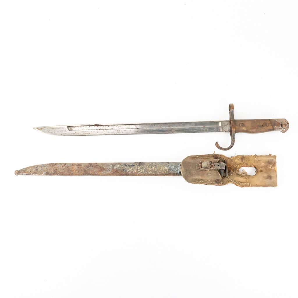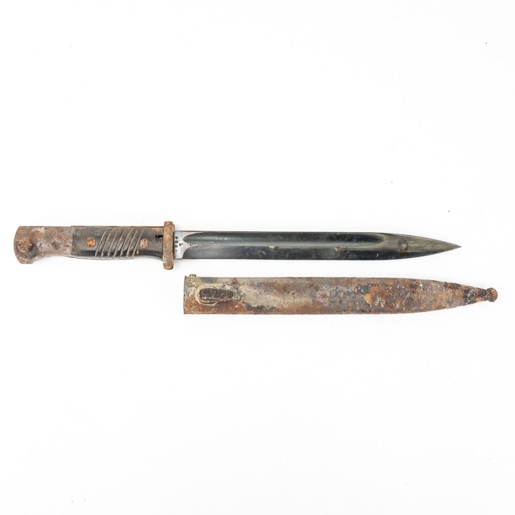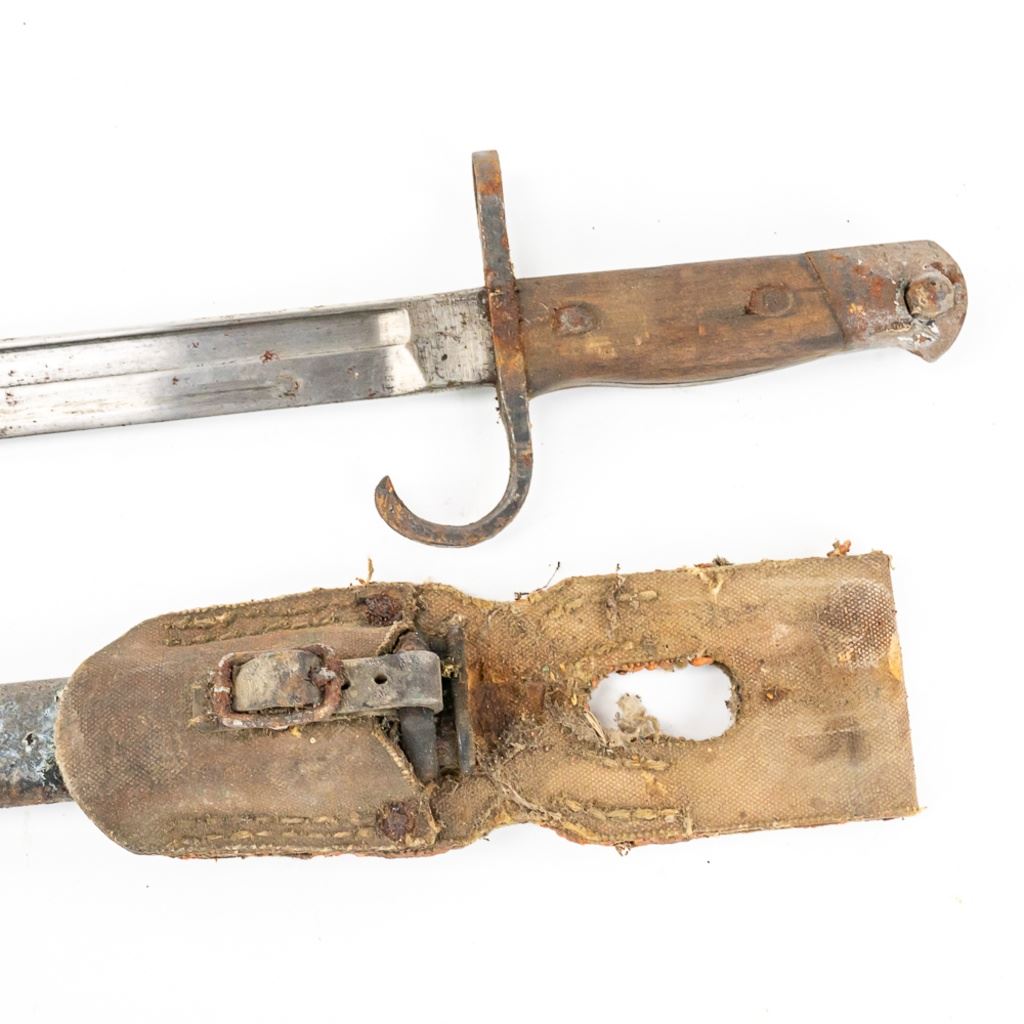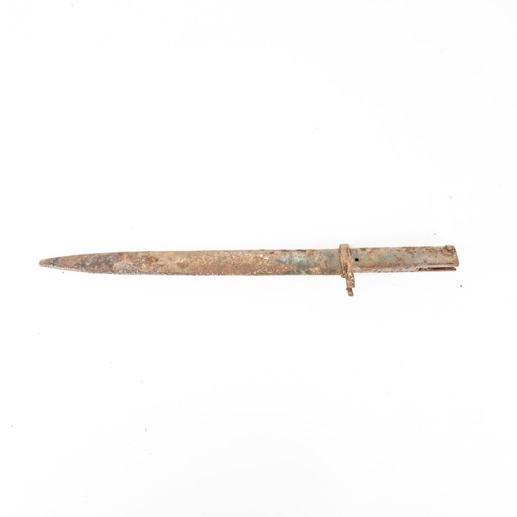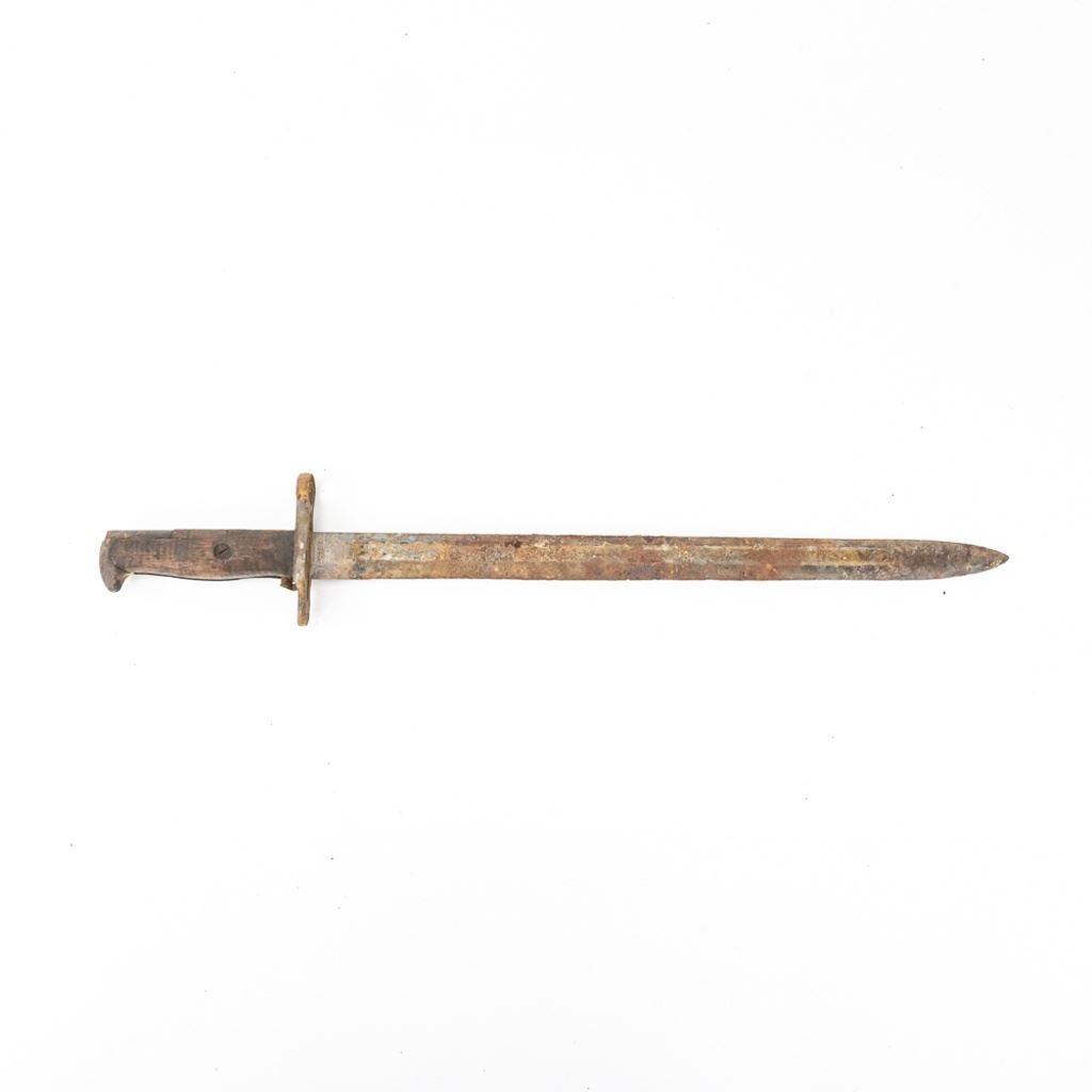 5 very rusty yet very cool bayonets that are still collectable. The lug buttons are frozen. 1) US 1918 dated Springfield bayonet with frozen lug lock. 2) 1938 dated German Koppel k98 bayonet with decent blade. 3) WWII Japanese Type 30 with Tokyo arsenal mark and frog. Blade is OK. Frog is hard. 4) WWI German Ersatz Mauser bayonet. You can still see the German Field Green paint under the rust. Blade is stuck in scabbard. 5) WWI Austrian M1895 bayonet with decent blade and well marked. All these bayonets were stored improperly for a while and need some attention from a collector.