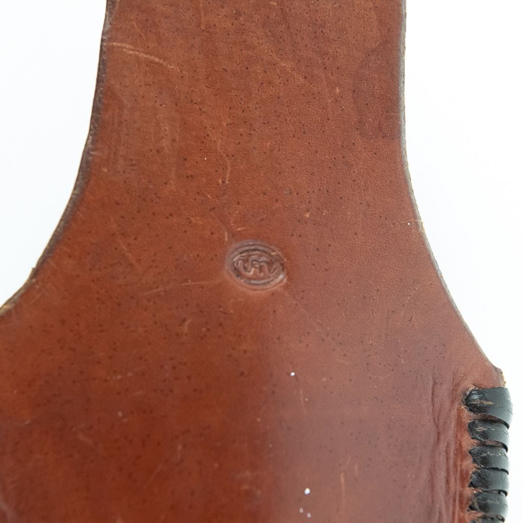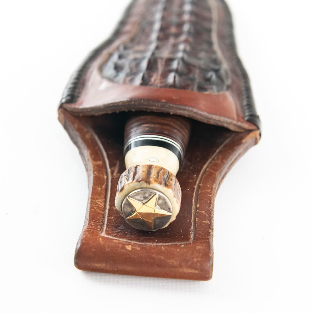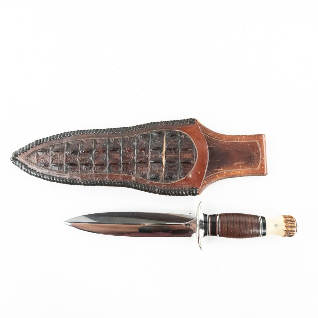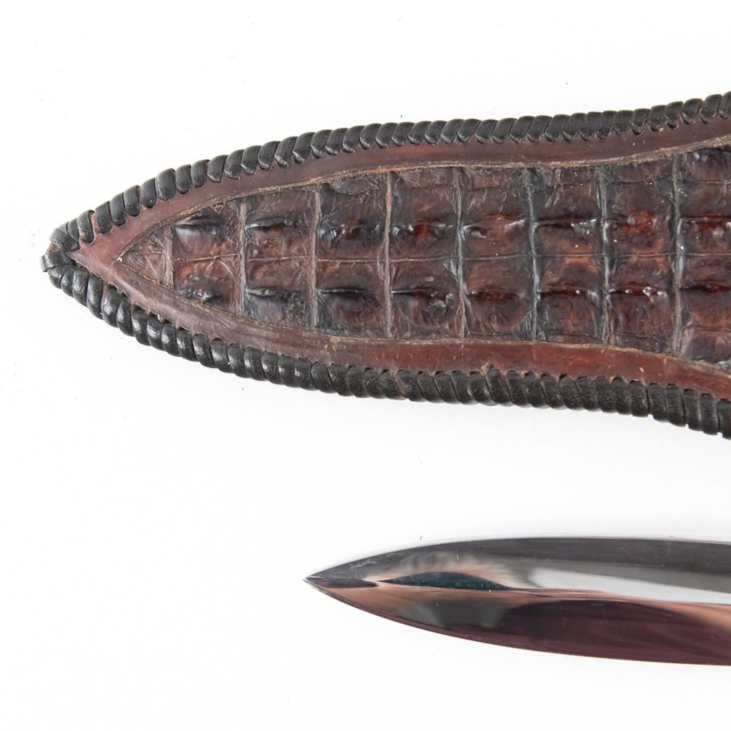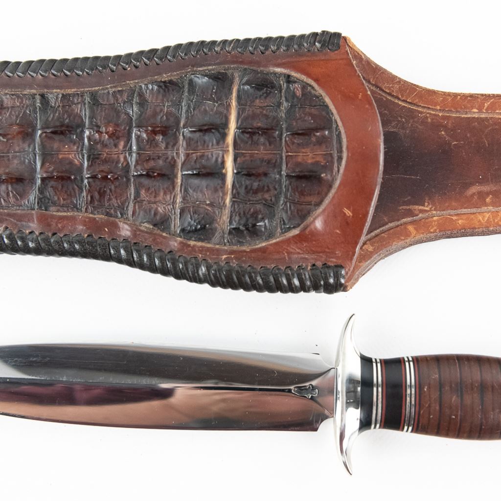 Jerry Van Eizenga "Scagel Fighter" Knife with an alligator skin sheath in excellent condition with VERY minor marks. Made of 5160 carbon steel blade and nickel silver "BLADE" magazine article included.