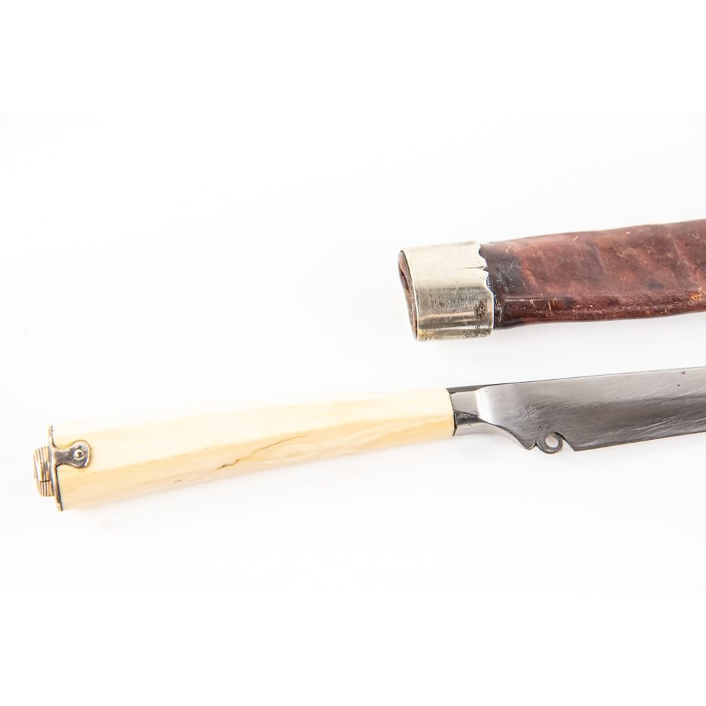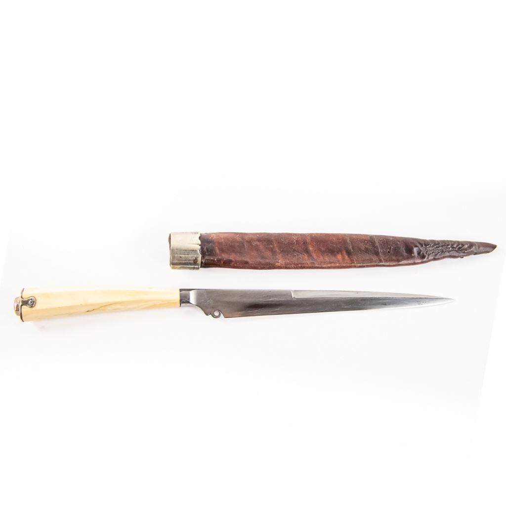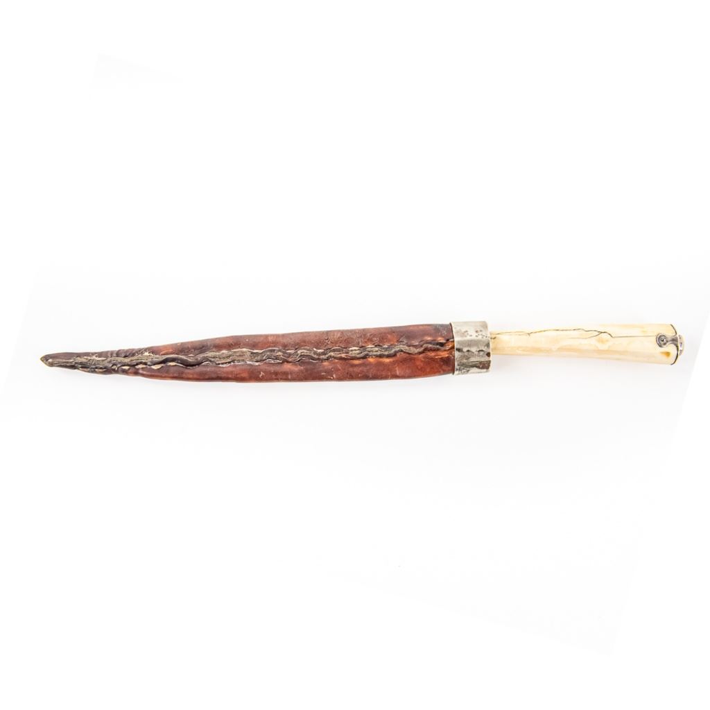 A Chuck Patrick made knife with dagger blade and has Patrick logo on blade. Handle is made of horn or warthog tusk. Blade is 7" and 12.75" overall. Handle has hairline crack - it may have been made that way. The blade shows a lot of cross graining. Has 9" leather sheath polished steel throat. An outstanding knife that comes with 2006 Knife World newspaper article about Chuck Patrick.