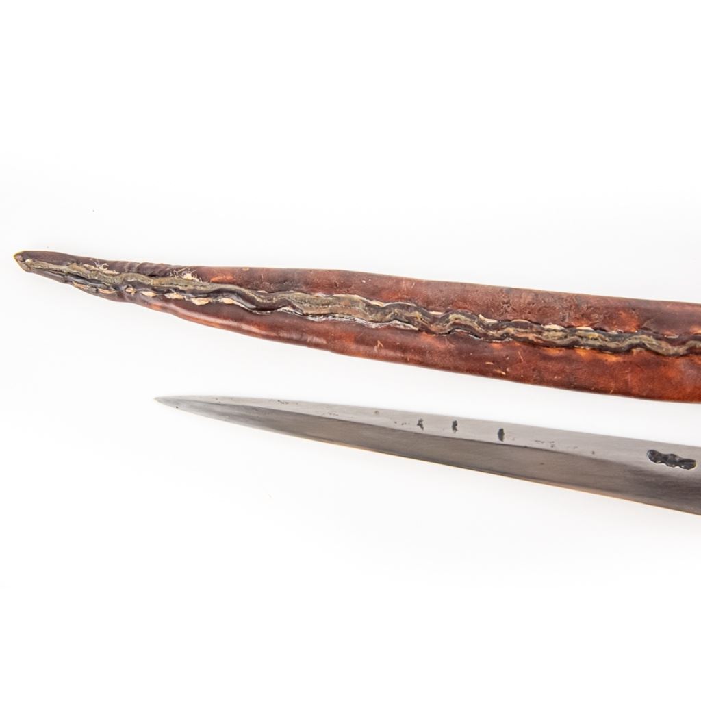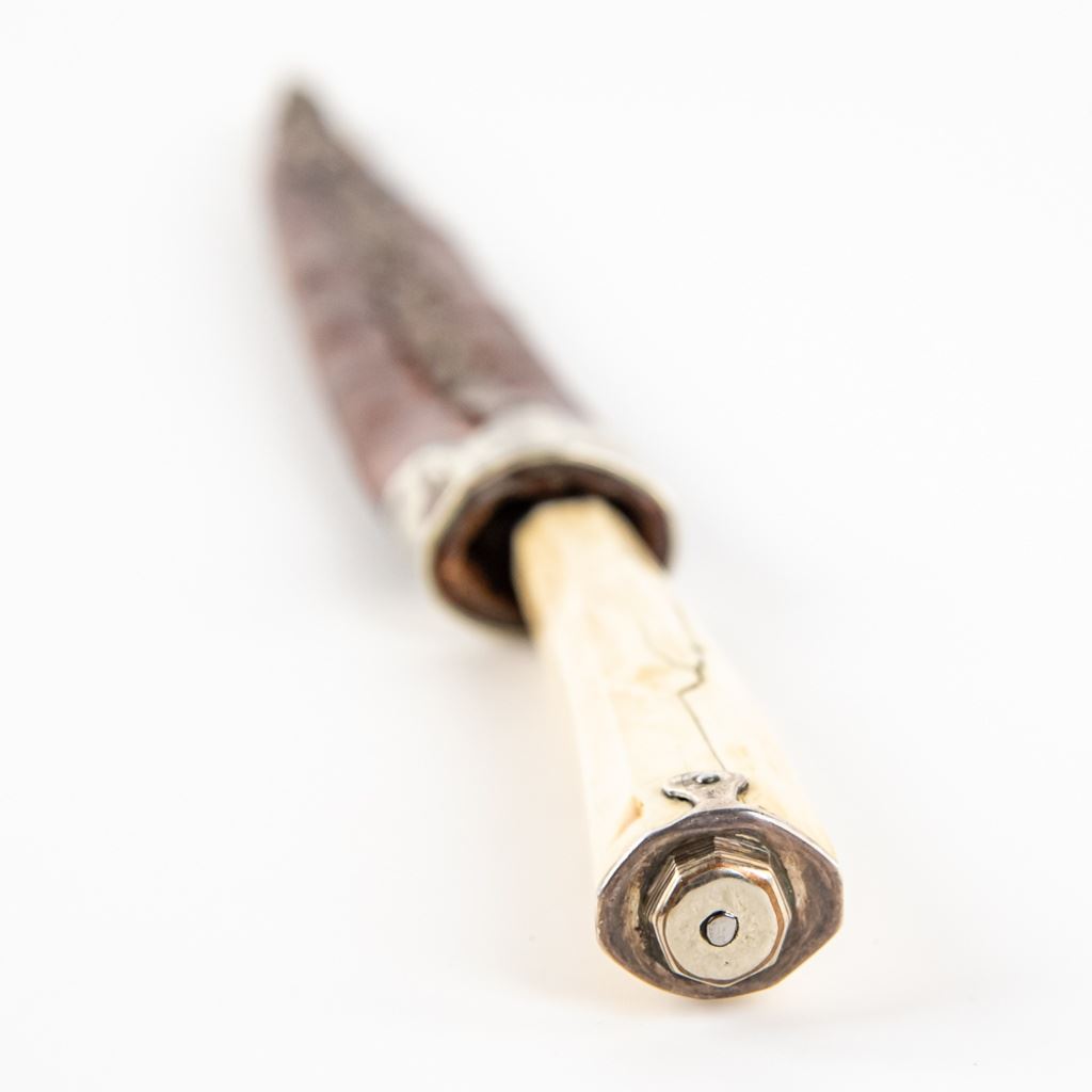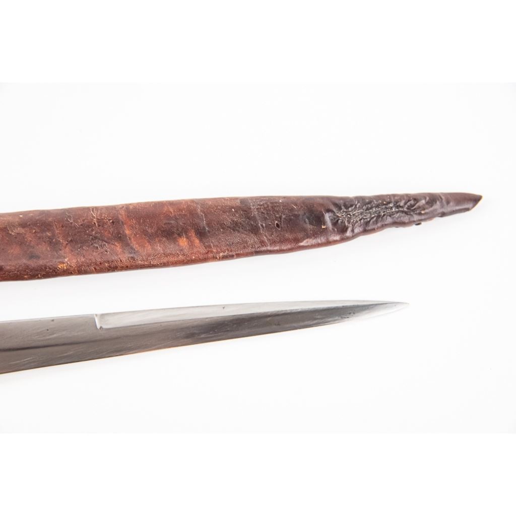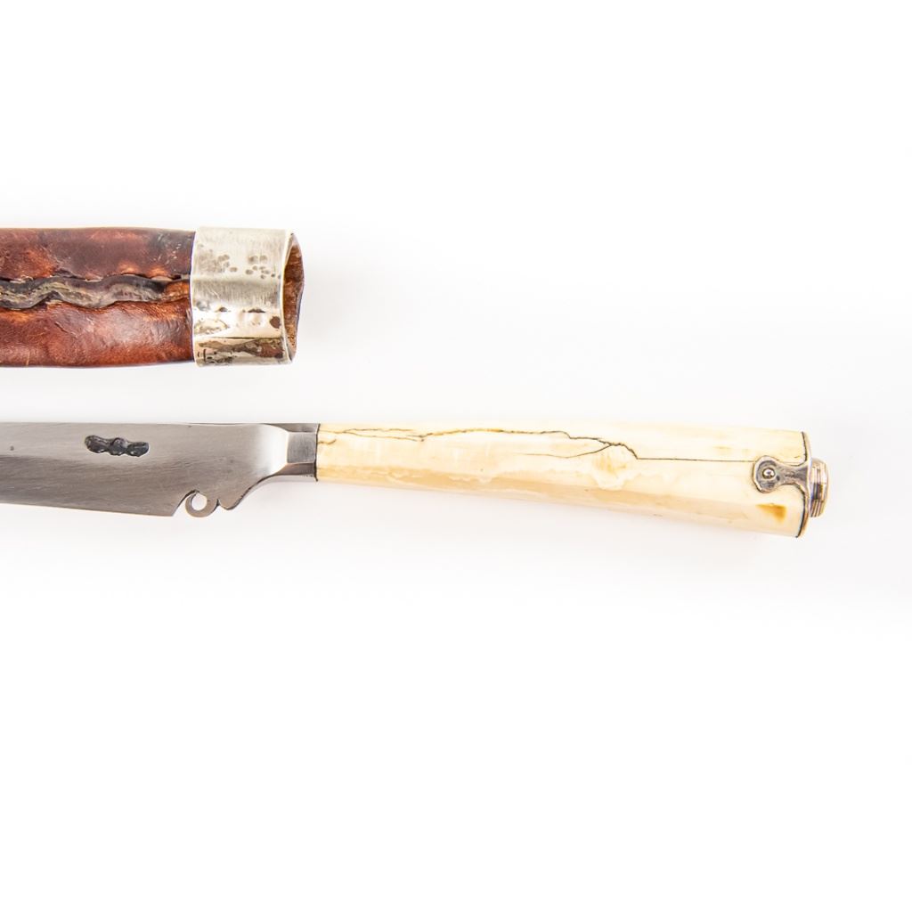 A Chuck Patrick made knife with dagger blade and has Patrick logo on blade. Handle is made of horn or warthog tusk. Blade is 7" and 12.75" overall. Handle has hairline crack - it may have been made that way. The blade shows a lot of cross graining. Has 9" leather sheath polished steel throat. An outstanding knife that comes with 2006 Knife World newspaper article about Chuck Patrick.