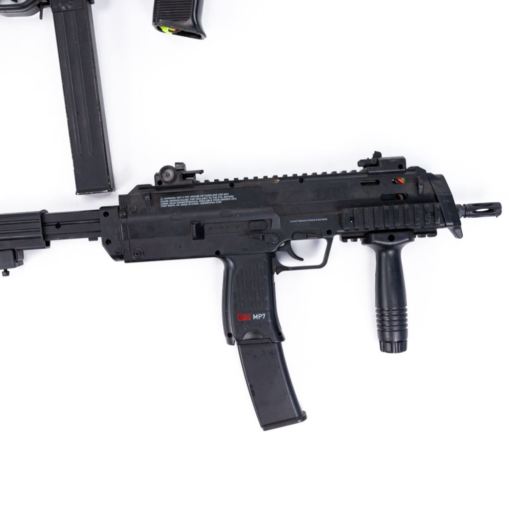 1 Full Metal Beretta M212 by S&T. 1 SITES SPECTRE, 1 HK MP-7. All of these Airsoft guns were used as movie and television props so are worn and/or missing parts. All are untested and sold as display/costume items only. Very nice display group of video game guns for man cave. See photos.
