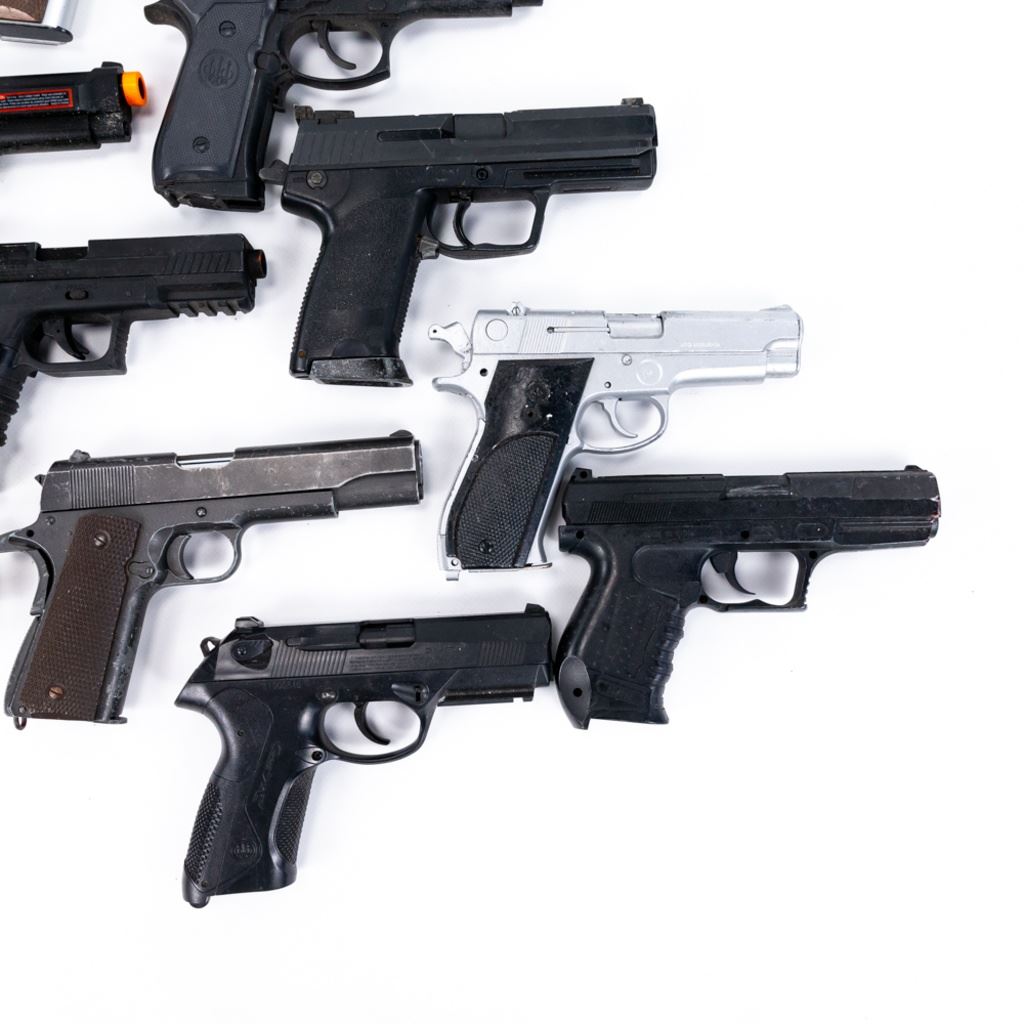 15 assorted Airsoft movie prop handguns. These Airsoft guns were all movie and television props and are worn and/or missing parts. They are all untested and sold as display or costume items only. Great display items for your mancave. See photos.
