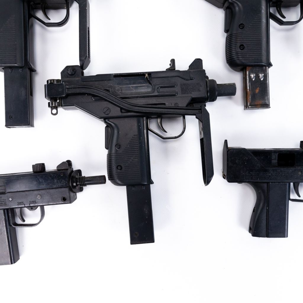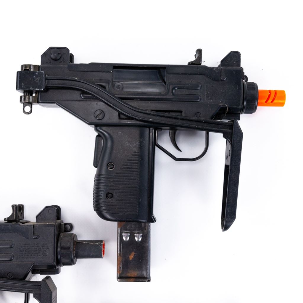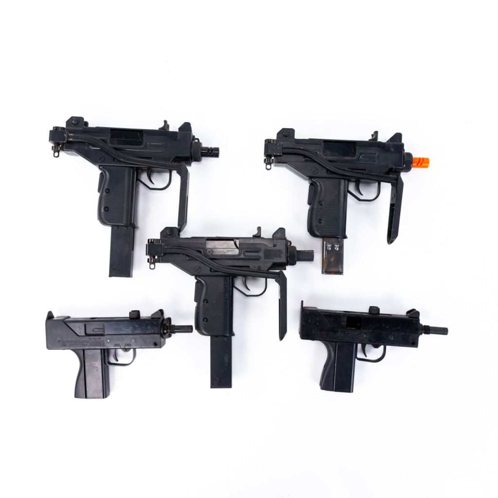 3 Micro UZI and 2 MAC-11 Airsoft replica guns. These Airsoft guns were used as movie and television props so are worn and dinged and may be missing pieces. lot also includes 1 real UZI magazine stuck in one of the airsoft guns. All are untested and sold as costume or display items only. See Photos.