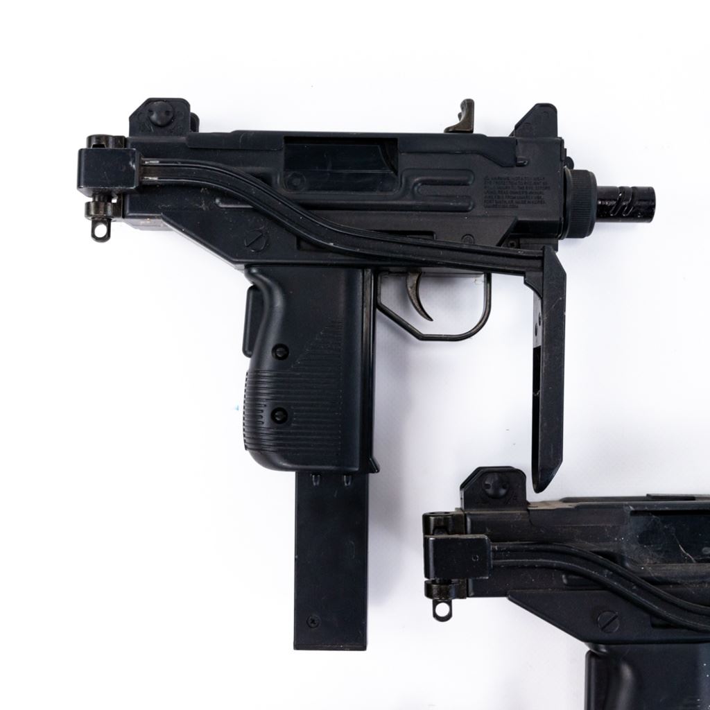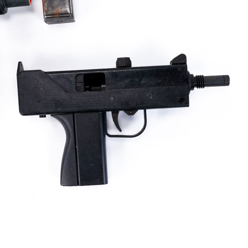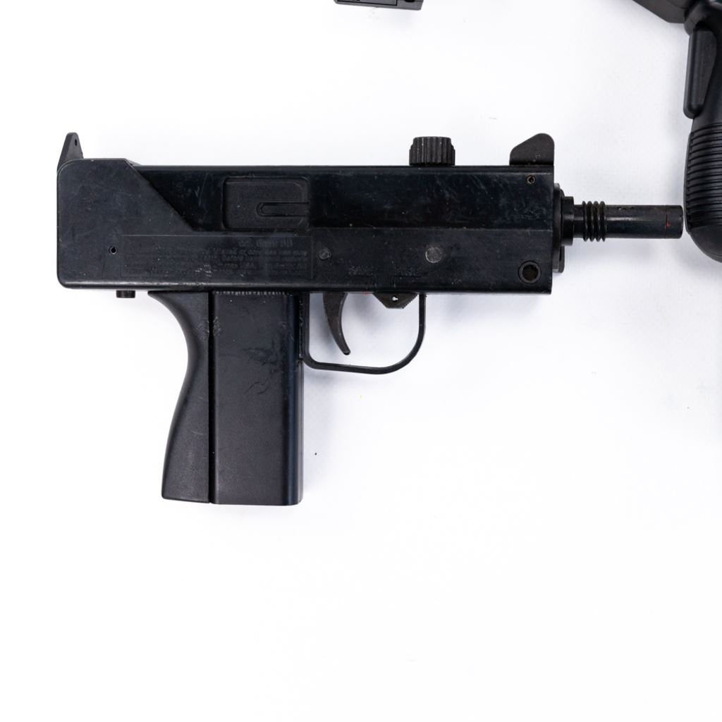 3 Micro UZI and 2 MAC-11 Airsoft replica guns. These Airsoft guns were used as movie and television props so are worn and dinged and may be missing pieces. lot also includes 1 real UZI magazine stuck in one of the airsoft guns. All are untested and sold as costume or display items only. See Photos.