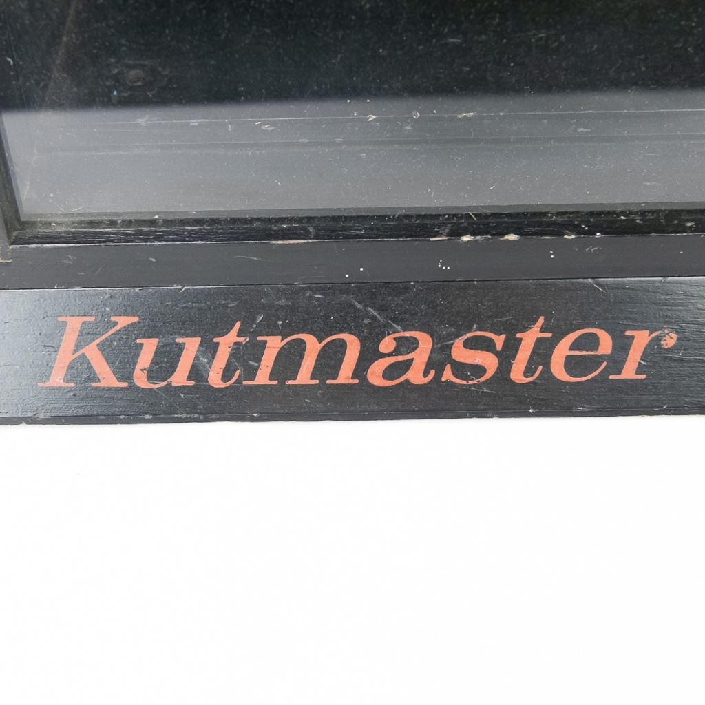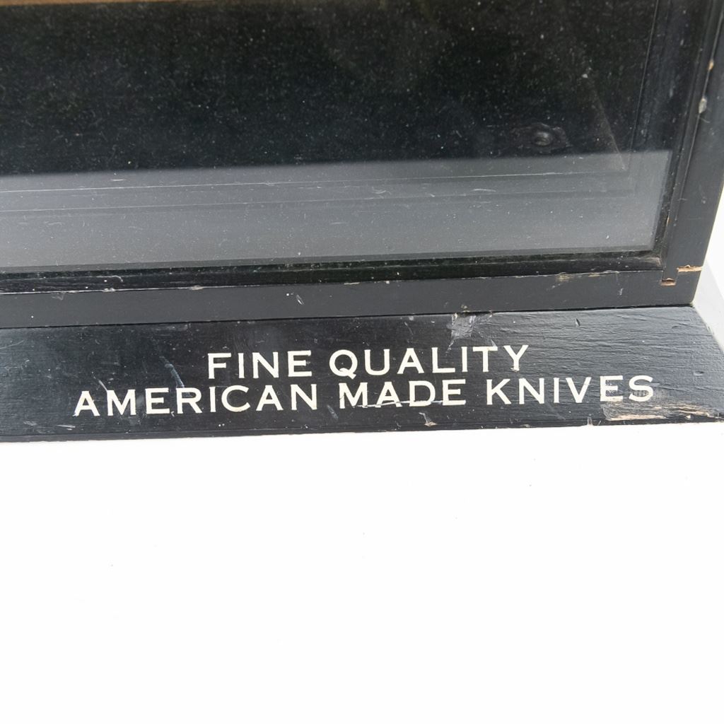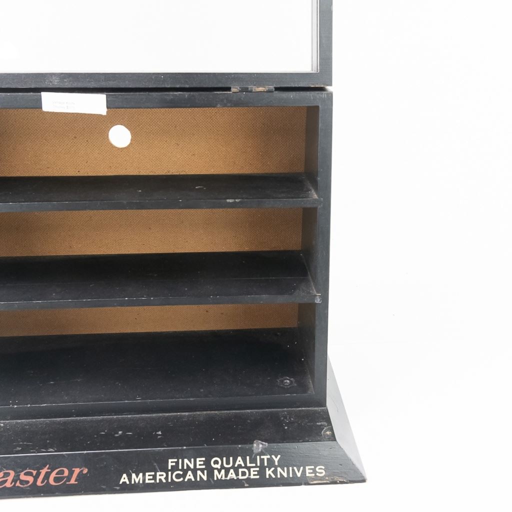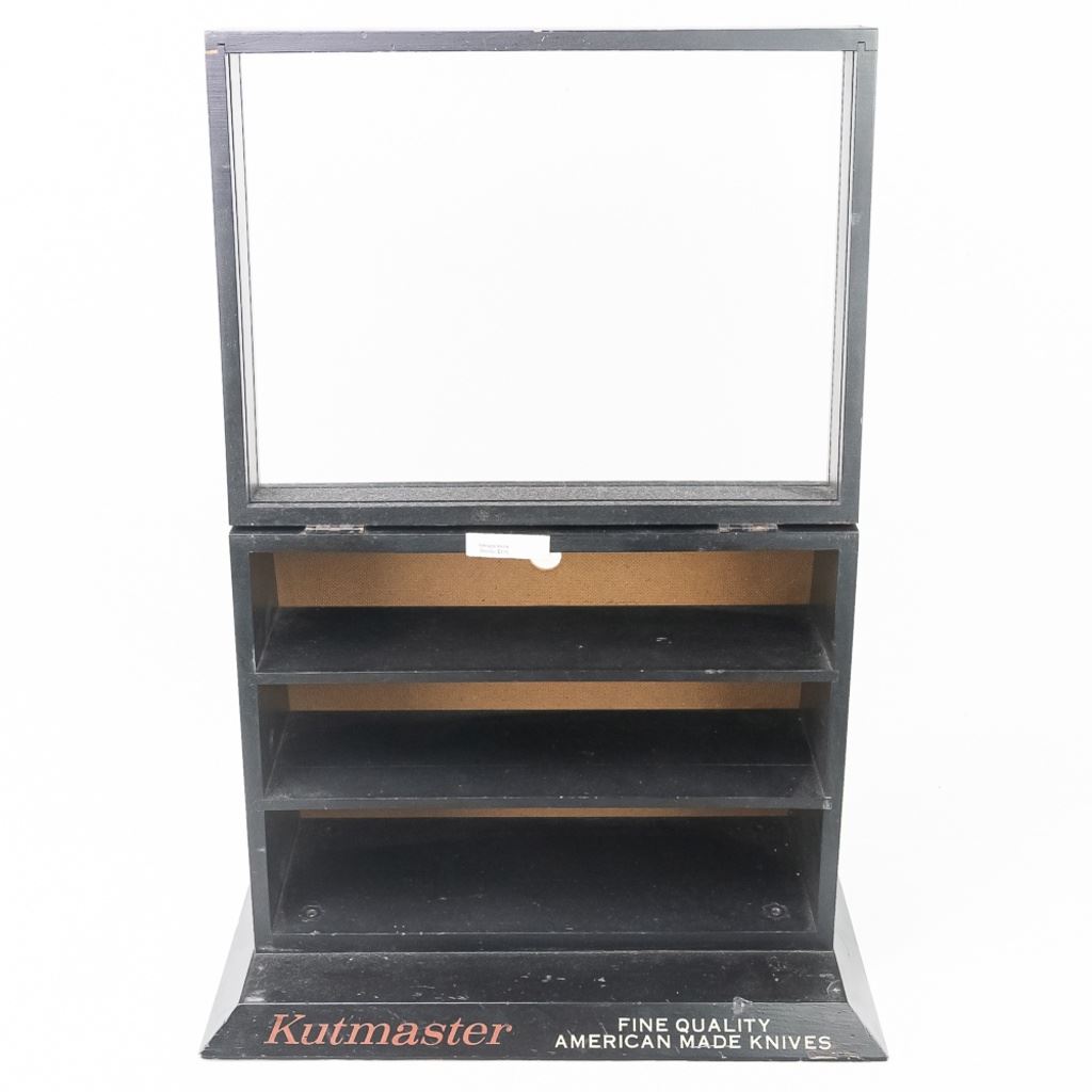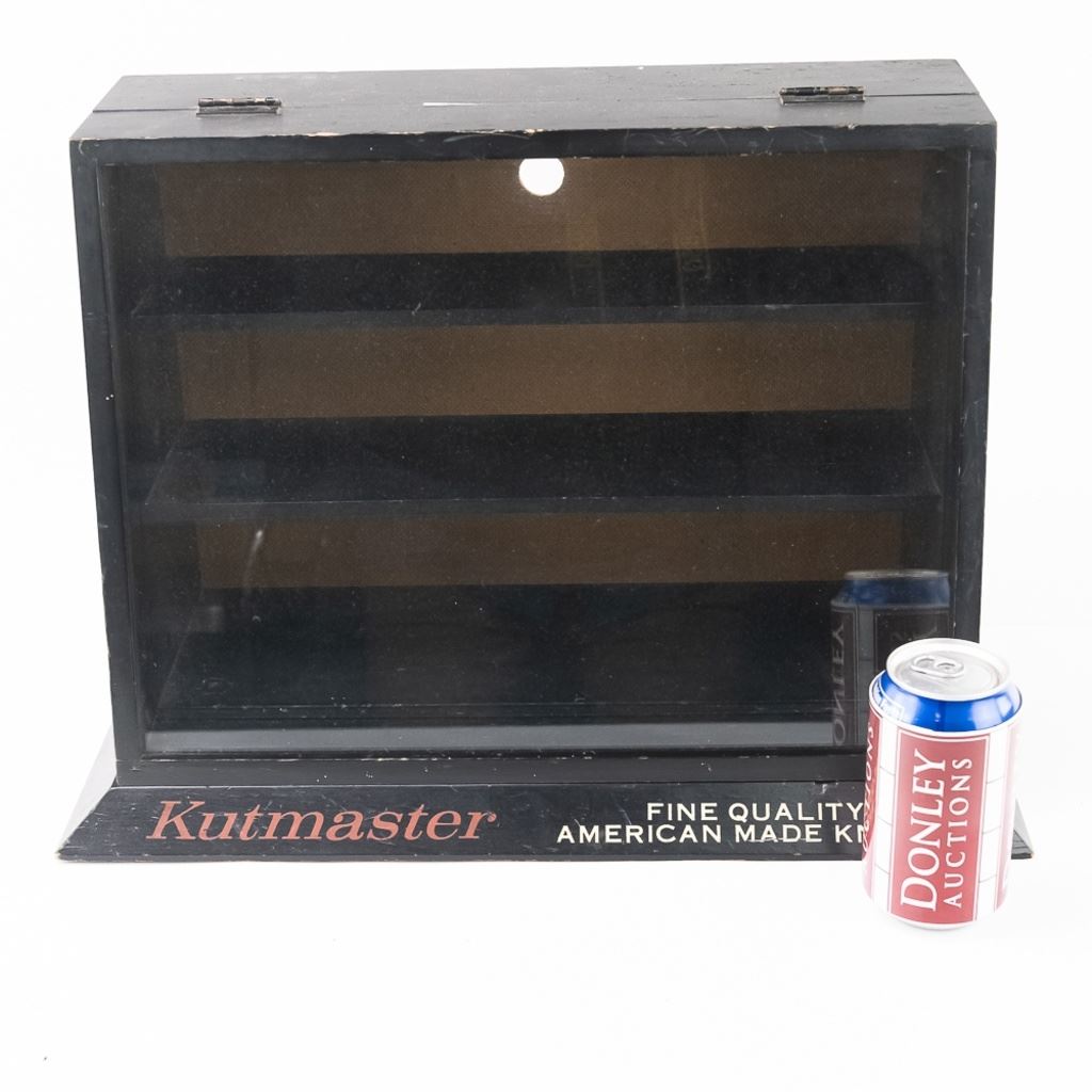 Vintage Kutmaster "Fine Quality American Made Knives" store display. Front display window opens in addition to the rear panel sliding up for access. Good overall condition with minor wear noted such as dings, chips and small areas of missing paint. Please use photos to judge condition and bid accordingly. Approximately 18.5"L x 9"W x 13.25"T.