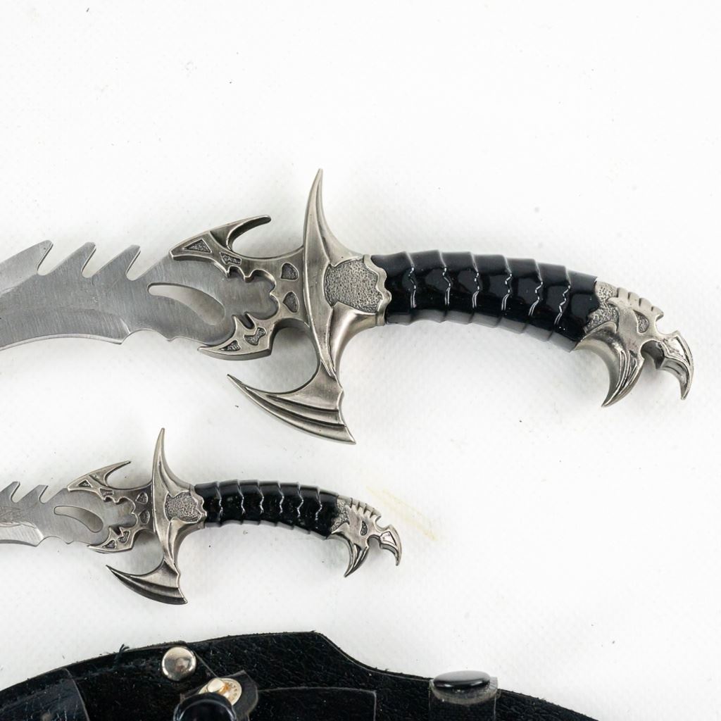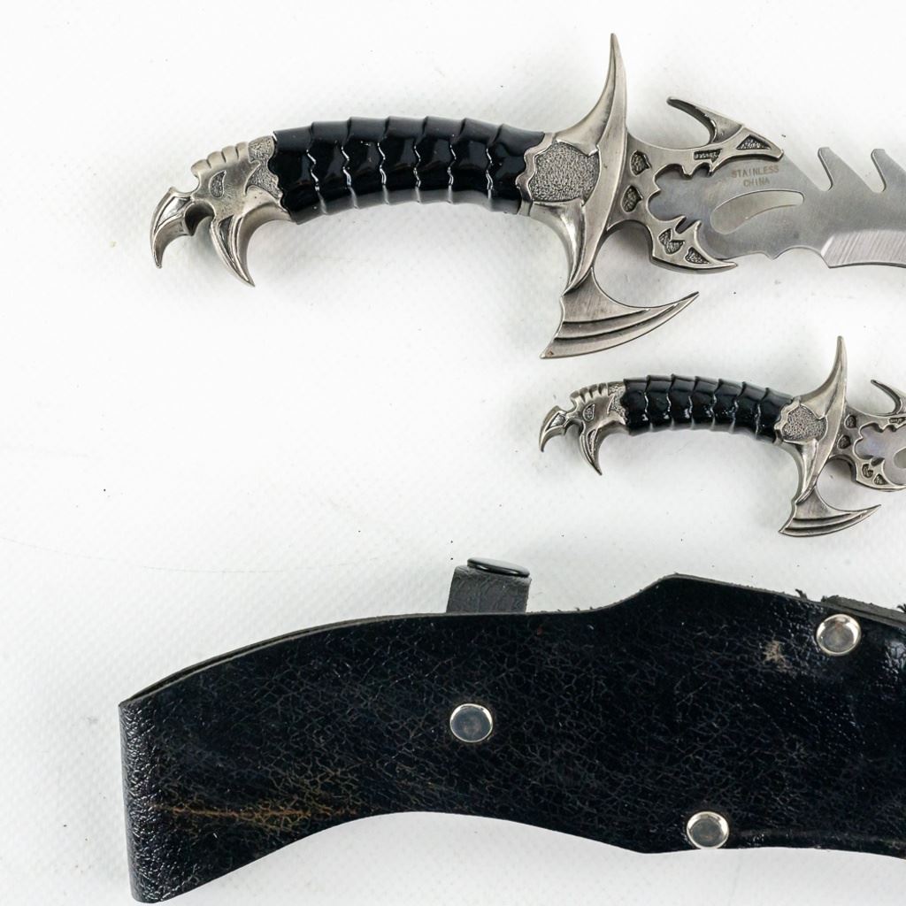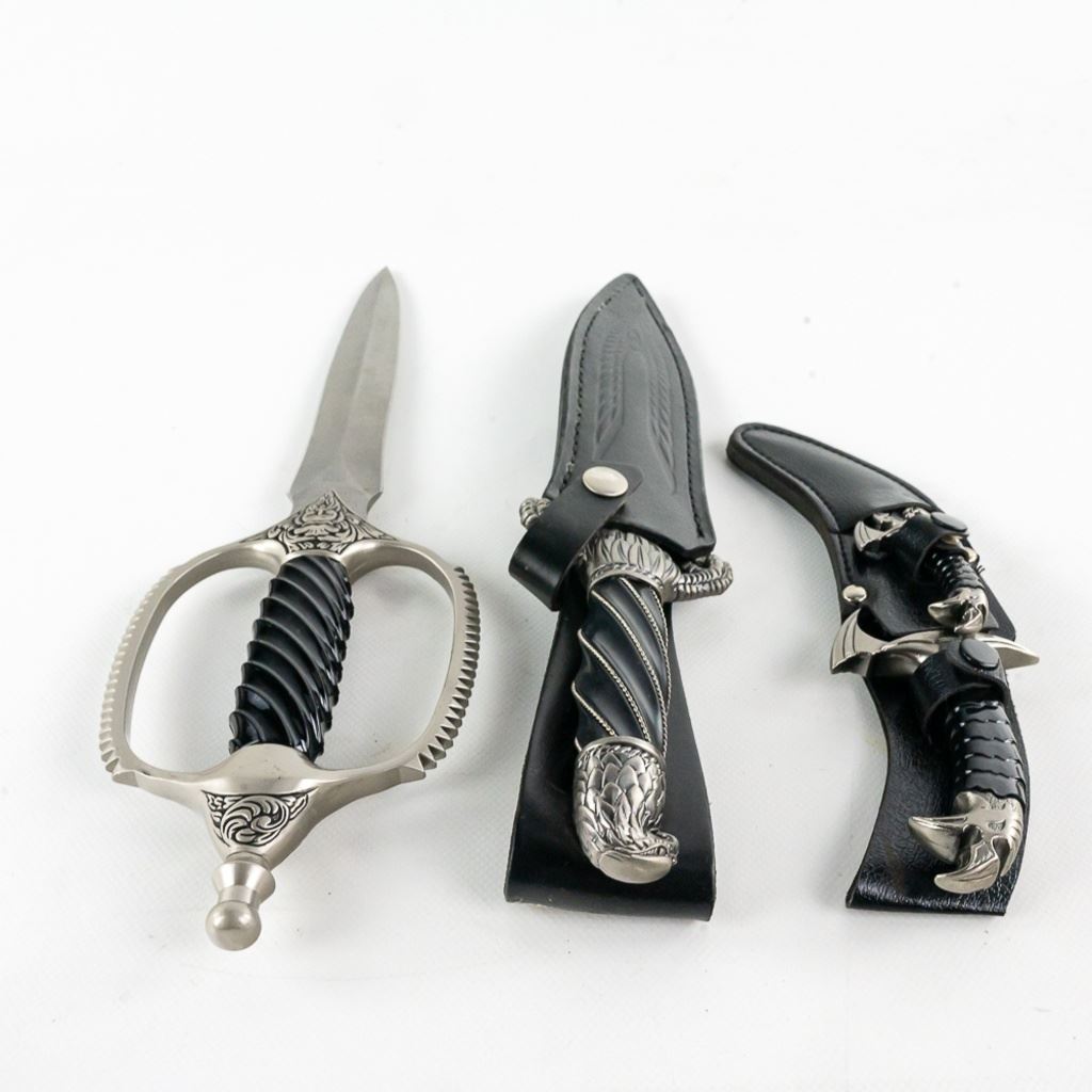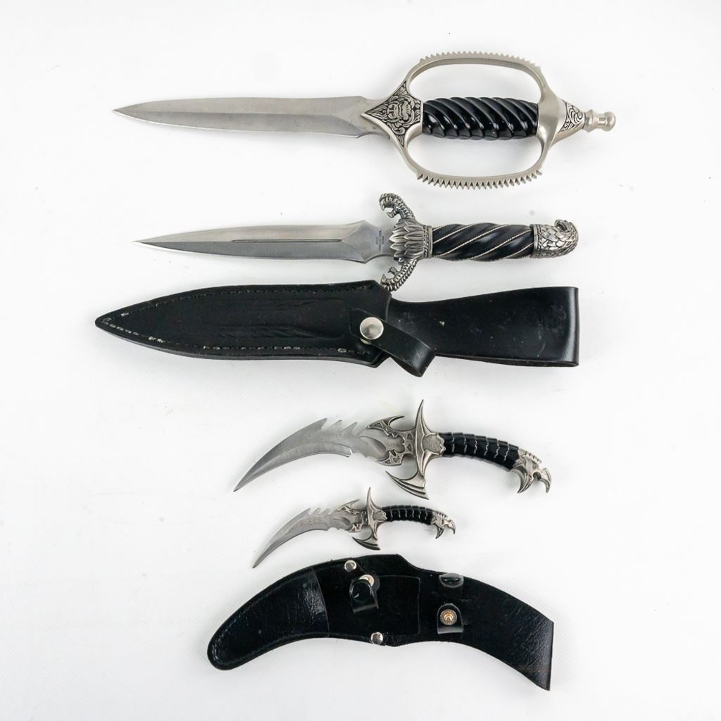 3 Fantasy design daggers. Knives are various Black handle silver hilt designs and all are like new. length ranges from 15" down to 5". See photos for details.
