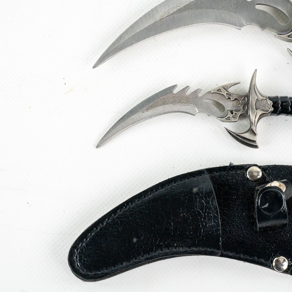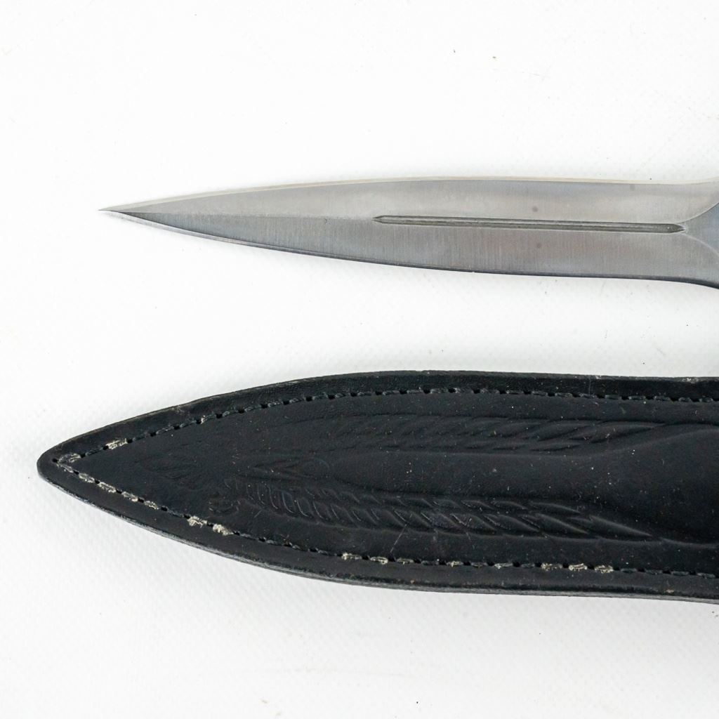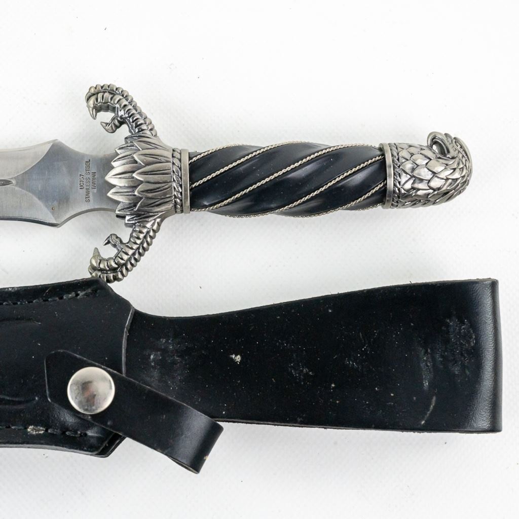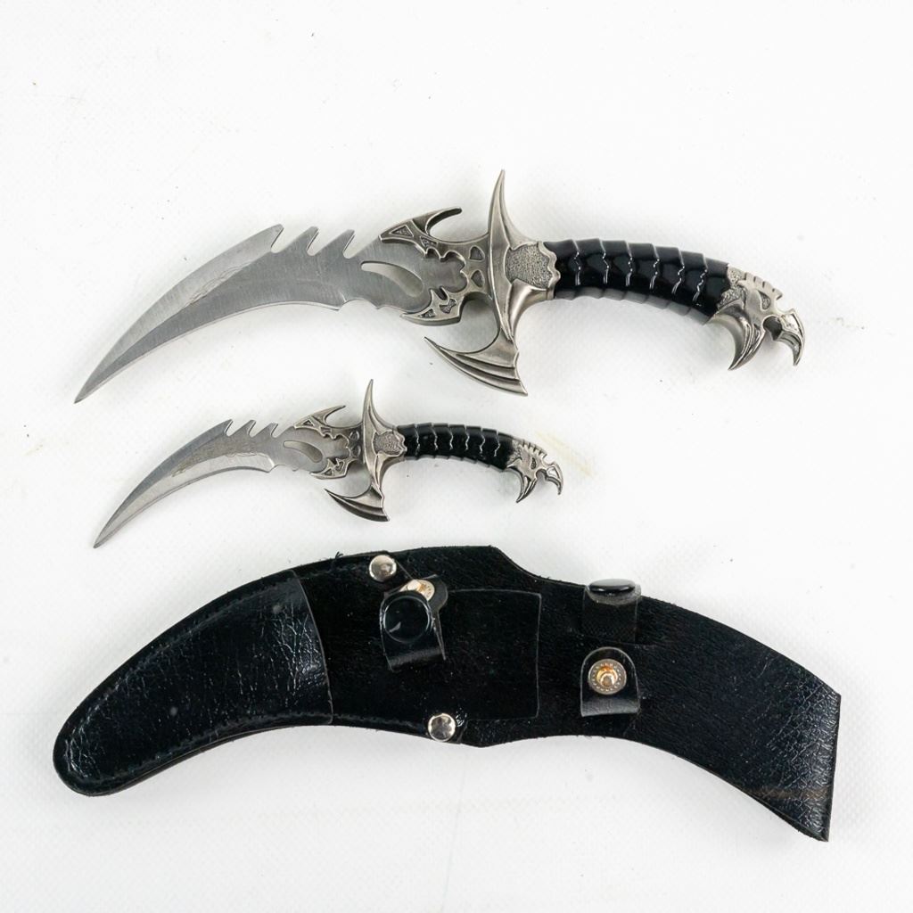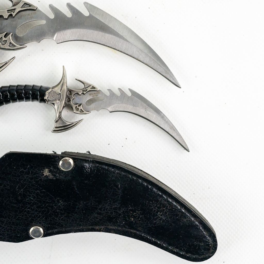 3 Fantasy design daggers. Knives are various Black handle silver hilt designs and all are like new. length ranges from 15" down to 5". See photos for details.