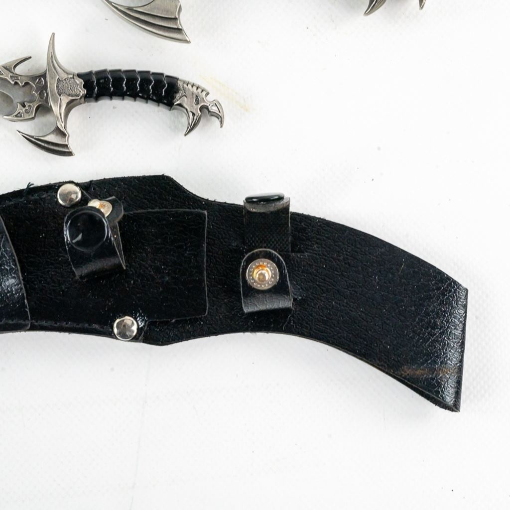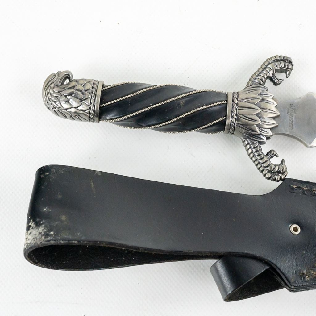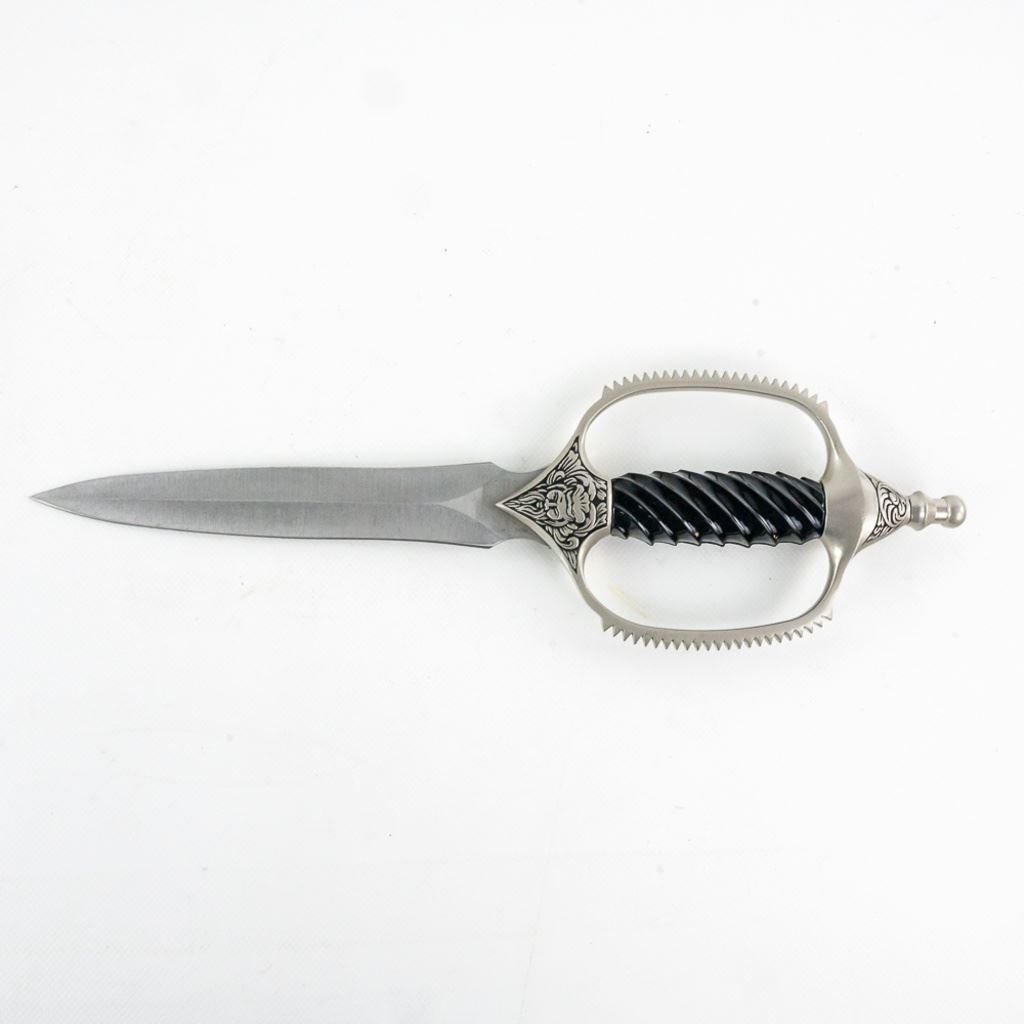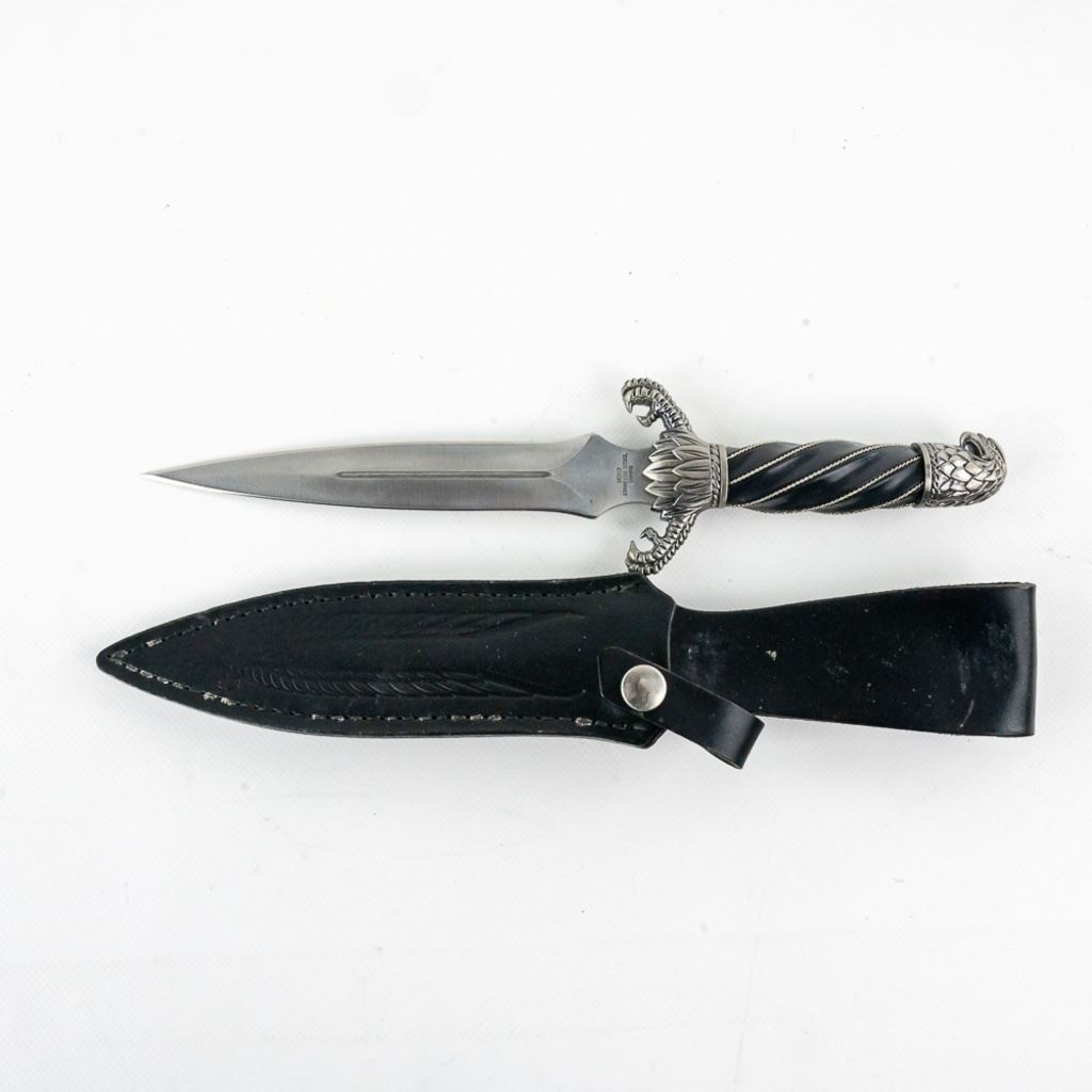 3 Fantasy design daggers. Knives are various Black handle silver hilt designs and all are like new. length ranges from 15" down to 5". See photos for details.