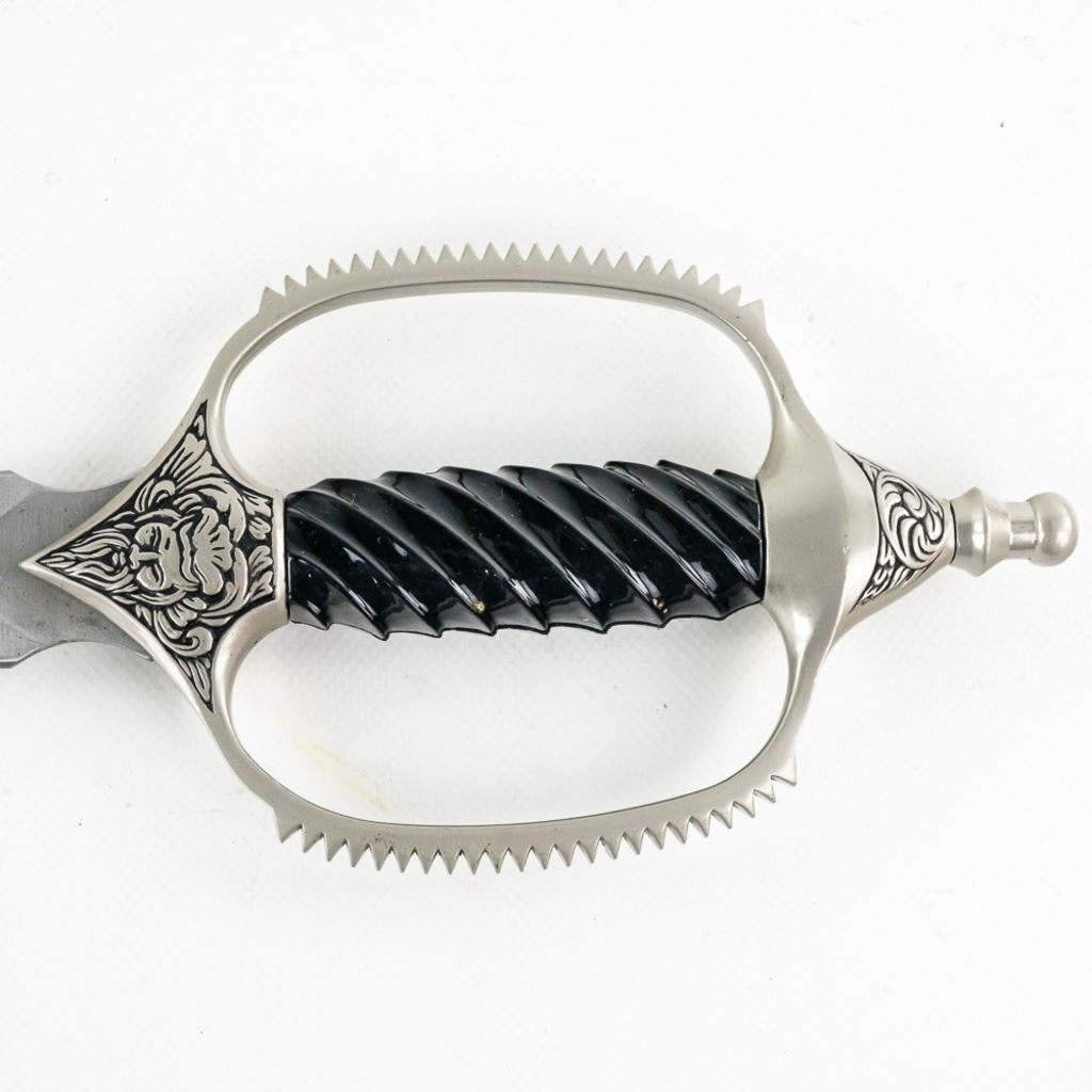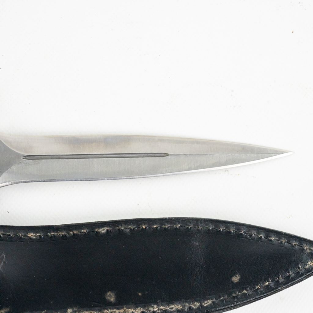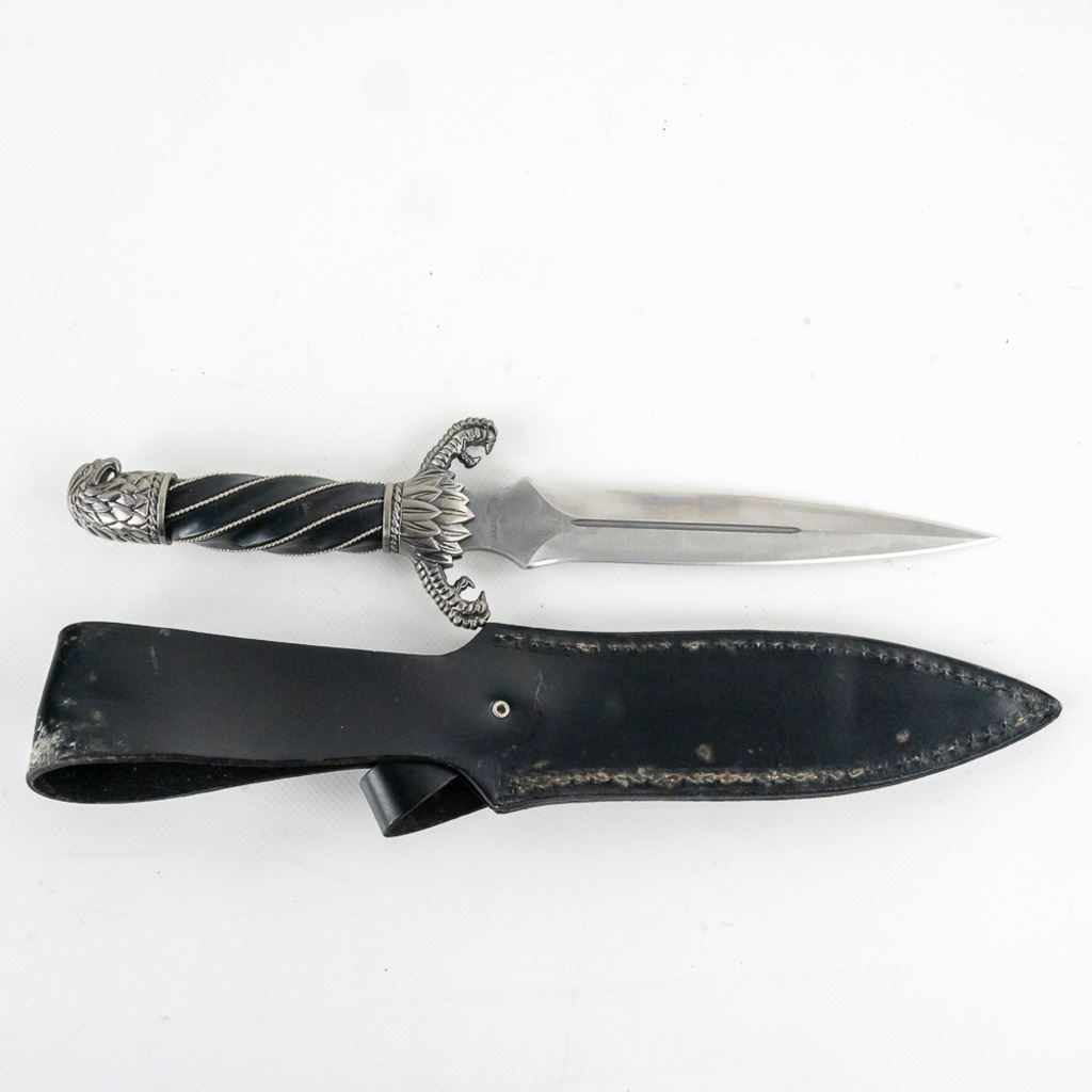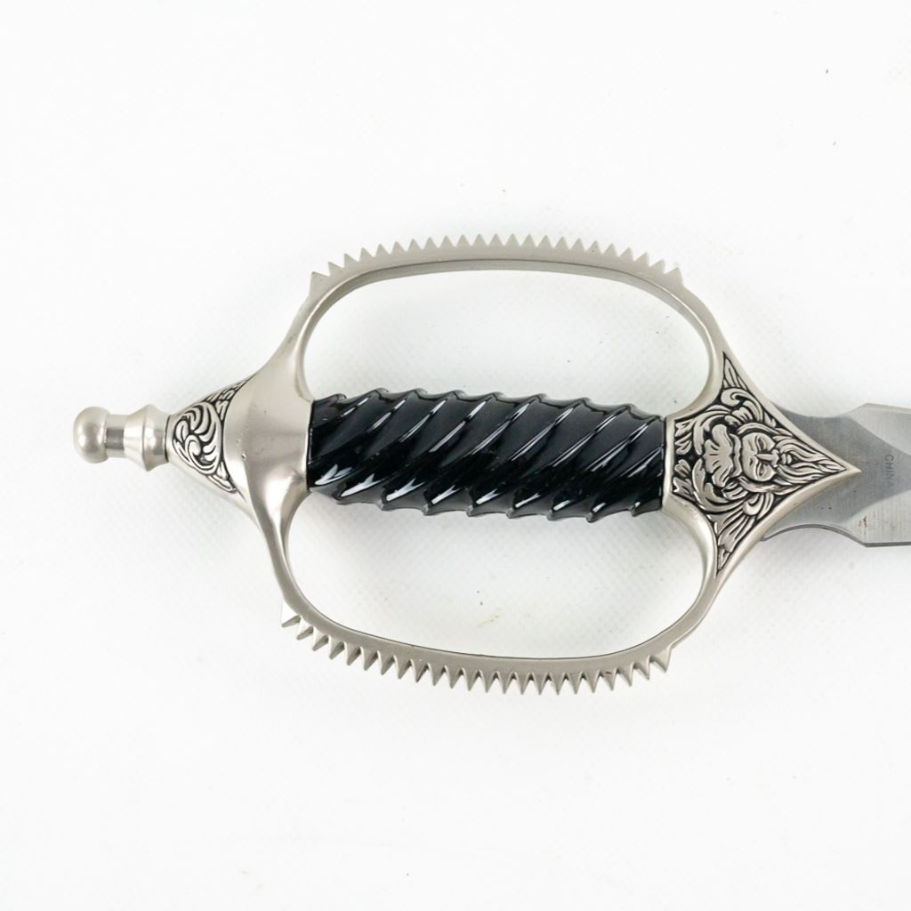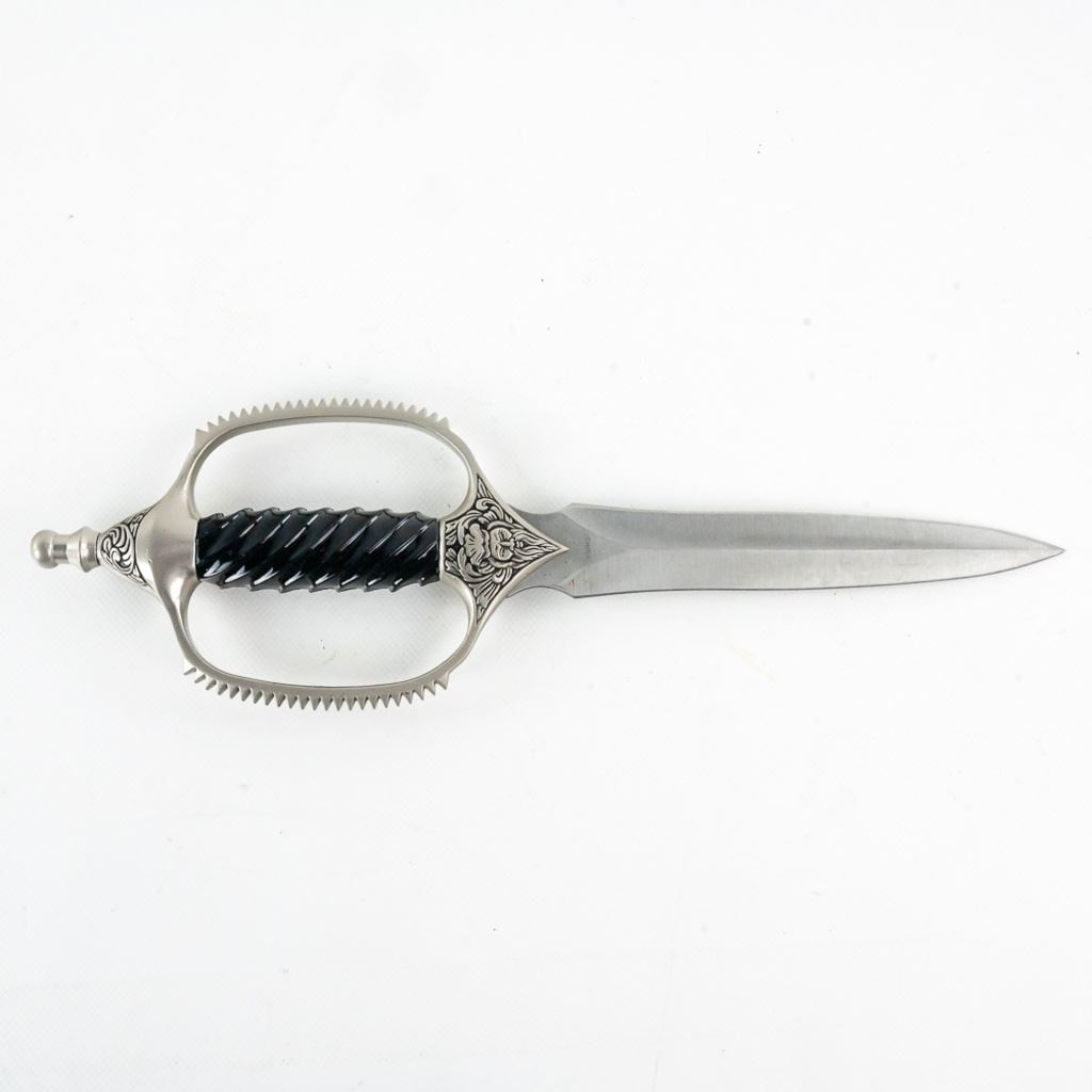 3 Fantasy design daggers. Knives are various Black handle silver hilt designs and all are like new. length ranges from 15" down to 5". See photos for details.