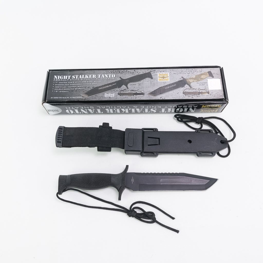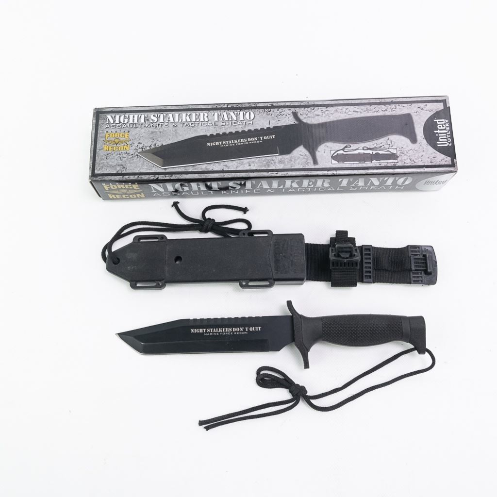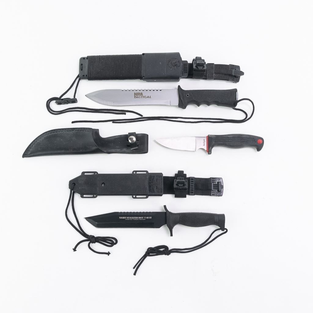 Includes a Kershaw 1013 Bear hunting Knife in VG condition, Two United Cutlery - Night Stalker Tanto in original box and an NRA Tactical. All come with their original sheaths. All in like-new condition