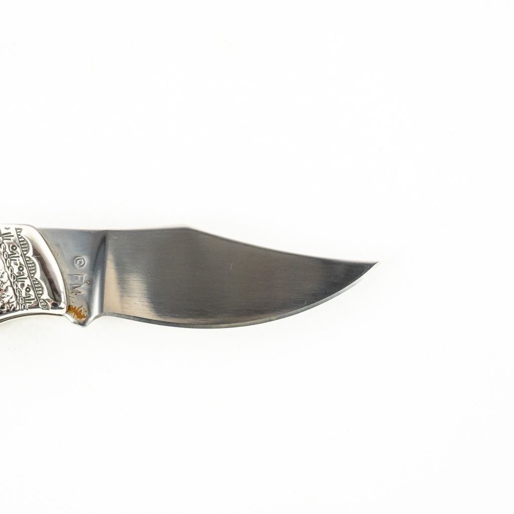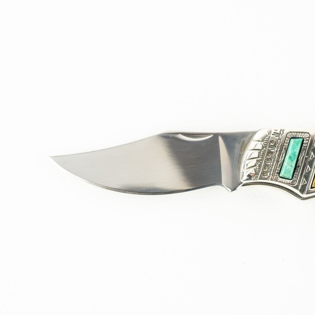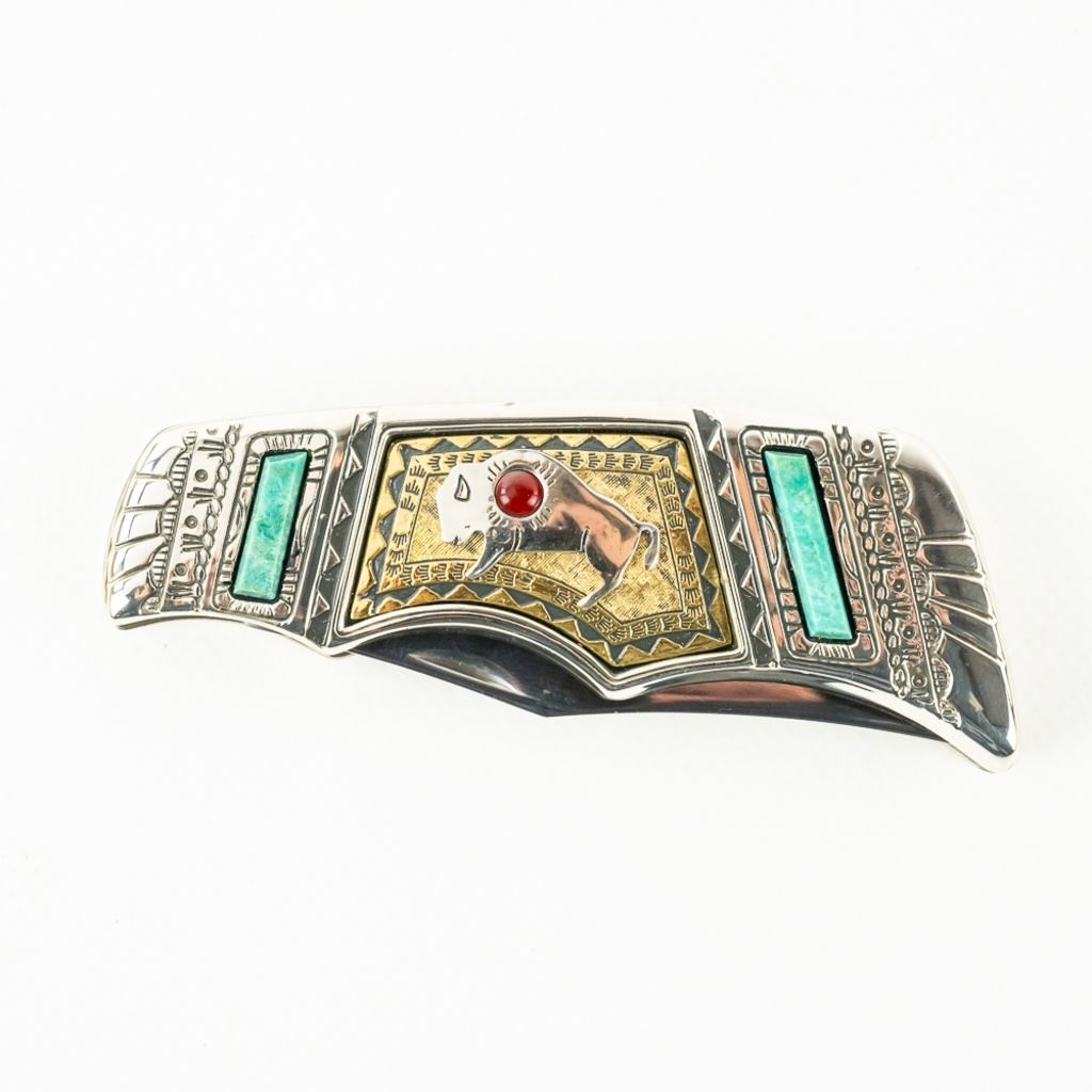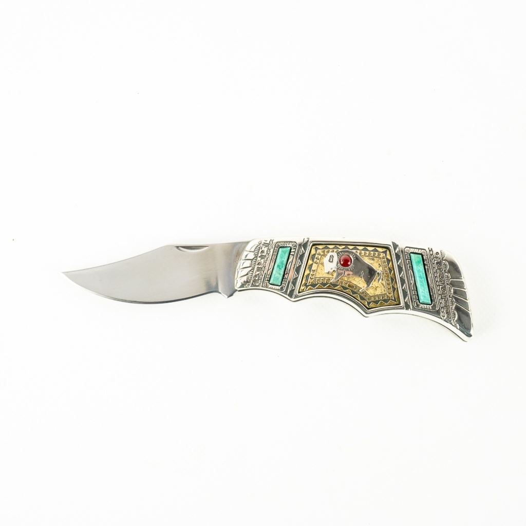 Franklin Mint Collector Series Native American Spirit Animal pocket knife. Knife features Standing Buffalo Inlay and is highly decorated and engraved. Knife is brand new in zipper storage case. See photos.