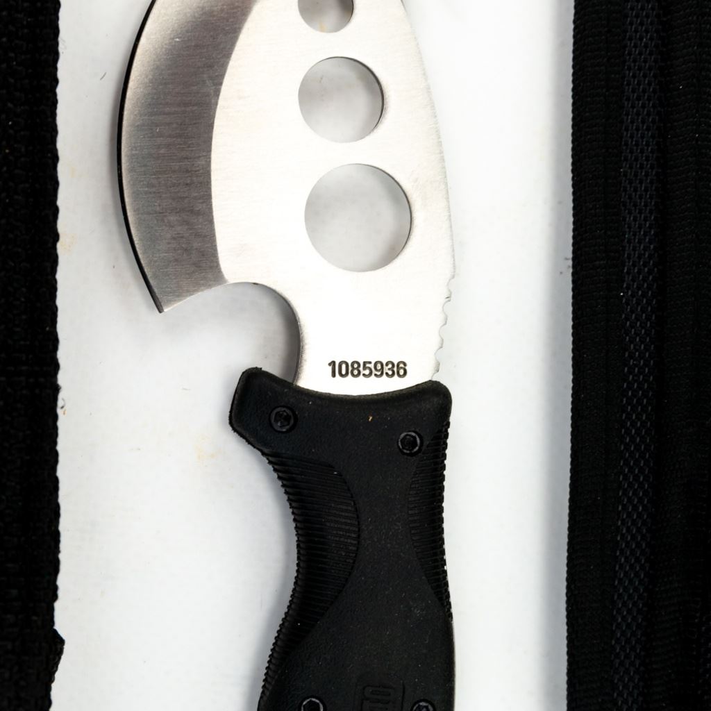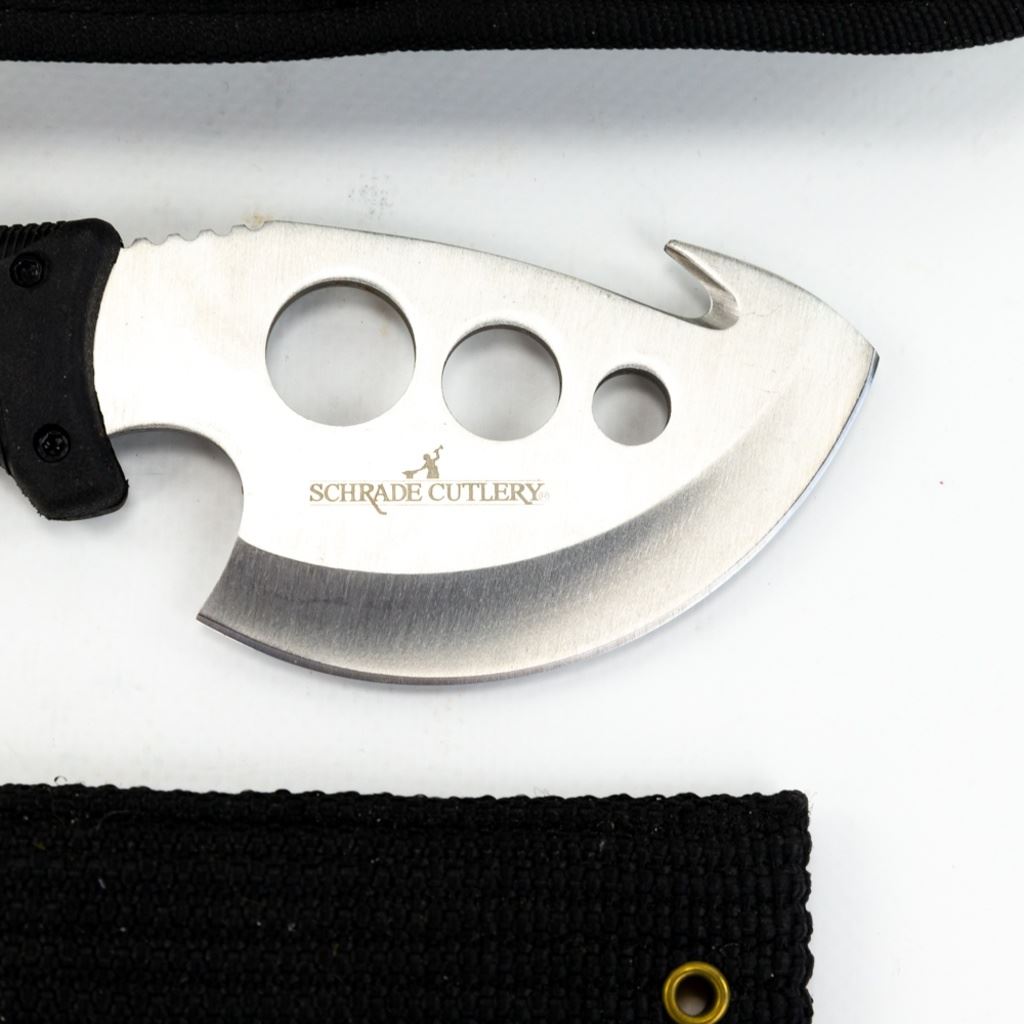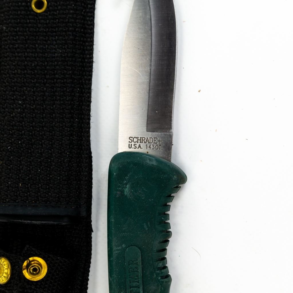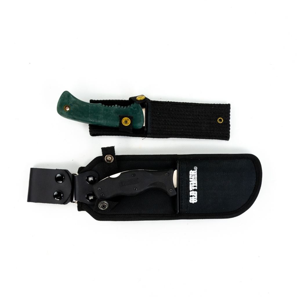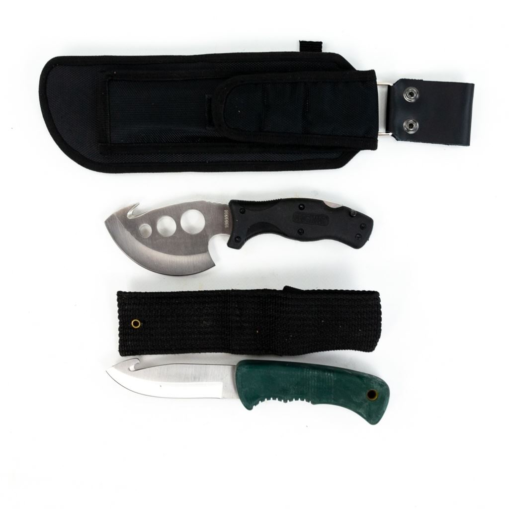 Gut hook skinner knife with green handle is like new in nylon scabbard. Lot also includes Old Timer multi-blade skinning and field dressing tool that is like new with nylon carrying sheath. See photos.