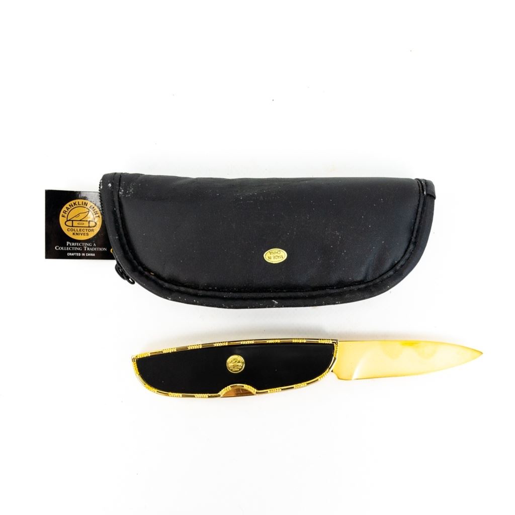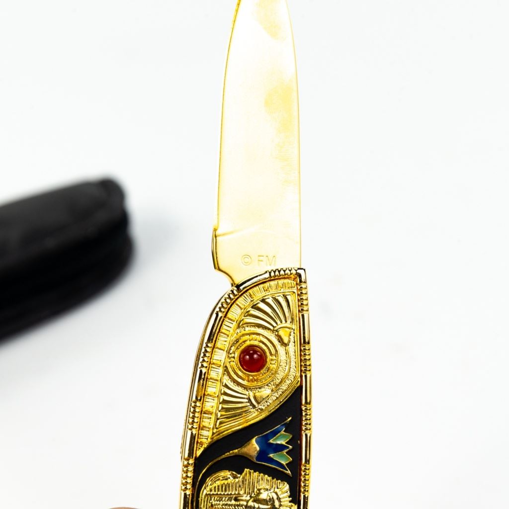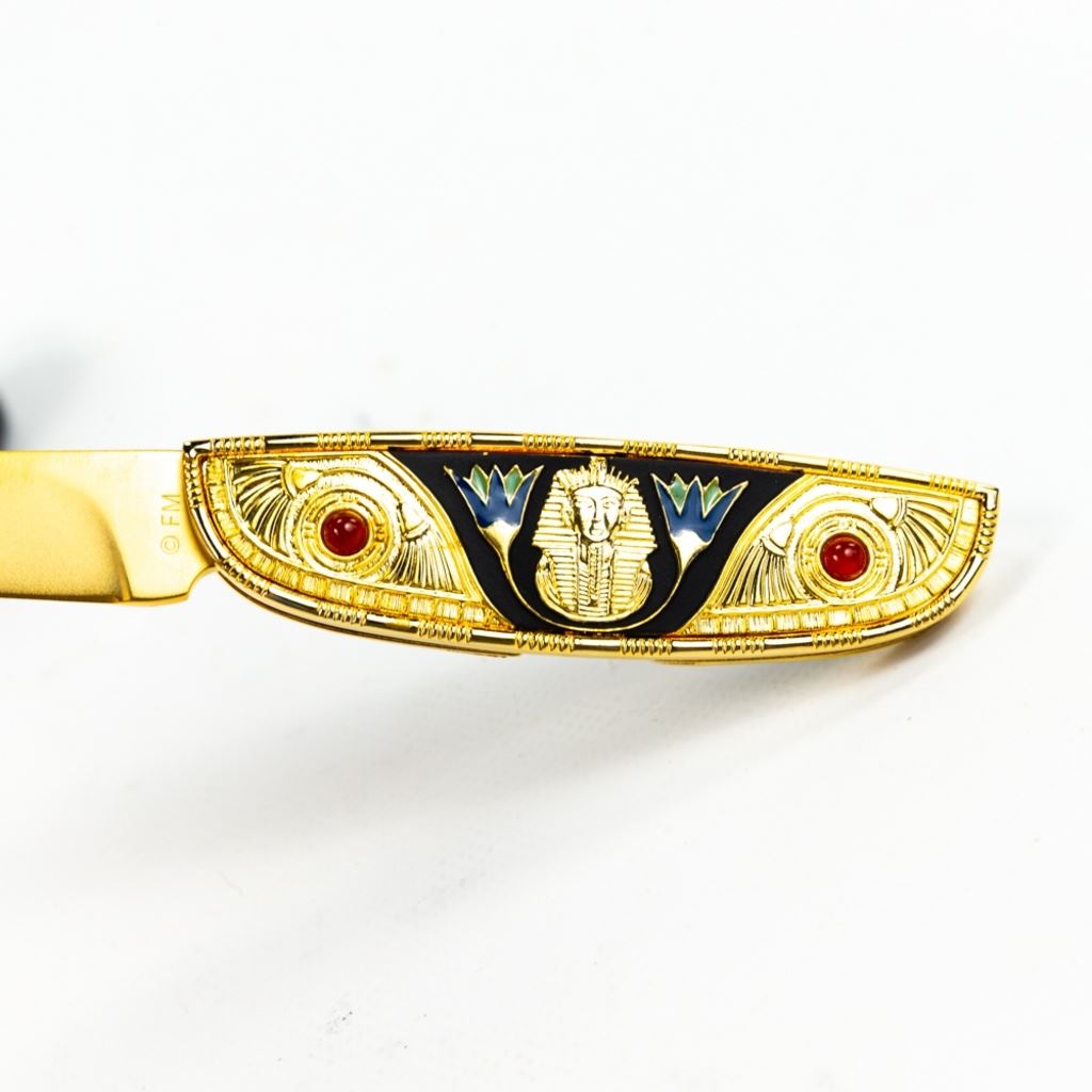 Franklin Mint Collector Series Tutankhamun. Folding Knife. Very Pretty Heavy Gilt Finish with Raised Pharoah. Knife is Brand new with Zipper storage pouch. See Photos.