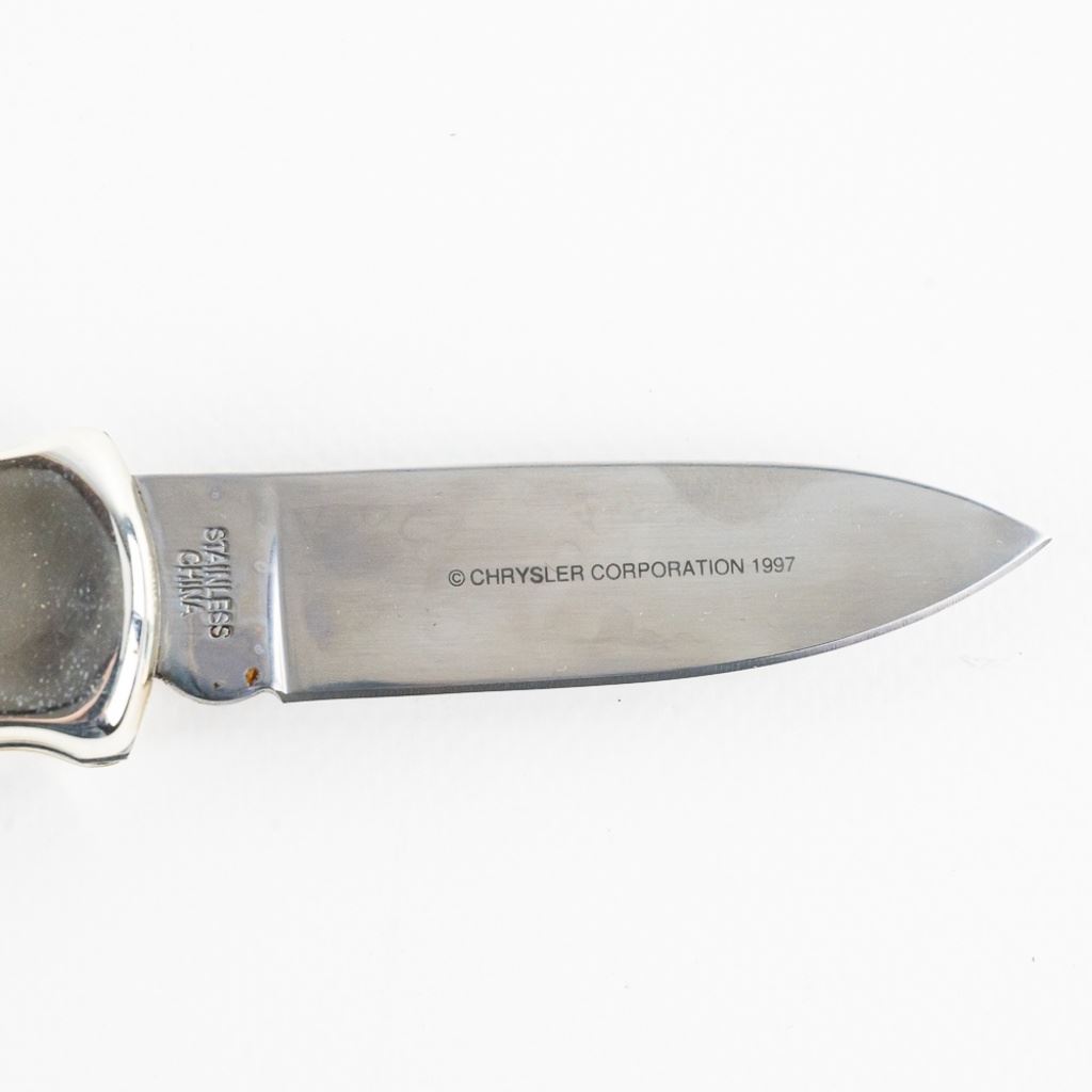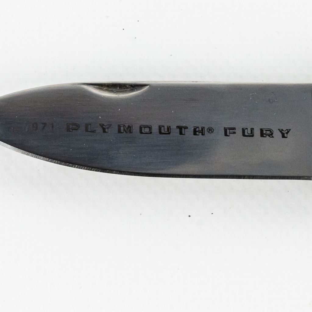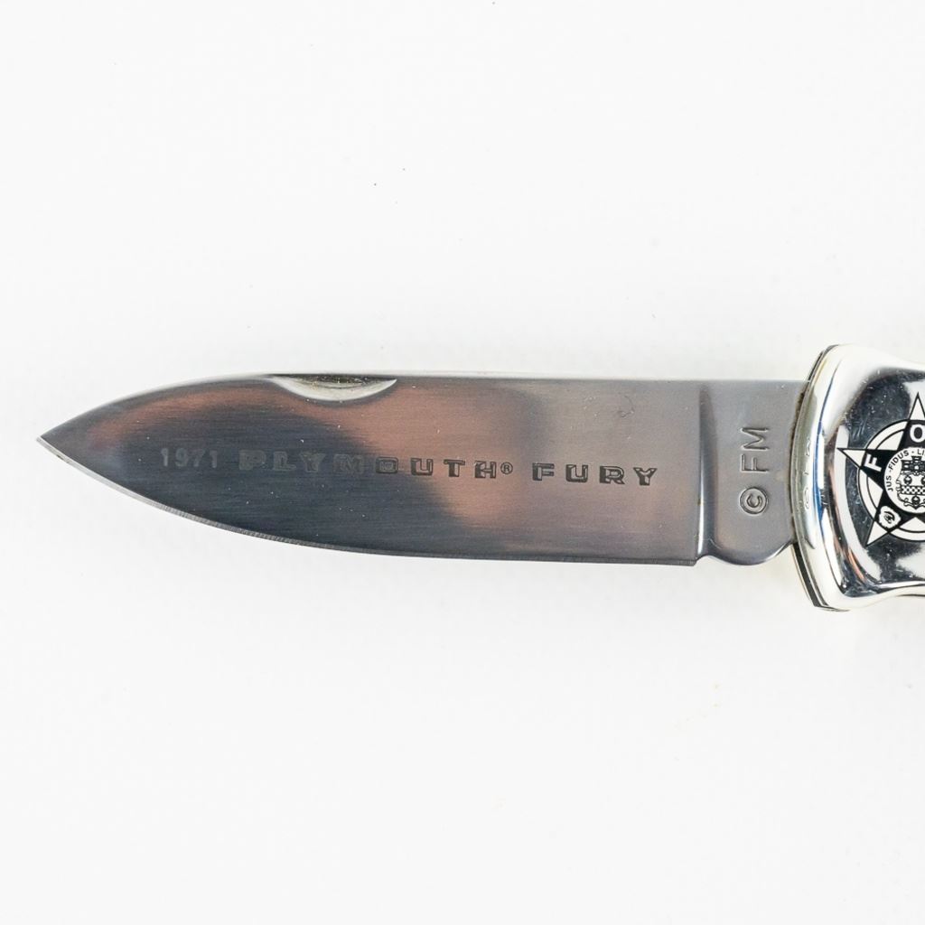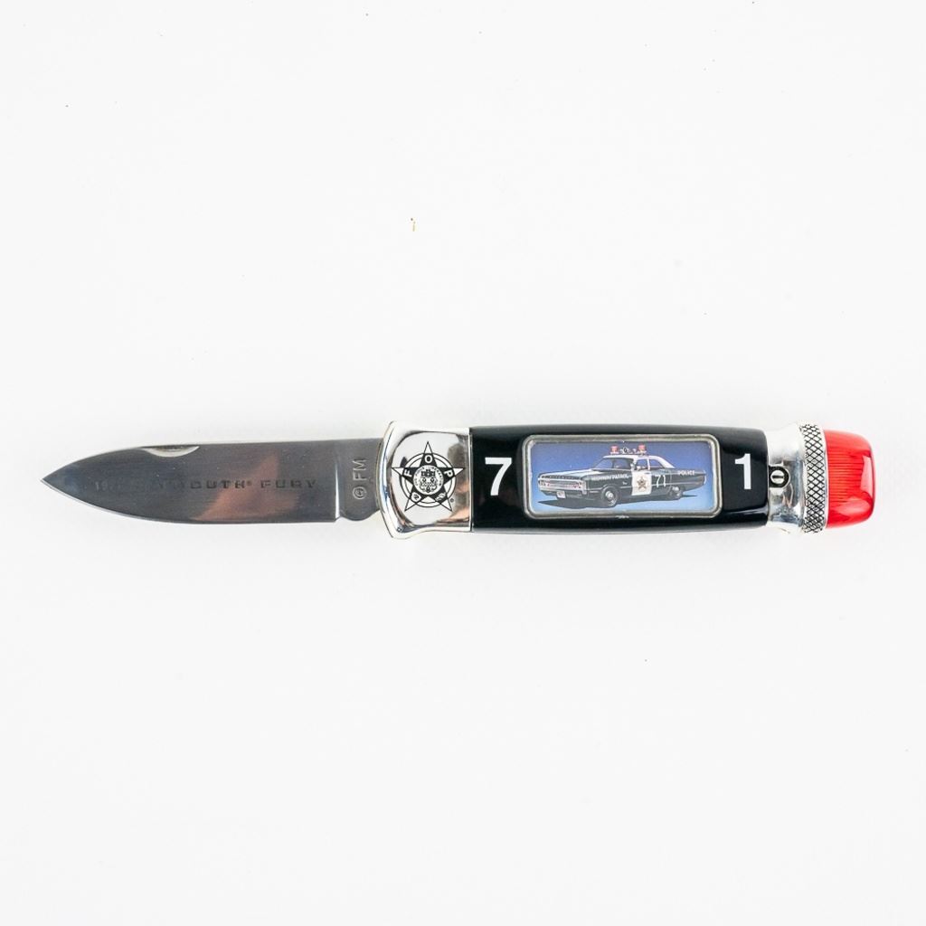 Franklin Mint collector knife featuring the 1971 Plymouth Fury Police Cruiser. Nice themed gift for the vintage policeman in your life. Knife is brand new in zipper storage case. See photos.
