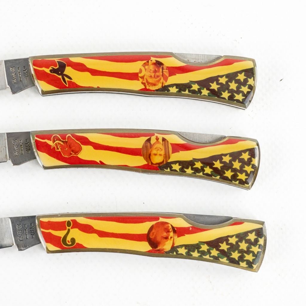 Case XX1992 Presidential Election Collector Pocket Knife Set. 3 knife set featuring portraits of the three major candidates from the 1992 Presidential election. All three knives are in Excellent condition with no wear to blades or handles. Neat, instant collection. See Photos.
