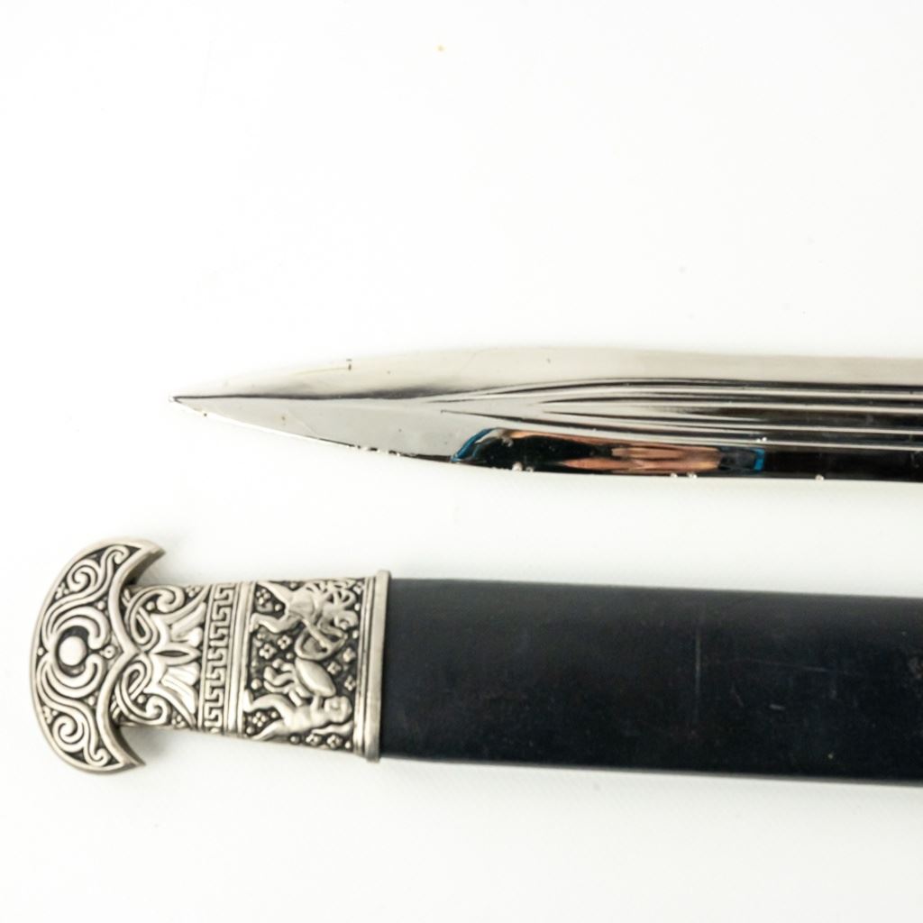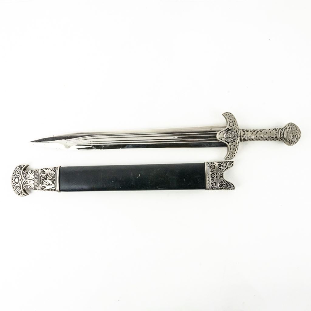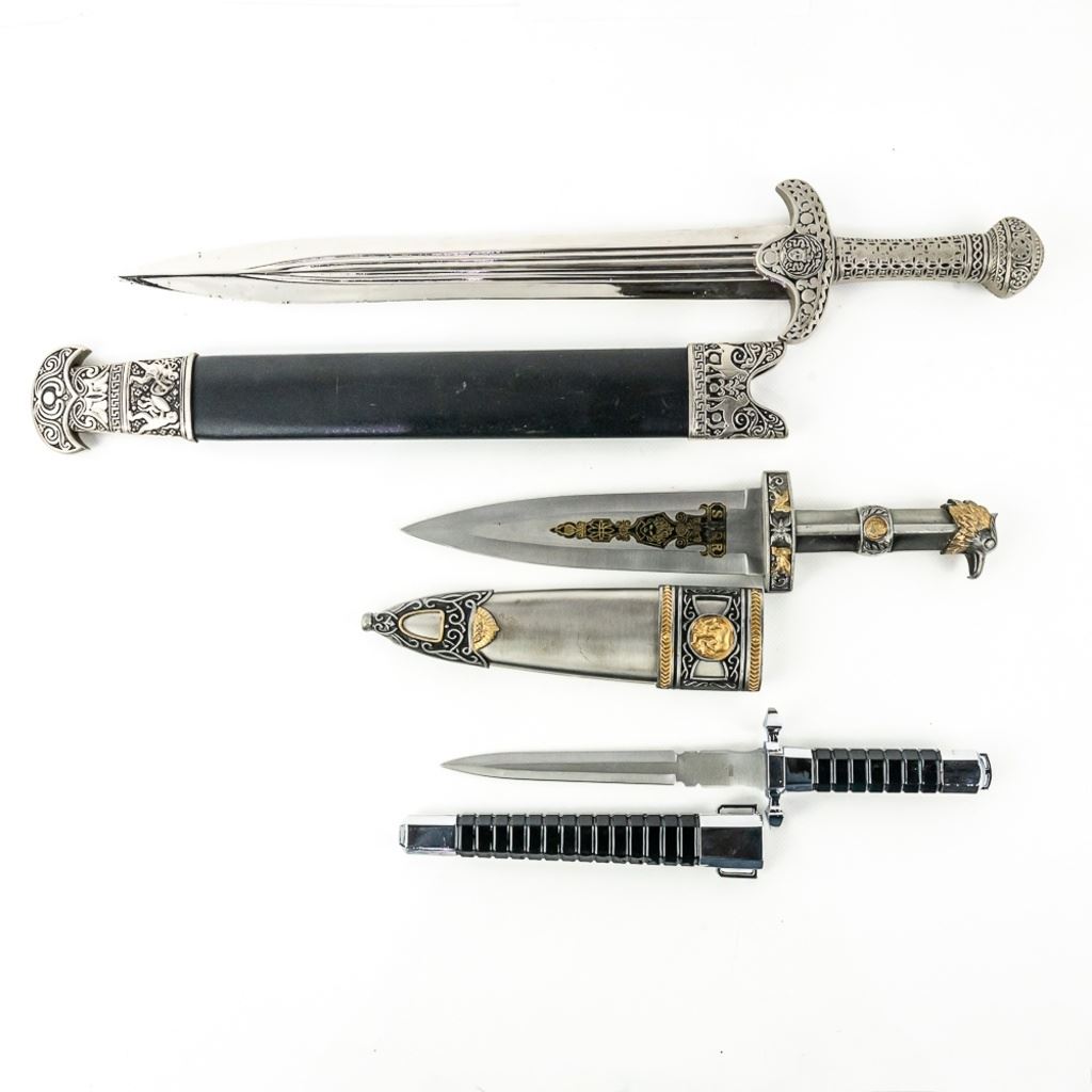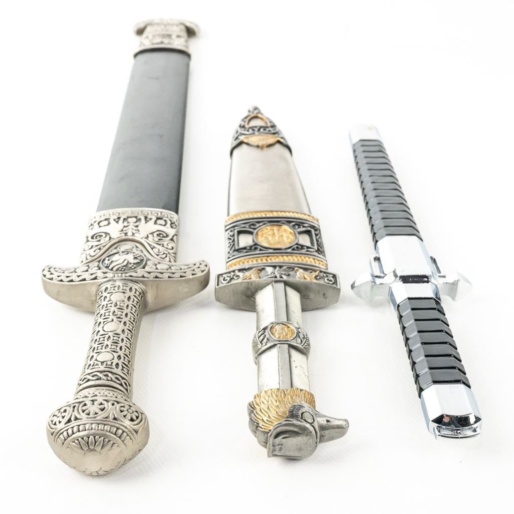 3 Fantasy short swords. Condition varies from very good to excellent. Style and manufacturer varies. All imported and range in length from 12" to 20" with scabbards. See Photos.