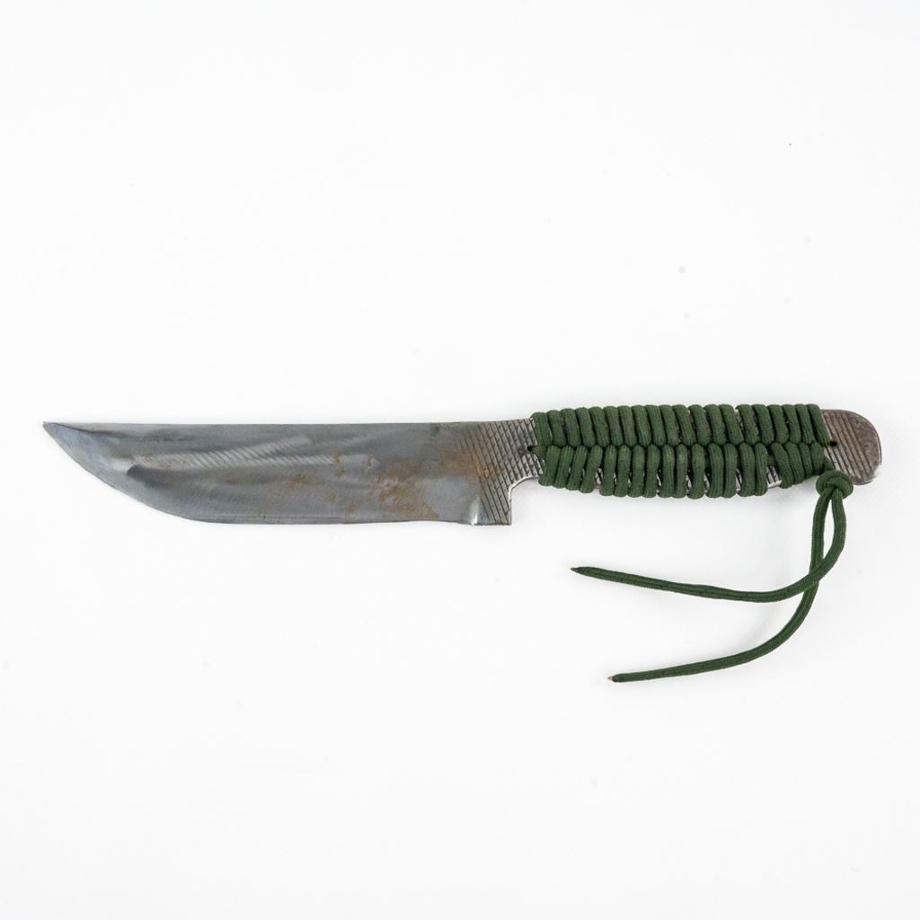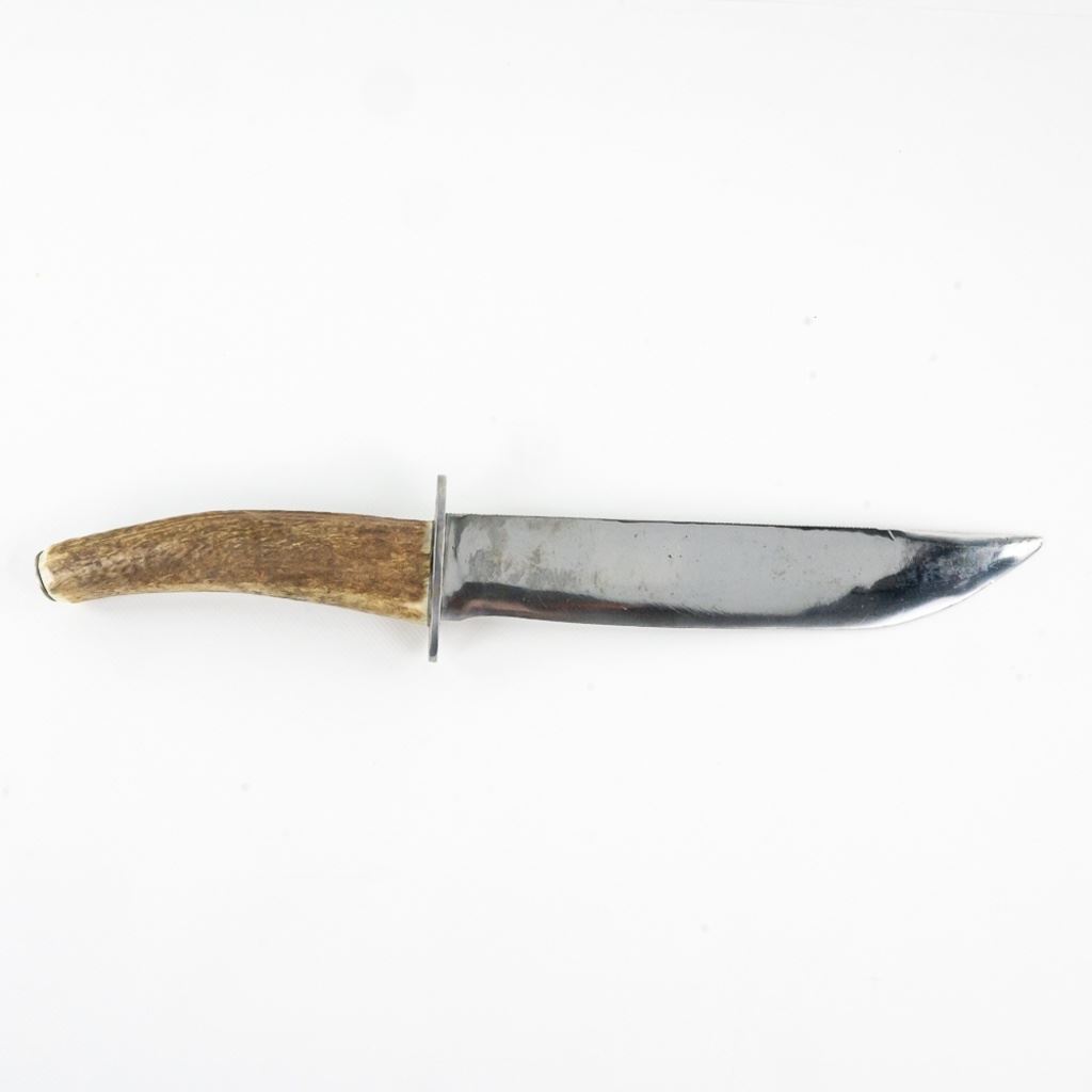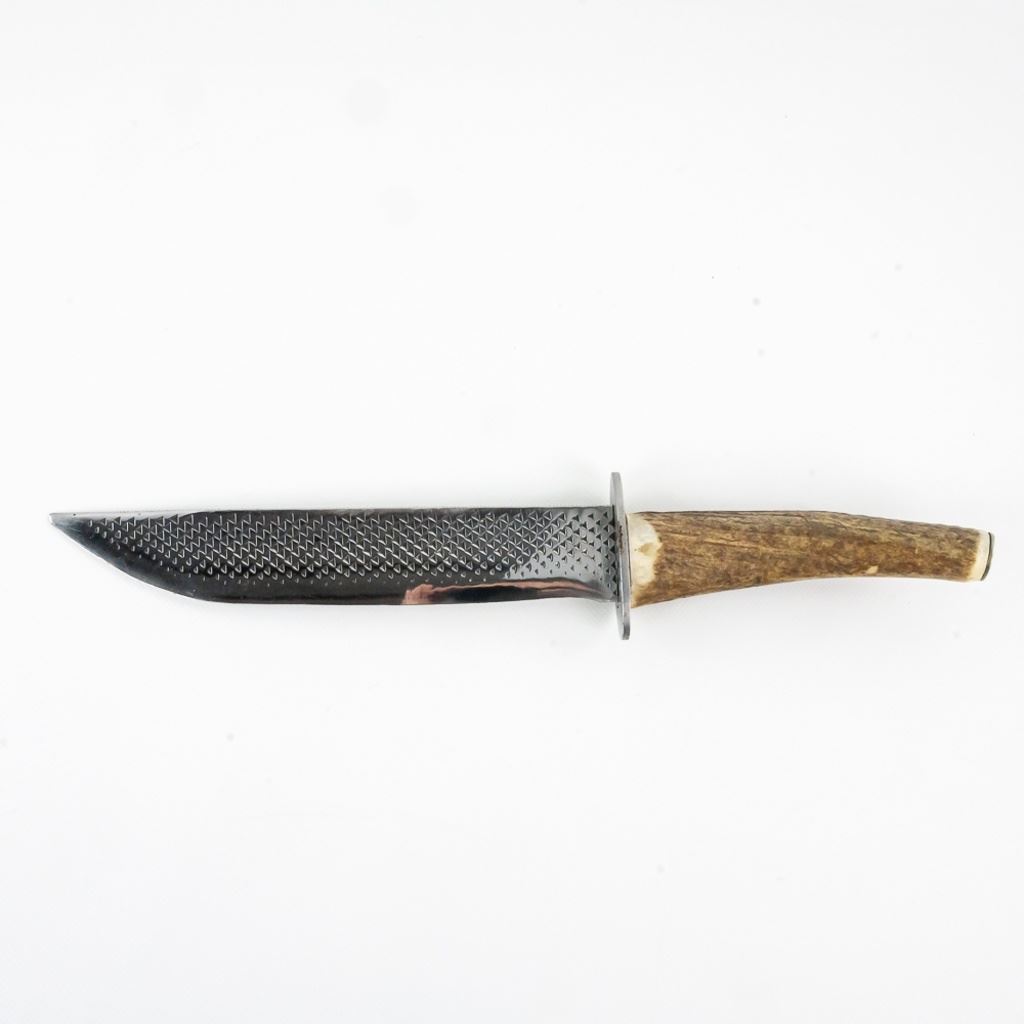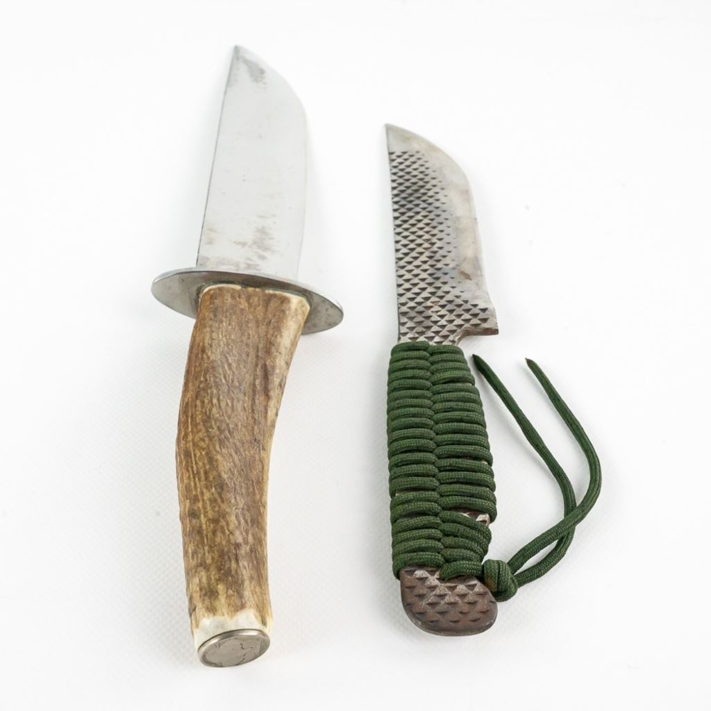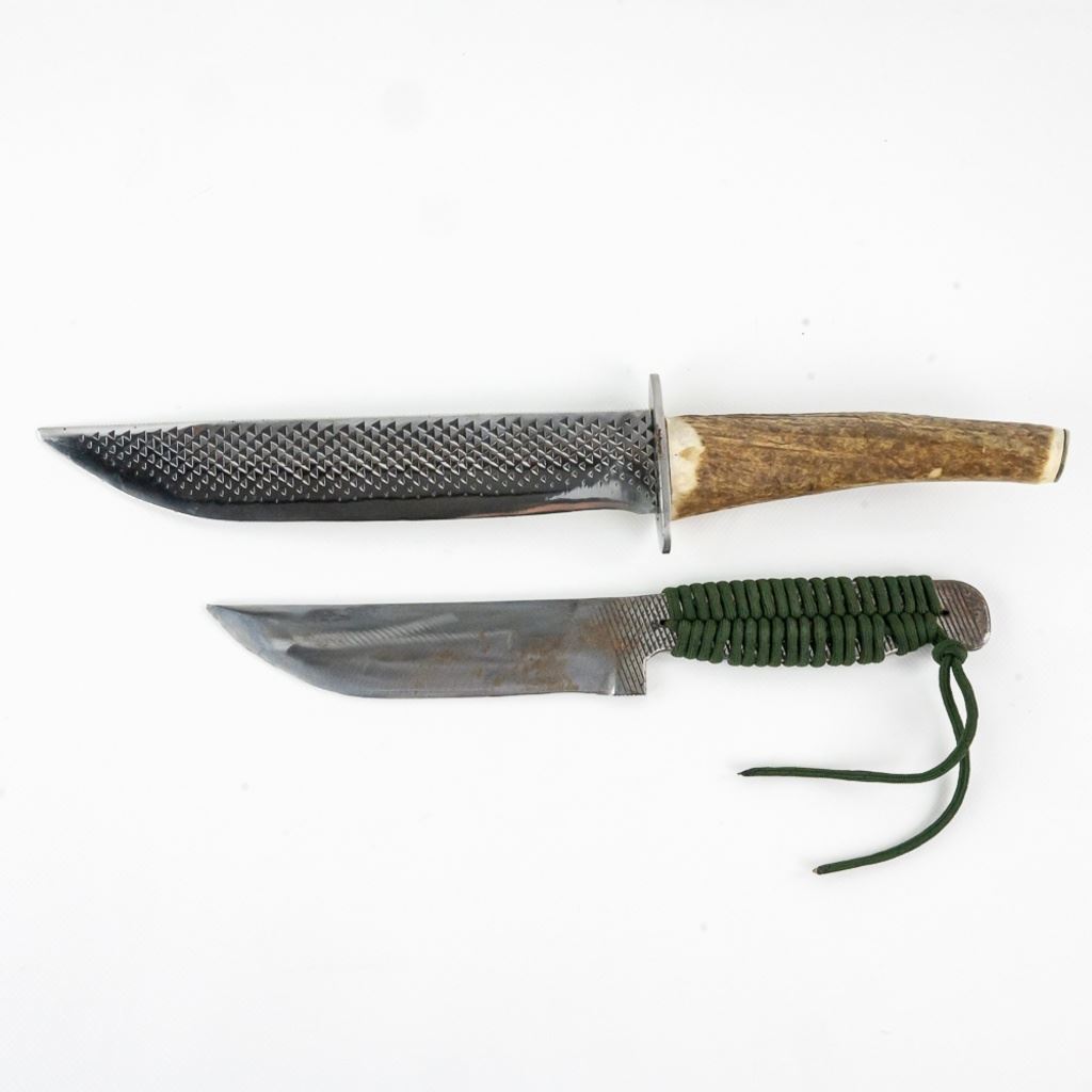 2 Bowie-style knives hand made from used files. Antler handle knife is 16.5" overall with 10" blade. Cord wrapped handle is 12.5" overall with 7" blade. No sheaths included, sorry. See Photos.