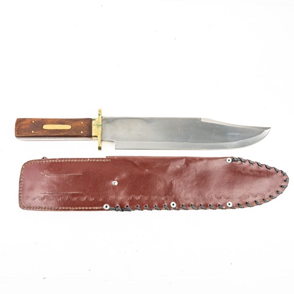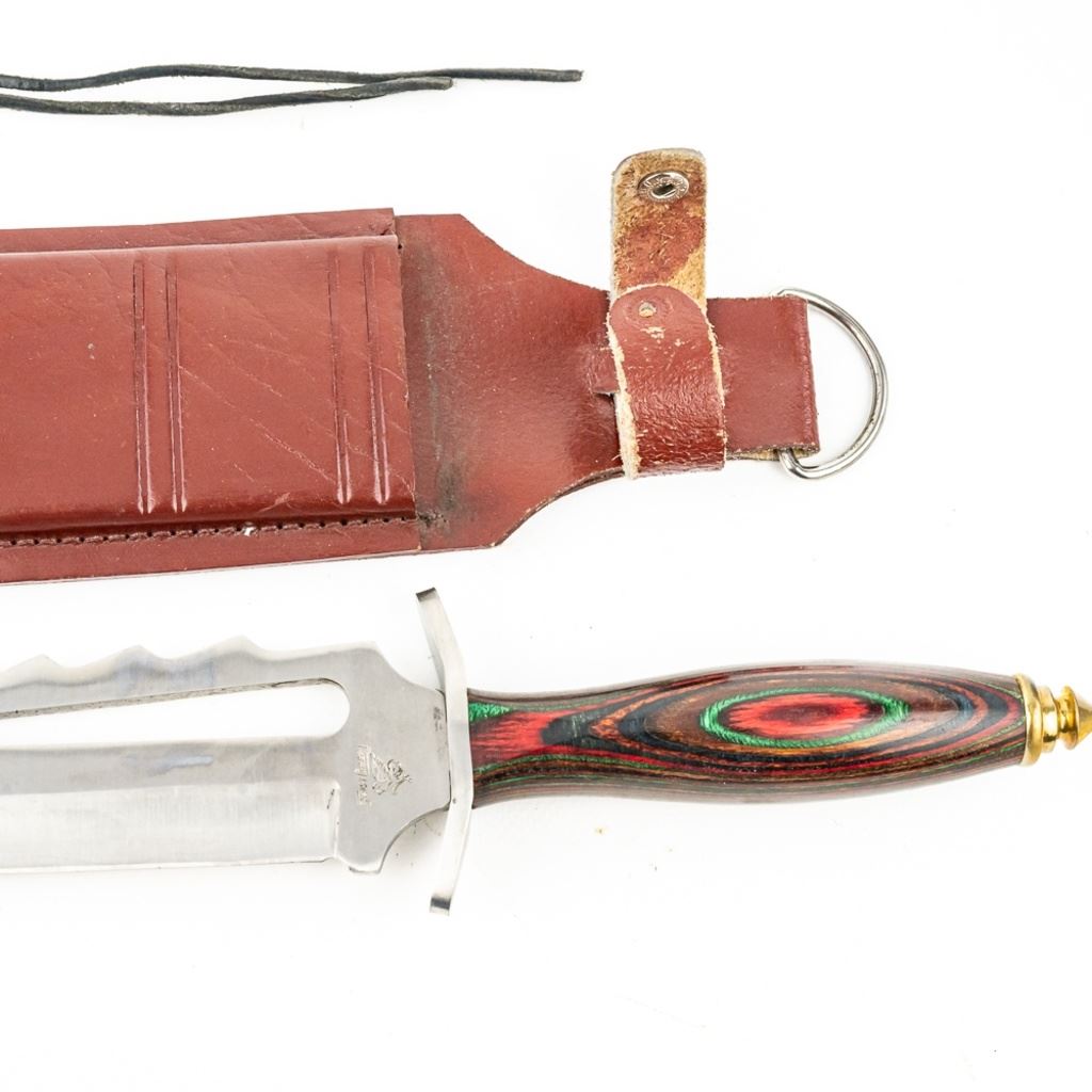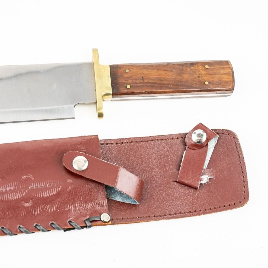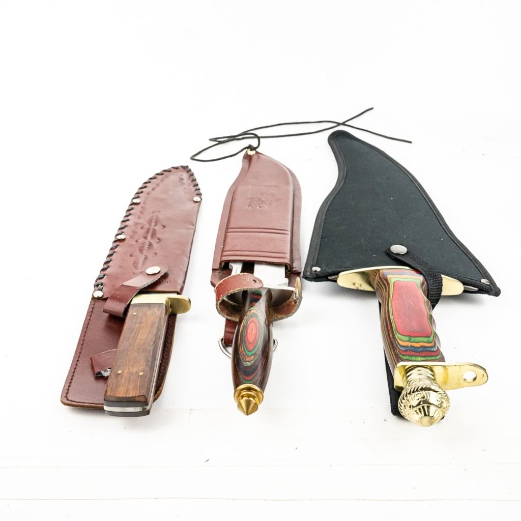 3 Imported bowie style knives. All are almost brand new condition. 3 very different decoration and blade styles. Lengths range from 16-19" overall. Knives come with factory sheathes and come in vintage case. See Photos.