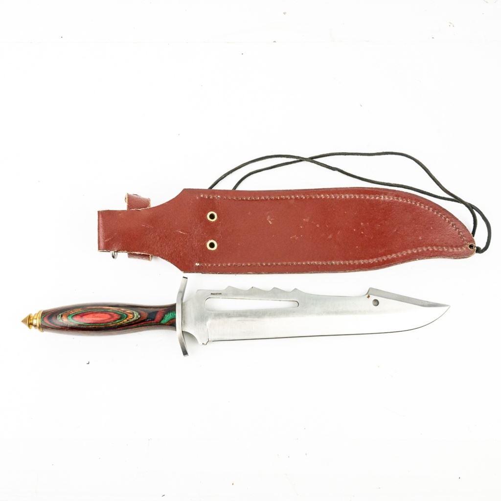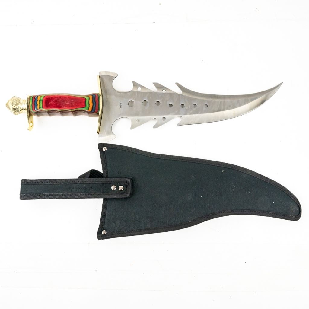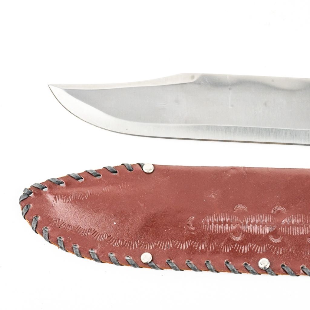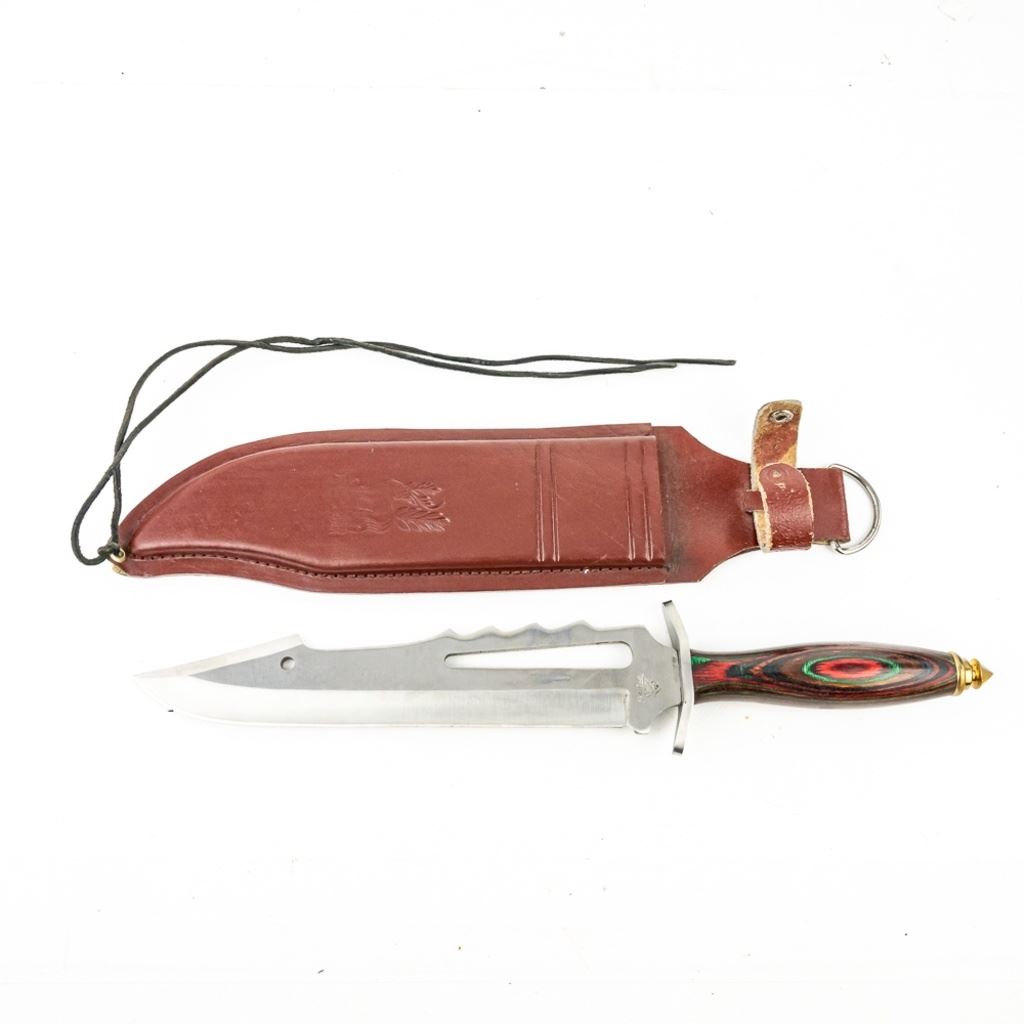 3 Imported bowie style knives. All are almost brand new condition. 3 very different decoration and blade styles. Lengths range from 16-19" overall. Knives come with factory sheathes and come in vintage case. See Photos.