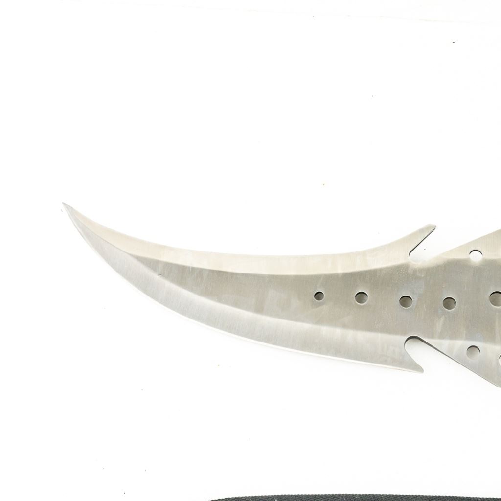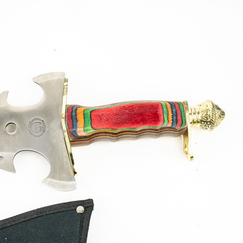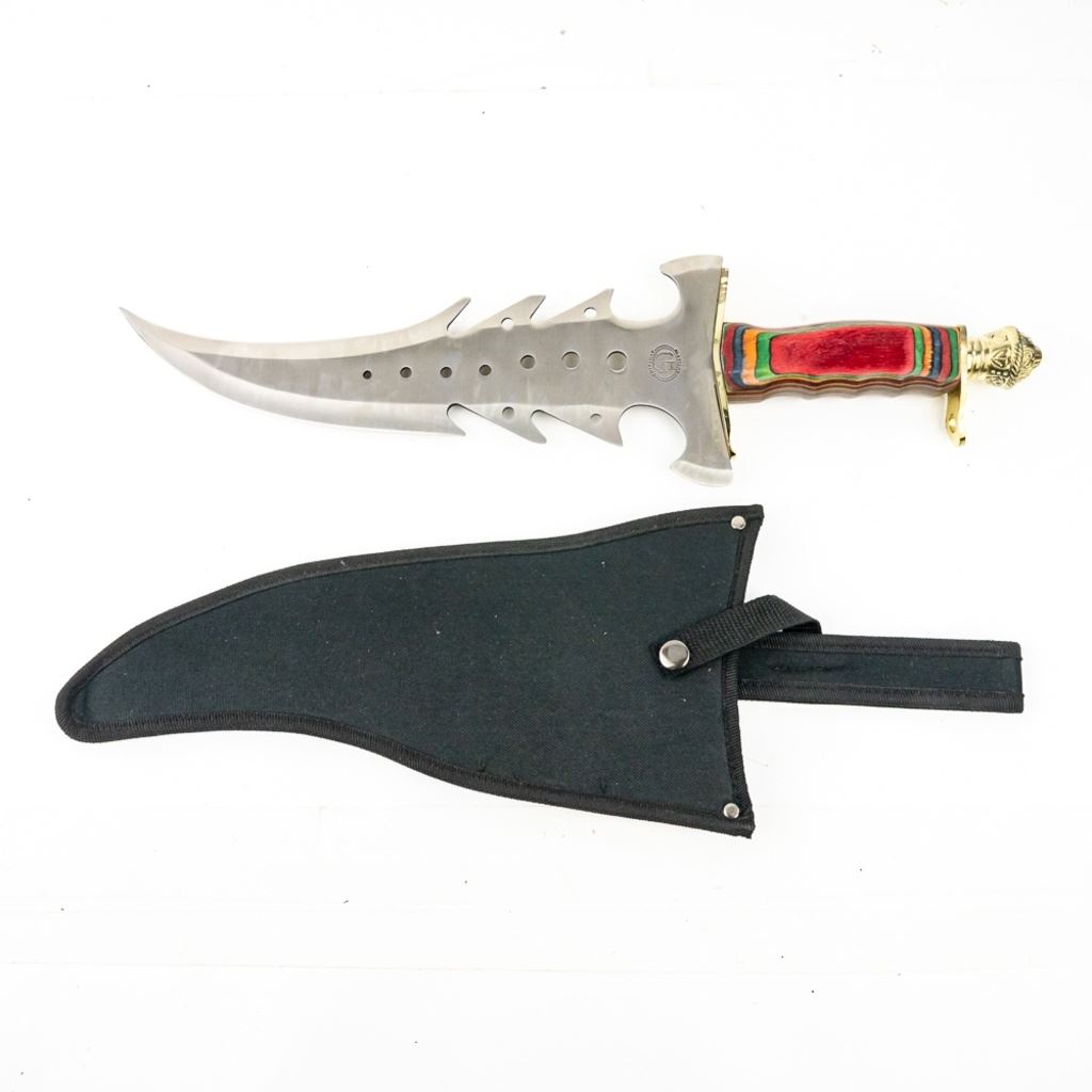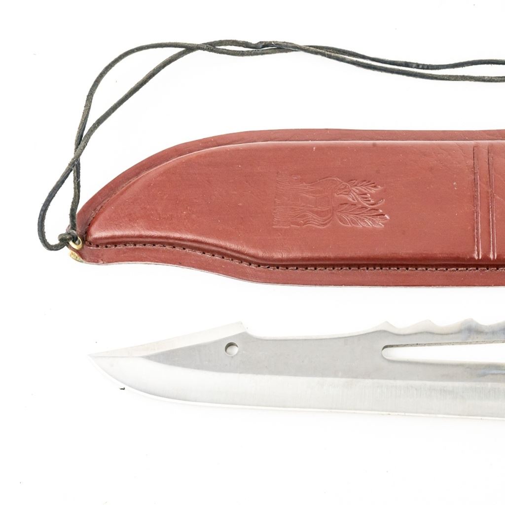 3 Imported bowie style knives. All are almost brand new condition. 3 very different decoration and blade styles. Lengths range from 16-19" overall. Knives come with factory sheathes and come in vintage case. See Photos.