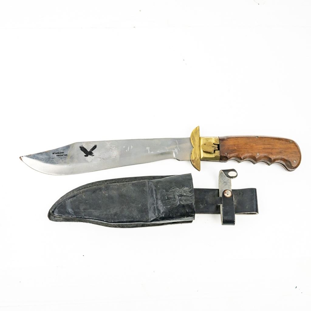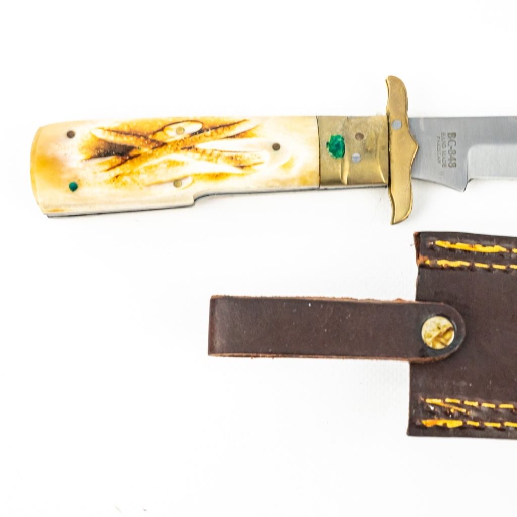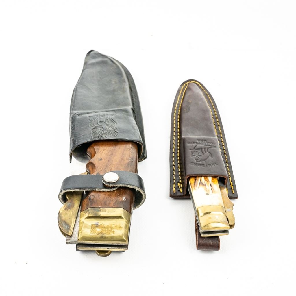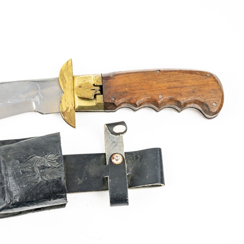 2 Imported folding bowie style knives. One is good condition and the other is brand new condition. 2 different decoration and blade styles. Lengths range from 16-19" overall. Knives come with factory sheathes and come in plastic case. See Photos.