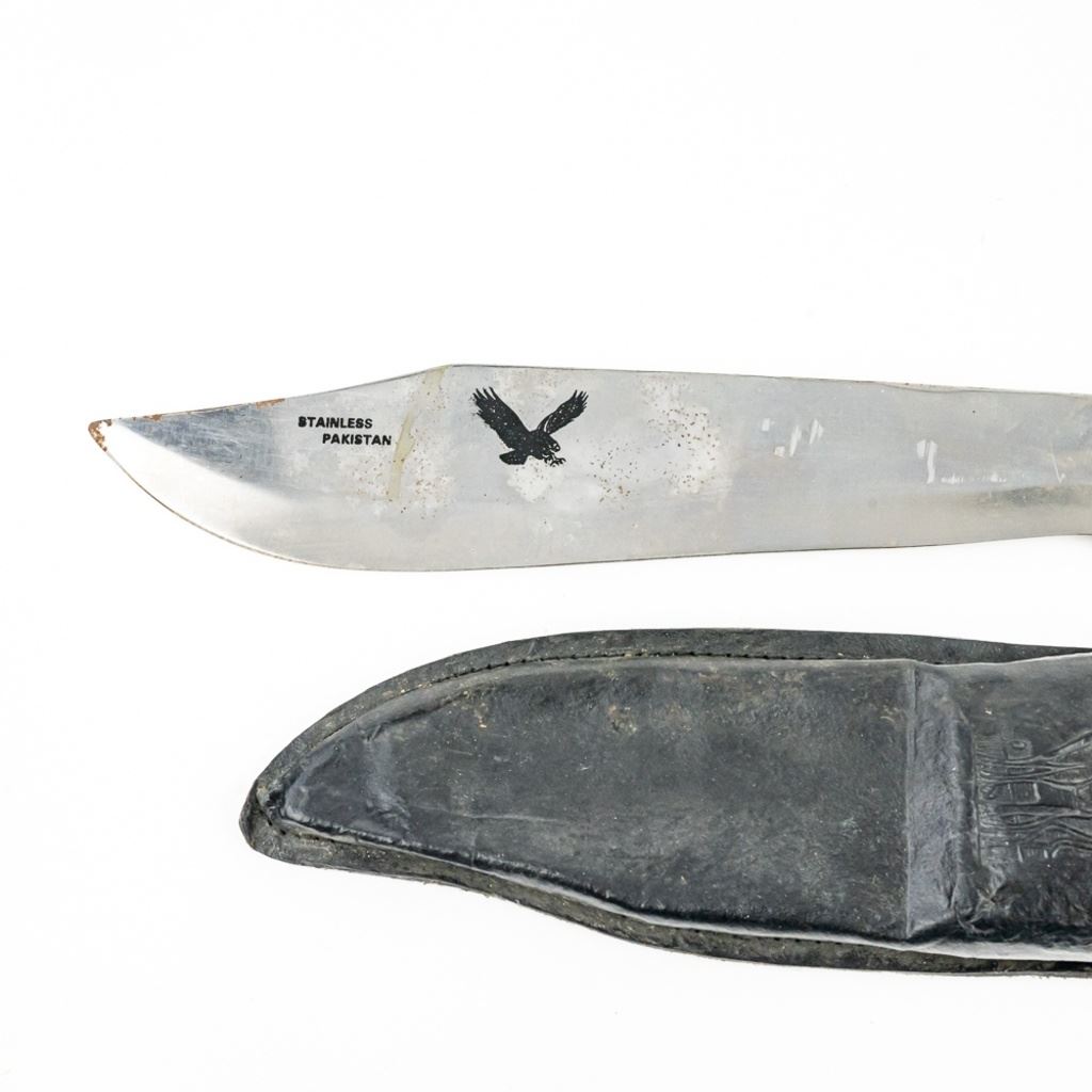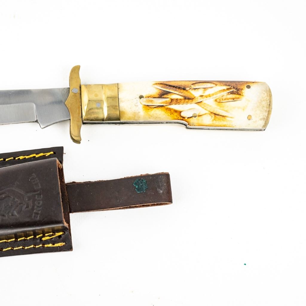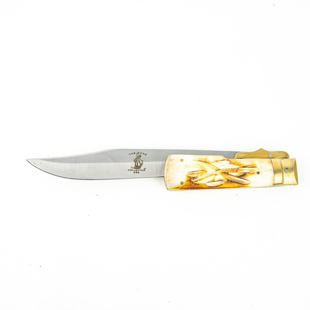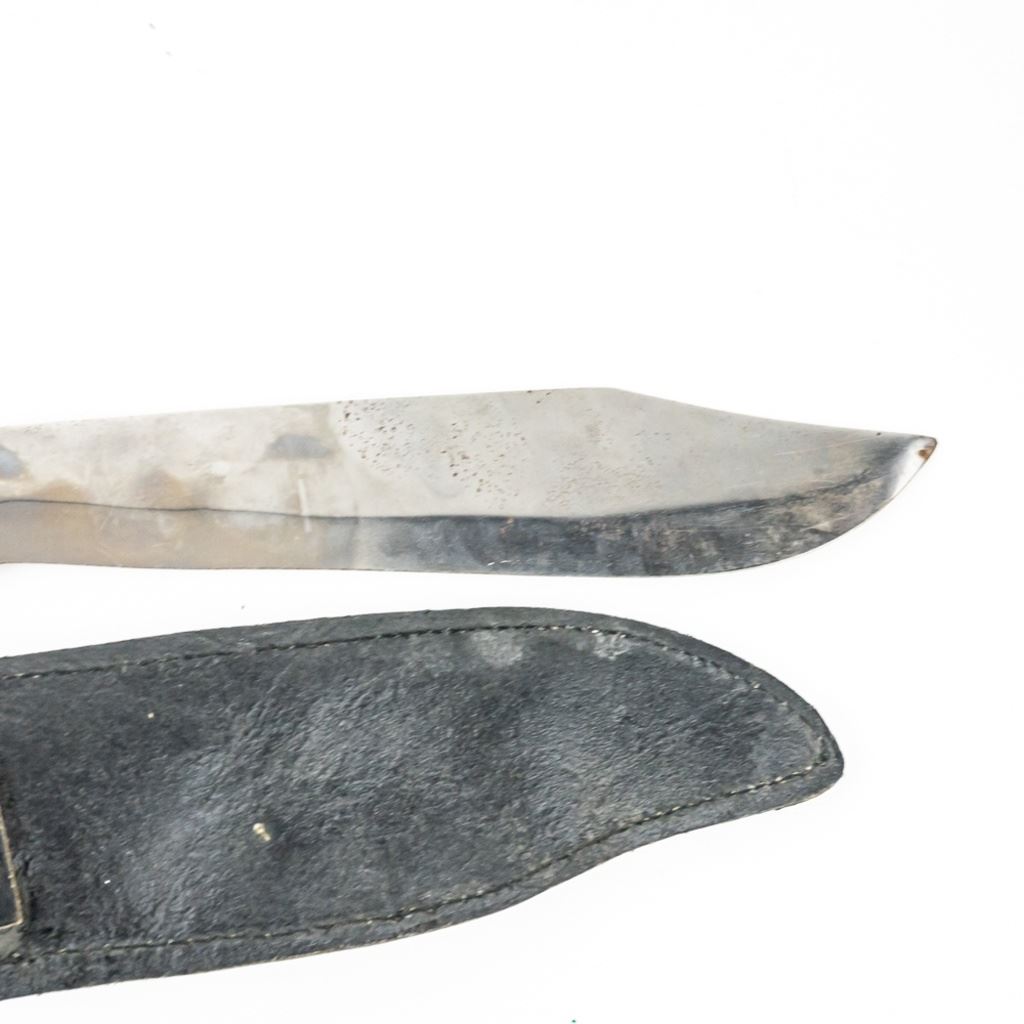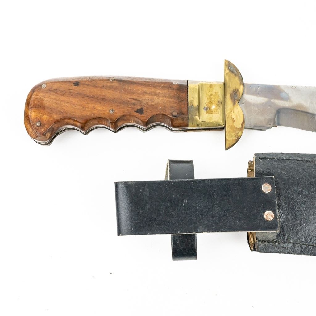 2 Imported folding bowie style knives. One is good condition and the other is brand new condition. 2 different decoration and blade styles. Lengths range from 16-19" overall. Knives come with factory sheathes and come in plastic case. See Photos.