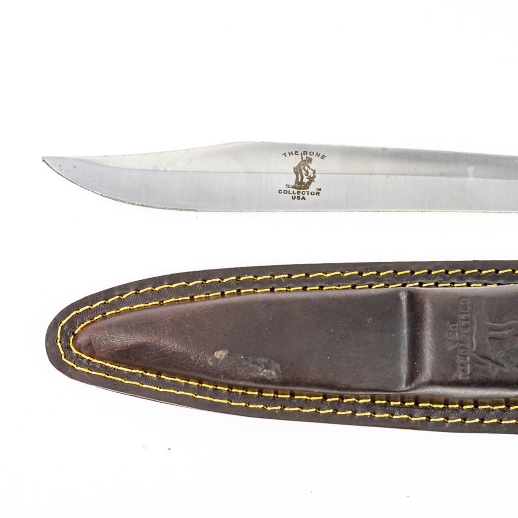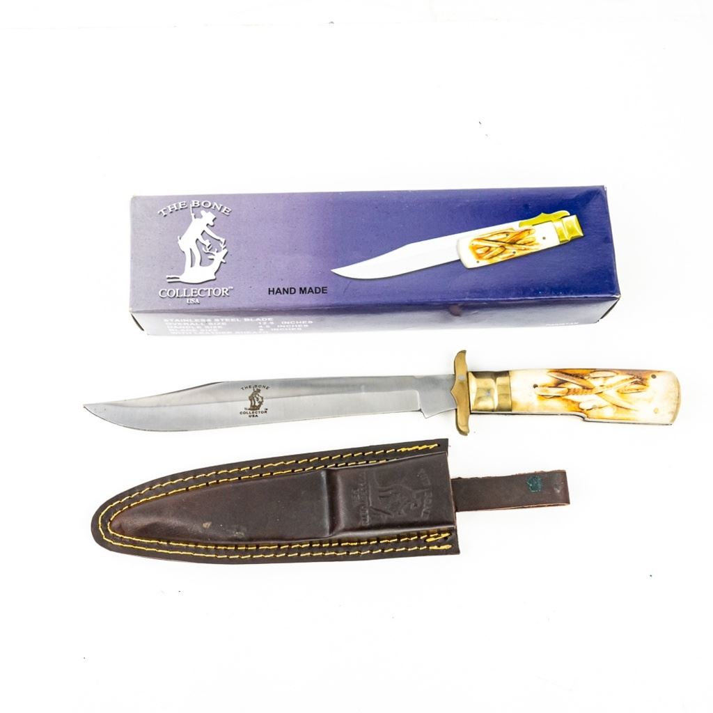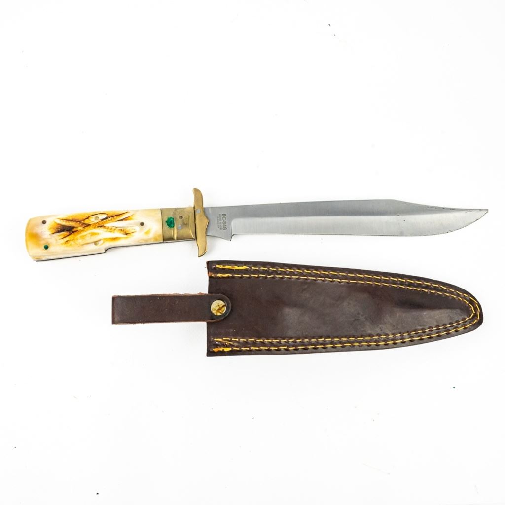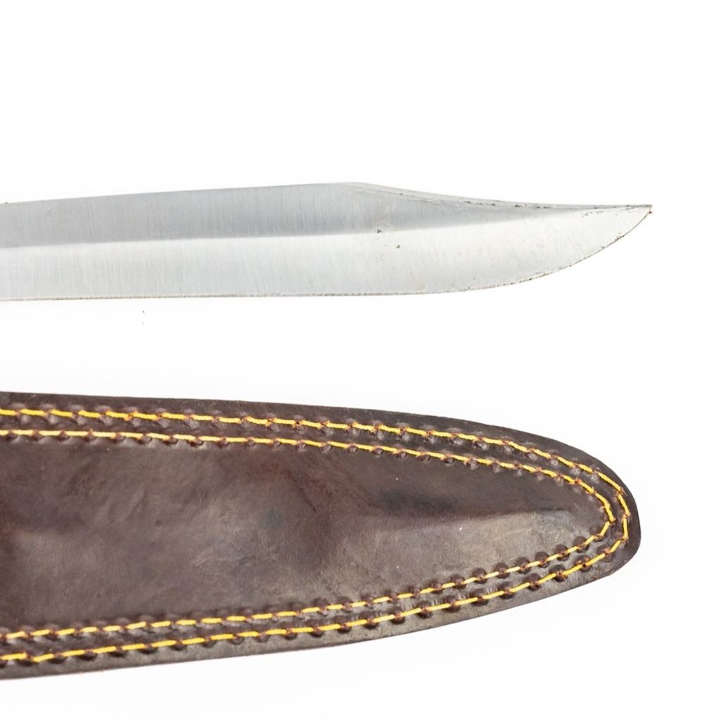 2 Imported folding bowie style knives. One is good condition and the other is brand new condition. 2 different decoration and blade styles. Lengths range from 16-19" overall. Knives come with factory sheathes and come in plastic case. See Photos.