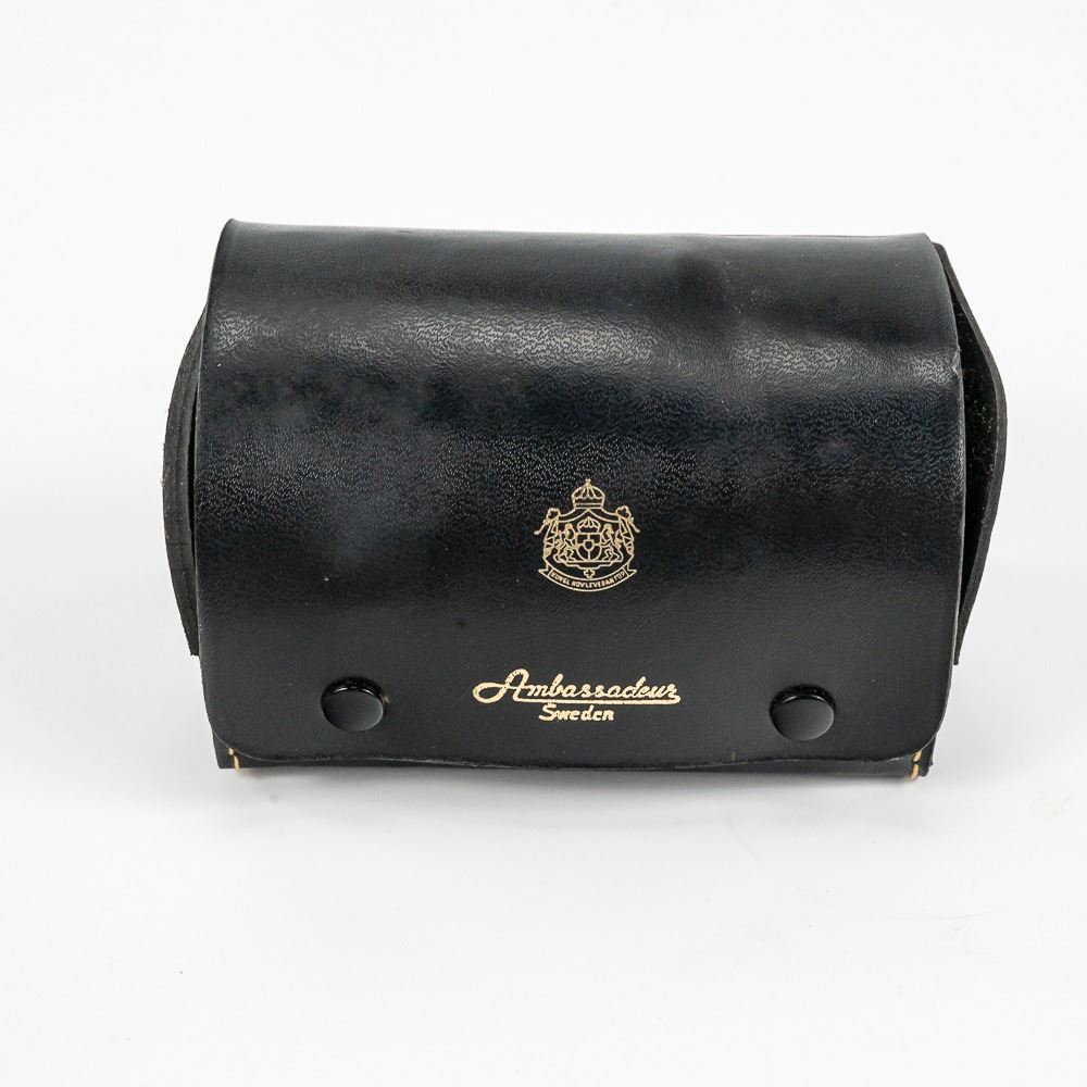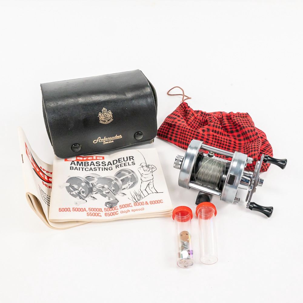LIKE NEW Beautiful Early 1970's Swedish Ambassadeur 2500C Reel in with cloth pouch, leather case, spare parts and manuals.