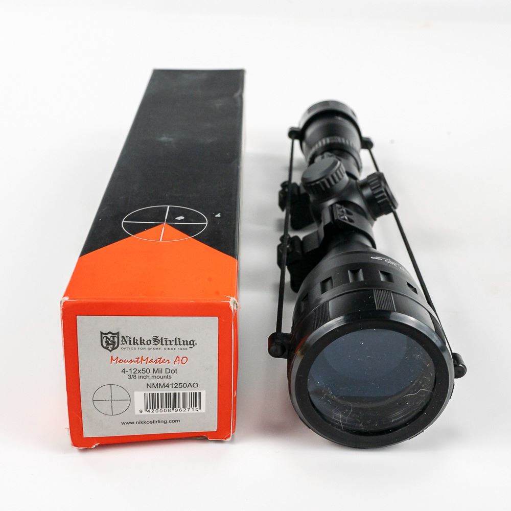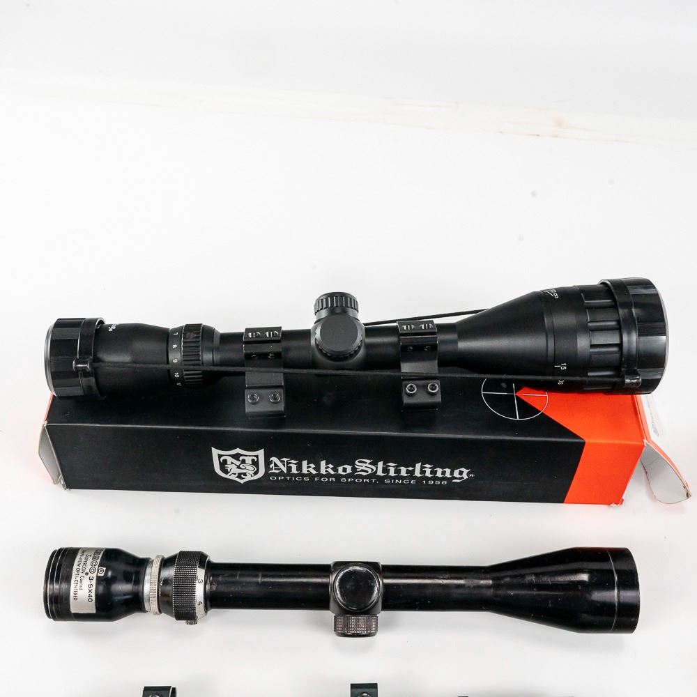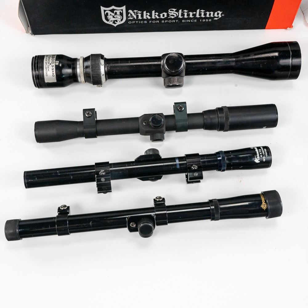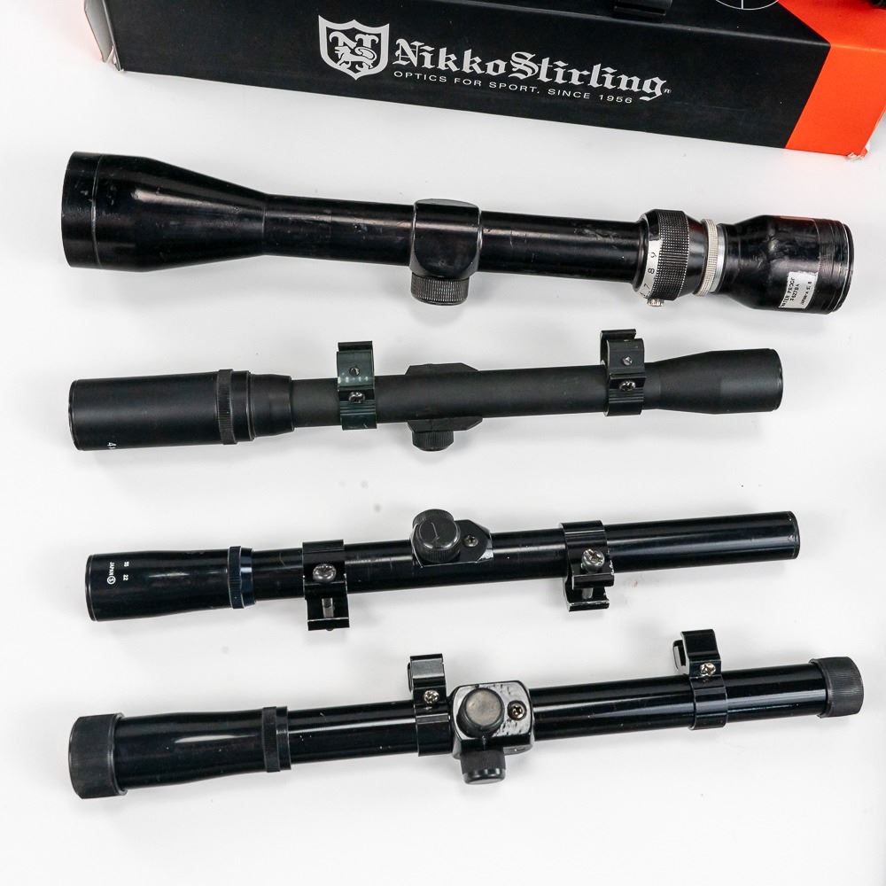 3x rimfire scopes; Glenfield 4x15,Crosman 4x15, unknown 4x20, 2x other scopes: Tasco 3-9x40 Supercon, NIB Nikko Stirling 4-12x50 AO.