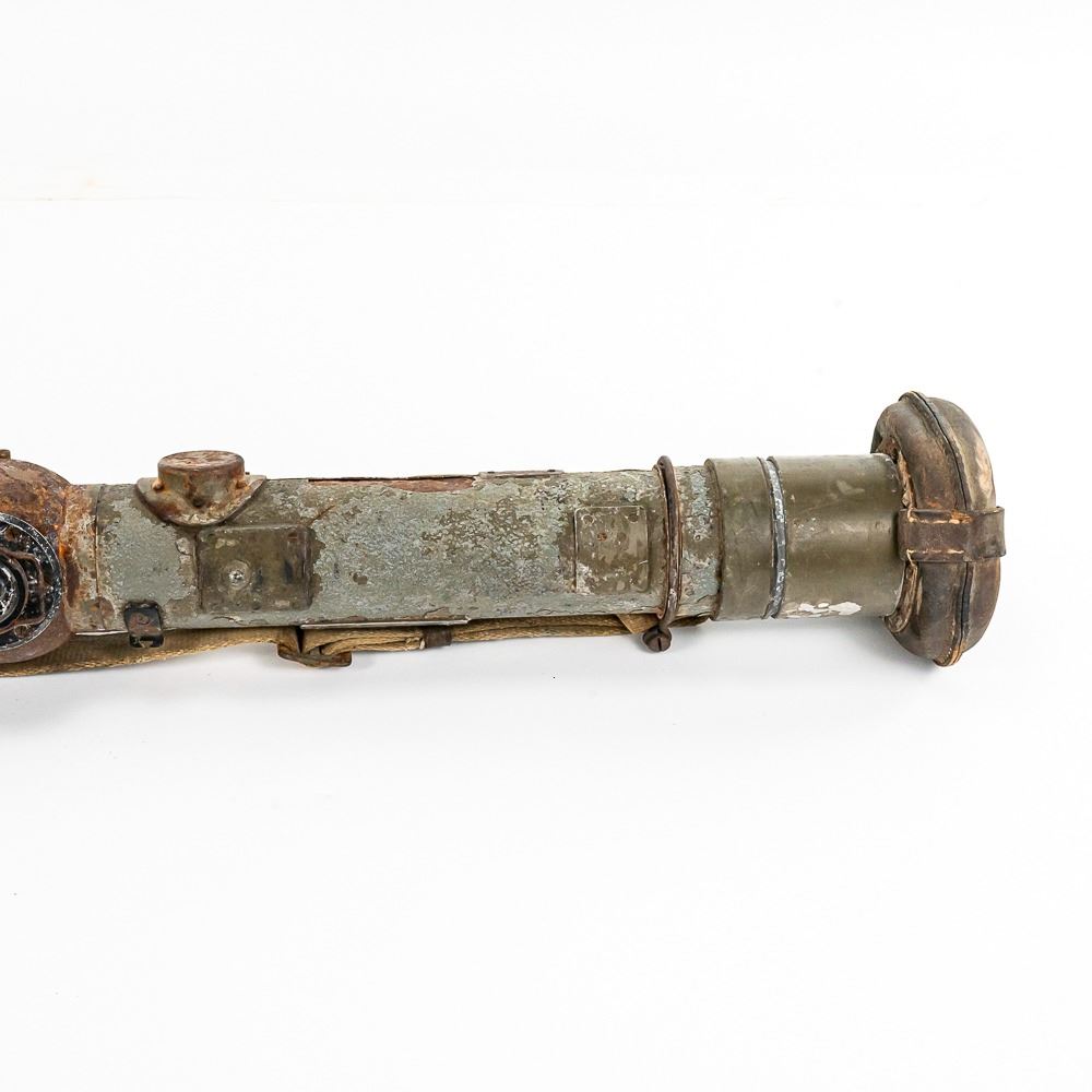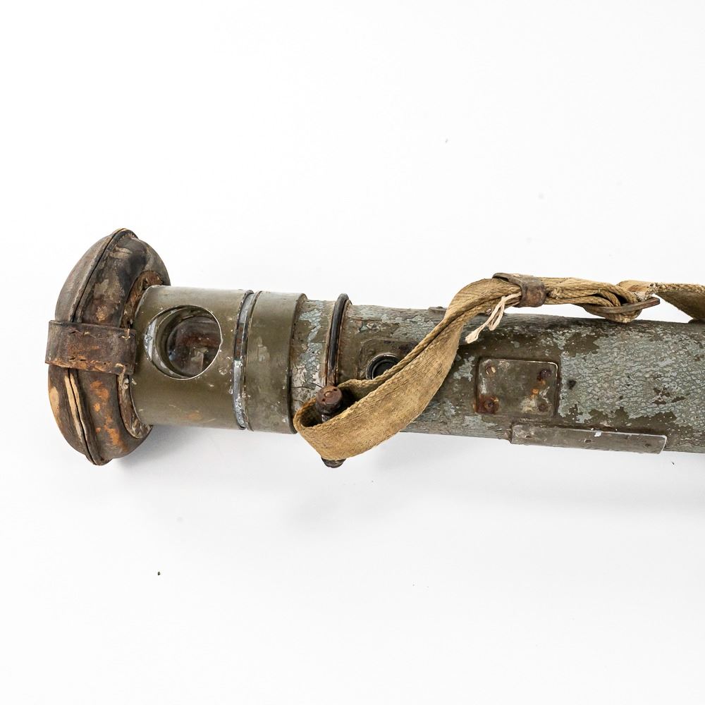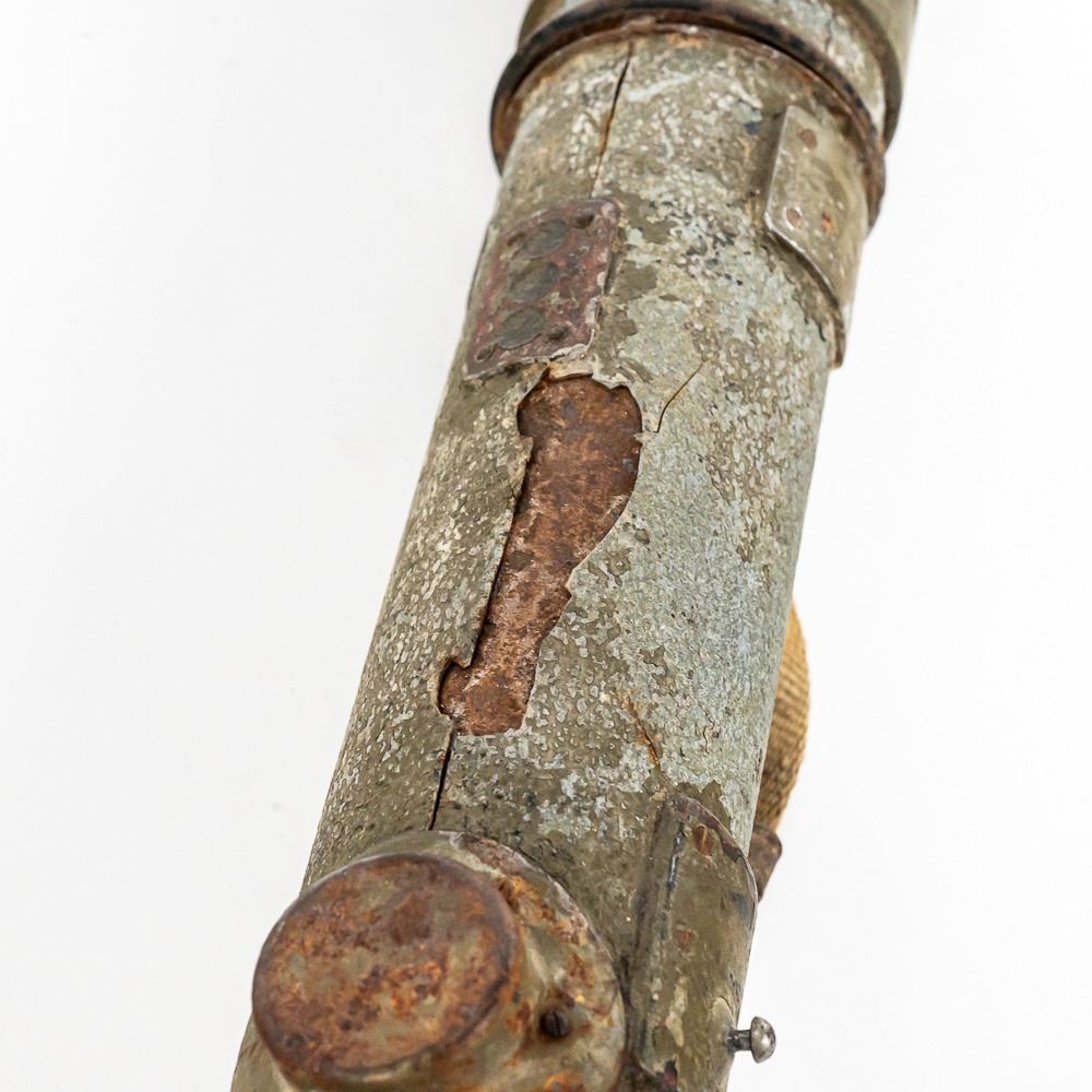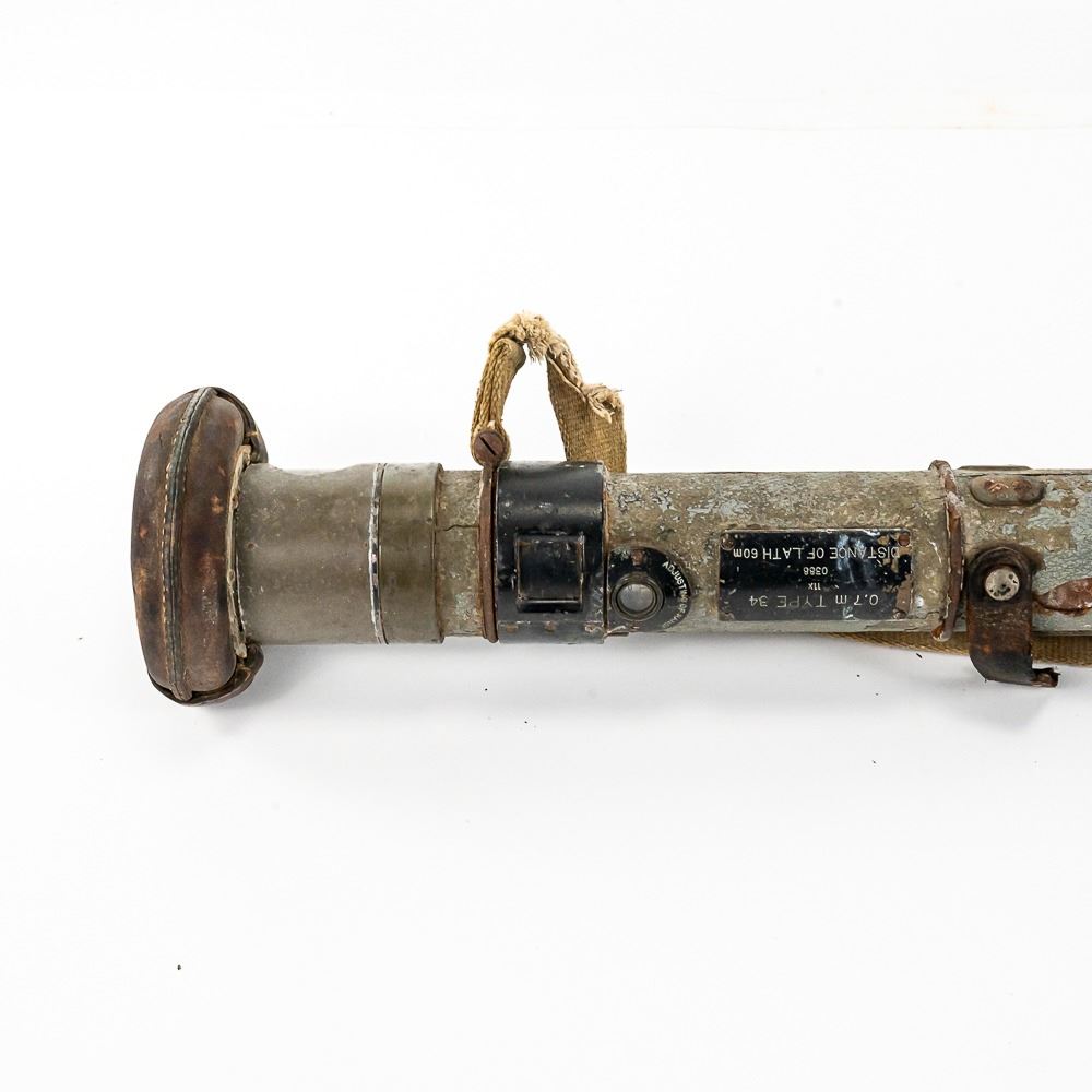 This is a World War II German Entfernungsmesser 34 (range finder 34 or EM 34), finished in a textured grey paint. The spec plates and instruction plates are in English and was converted from German language. This example was reportedly found at the Aberdeen Proving Ground in the 1970s and was later sold thru well known military collectable site. It was exposed to moisture and shows rust and staining. The optics show light only from one lens. The other lens is stuck closed. It is 32.5" long and in poor condition but very displayable.