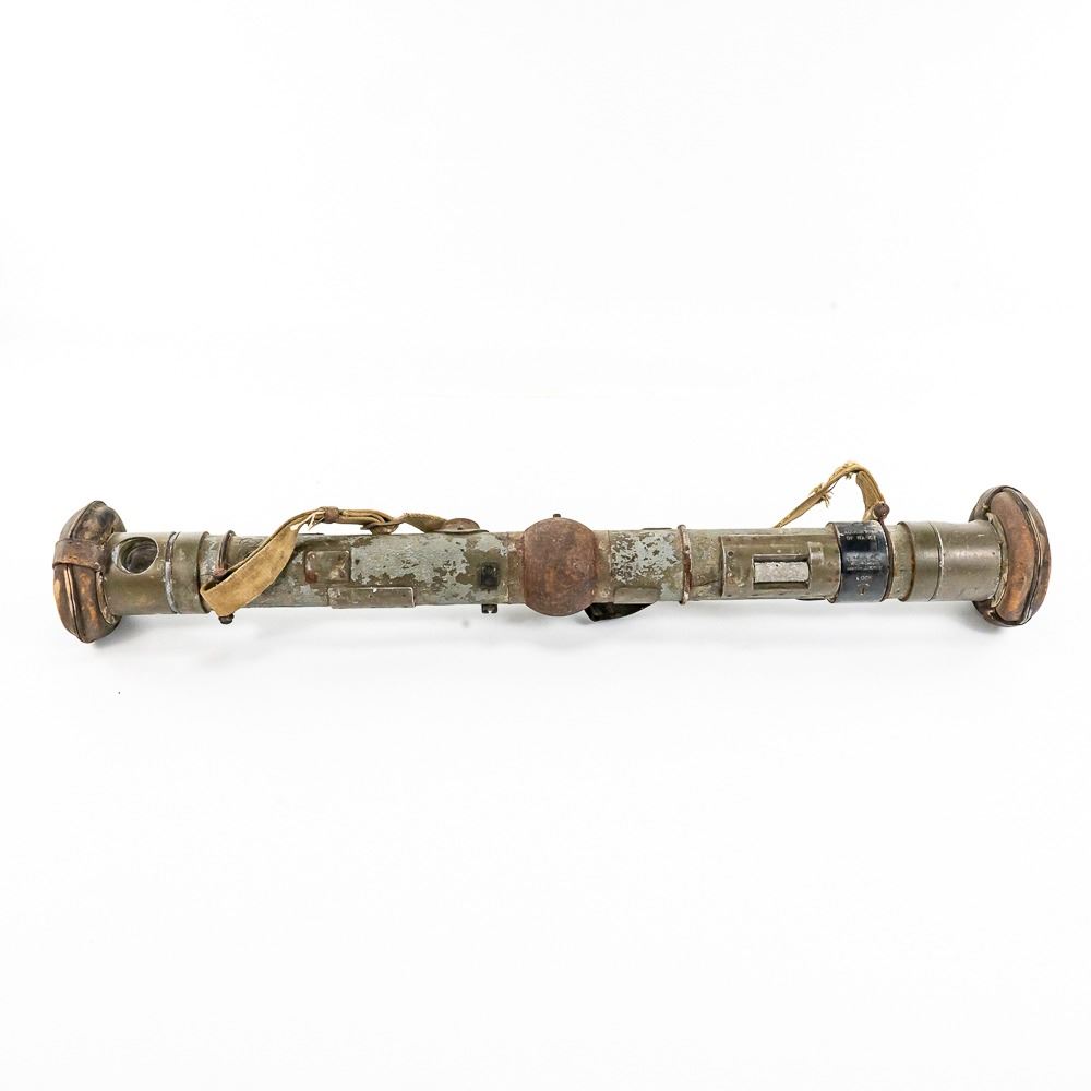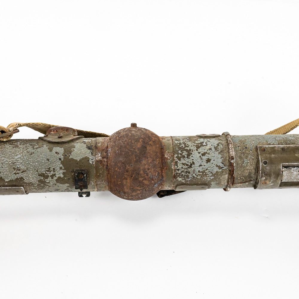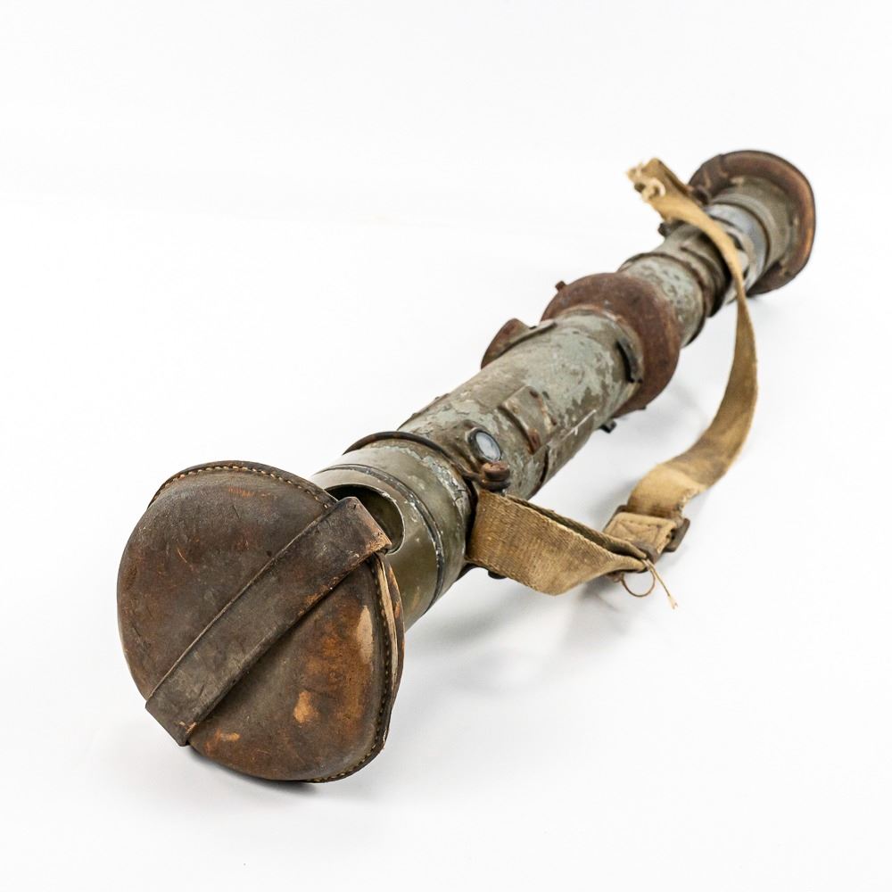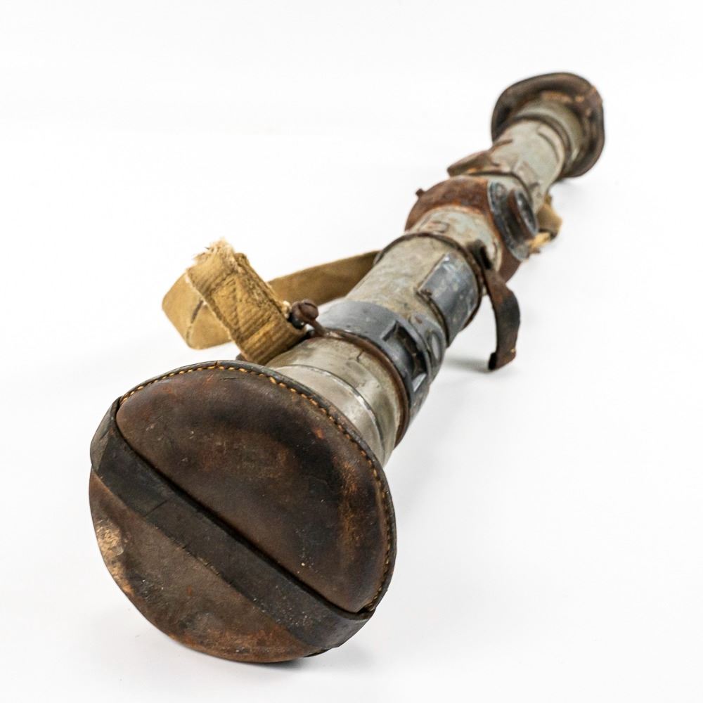 This is a World War II German Entfernungsmesser 34 (range finder 34 or EM 34), finished in a textured grey paint. The spec plates and instruction plates are in English and was converted from German language. This example was reportedly found at the Aberdeen Proving Ground in the 1970s and was later sold thru well known military collectable site. It was exposed to moisture and shows rust and staining. The optics show light only from one lens. The other lens is stuck closed. It is 32.5" long and in poor condition but very displayable.