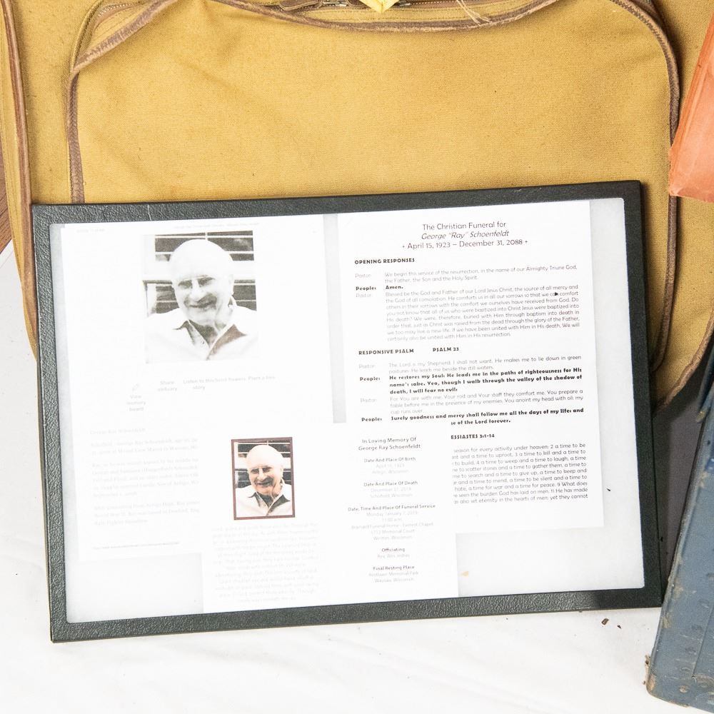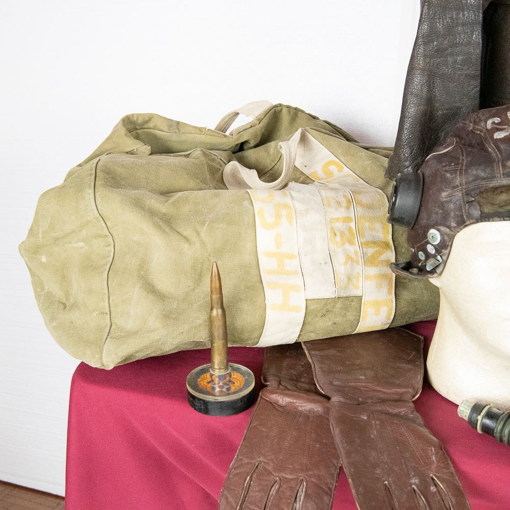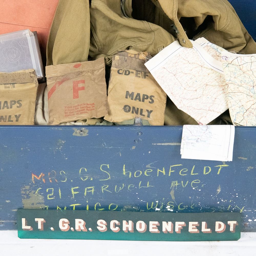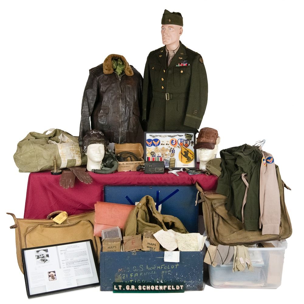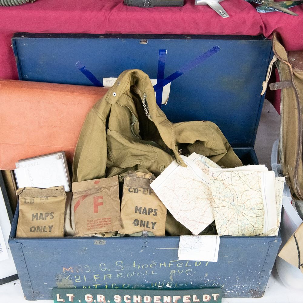 This WWII USAAF grouping belonged to Lt. George "Ray" Schoenfeldt. He was a P-51 Mustang pilot at the end of the war and flew 4 combat escort missions with B-17s. He was in the 84th Fighter squadron and the 78th Fighter Group. He escorted on the famous Berchtesgaden bombing raid in April 1945. At the end of the war, he was in Germany till 1946 and was part of the process of getting US planes back to USA and occupation force. This very large grouping includes these highlights 1) Leather 84th Fighter squadron patch cut from his A-2 jacket. 2) Pinks and Green 4 pocket tunic with bullion 8th and 9th Air Force patches. Named and dated with sterling clutchback wings. 3) Named "SHONEY" British flight helmet with avionics and A-14 oxygen mask. 4) 5 silk survival maps 43E/C, 43C/D, 43E/F in pouch, 43C/D in pouch, Sealed! F map in pouch and two button size escape compasses. 5) 16mm Bell & Howell aircraft camera. In addition: 3 officer khaki shirts with 3" wings on one, 1 chocolate brown shirt, Unmarked G-1 Navy flight jacket with no cuffs and the zipper works. 2 overseas caps, 4 ties, 1941 dated British flight gloves, size 34 summer flight suit, size 38 A-4 flight suit, Summer A series flight suit, A10 flight pants, officer mackinaw coat, bolt of "greens" uniform material (54"x68") and same size bolt of "pinks" material (54"x68"), 32" x 32" silk camo parachute material, 2 silk camo parachute cut scarves, 4 types of ditty and duffel bags, B-3 flight bag, 2 musette bags, canteen, and George's brother's B-3 flight bag...The smaller items include Plexi box dated 1945-46, US match safe with compass, British anti-dimming cloth in tin, trench art lighter with 8th AF patch, British oxygen bag/tube, named Polaroid flight goggles in box, Office door Green Plexi name plate, PX pillow case, Aluminum P-51 Mustang model, Black rubber ID model, Over 35 German Marks notes and coins, German police Shako eagle, German civilian gas mask in poor condition. Also includes over 100 pages of his service, over 160 photo album of service stateside, over 200 photos in Germany with both German and US planes, nose art, manuals, newspapers and magazines, training year book, three 3" pilot wings, cap badges and AF collar devices and much more - see photos. George's son Fred, has a lot in this auction of his Vietnam service USAF service, George's British flight boots and Type C16 50 Cal training adapter gun mount and camera-enlarger Lot