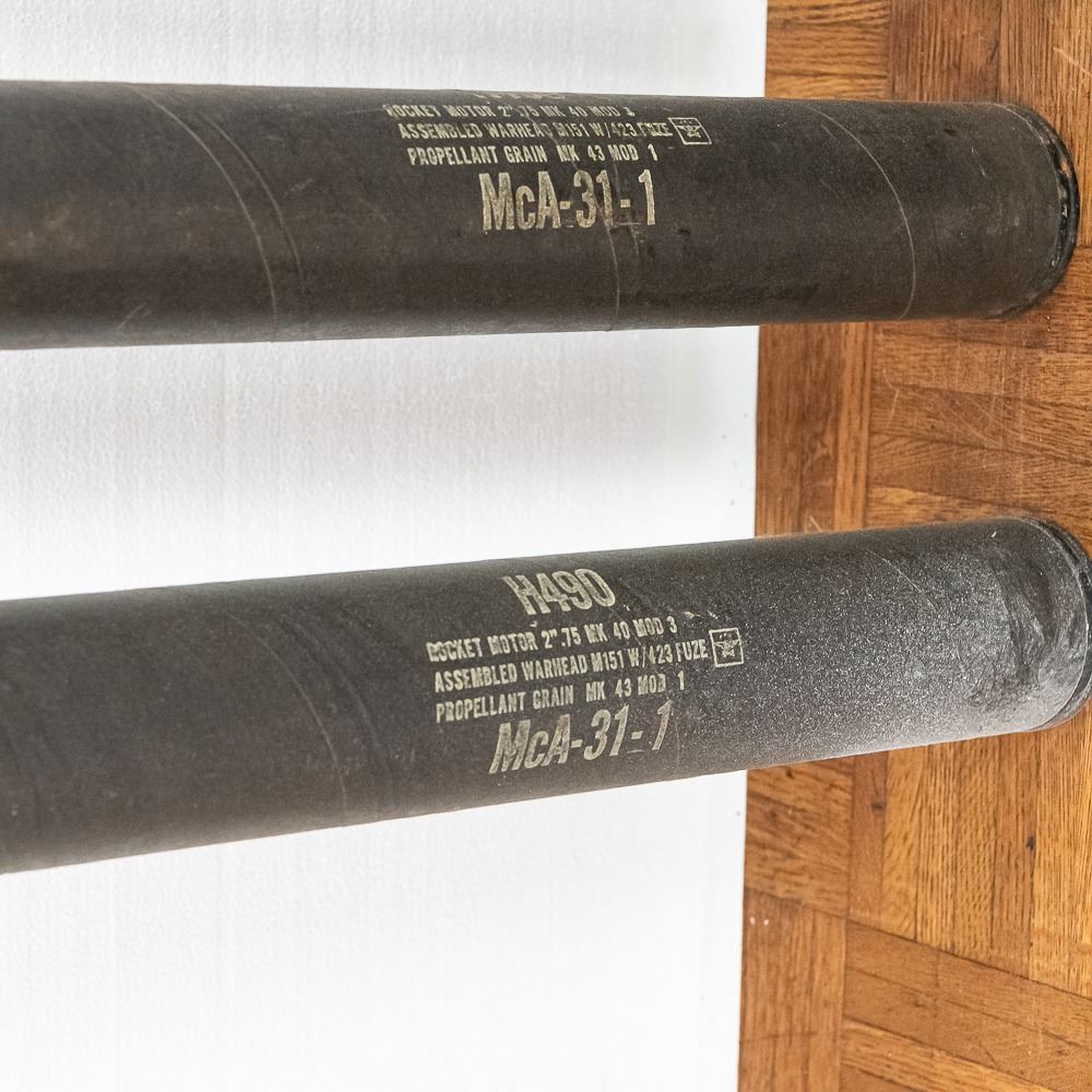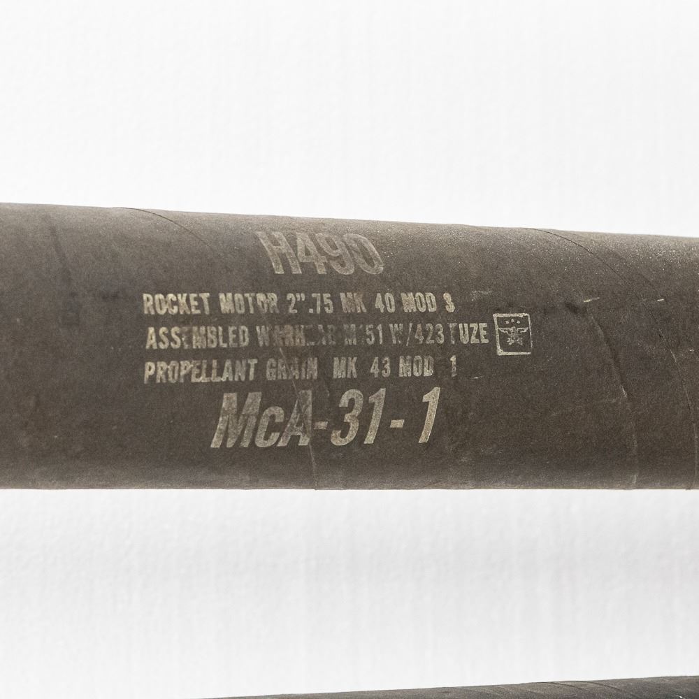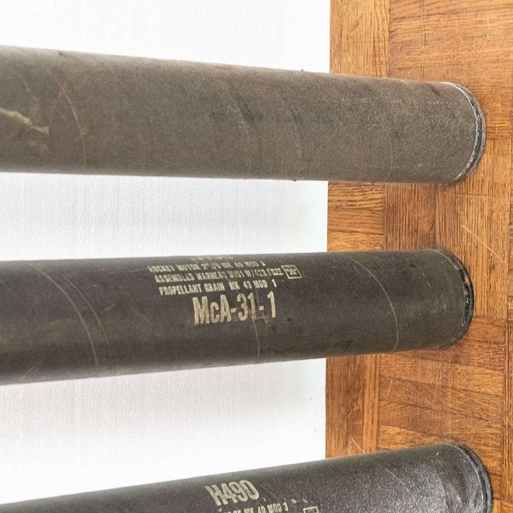 Tubes ONLY! 3 tubes are 58" long and have all their end caps. They are marked H490 ROCKET MOTOR 2".75 MK 40 MOD 3" over "ASSEMBLED WARHEAD M151 W/423 FUSE" over "PROPELLANT GRAIN MK 43 MOD" over "McA-31-1". Tubes are in good condition and are not dented and show some age and wear. These tubes are rarely offered for sale.