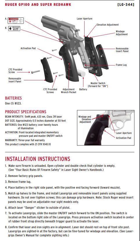 LG-344 laser sights feature Crimson Trace's® rubber-overmold construction around a sturdy polymer grip frame. Providing equal comfort and control compared to stock Ruger grips, the LG-344 is compatible with Ruger wood panels (Super Redhawk). Lasergrips® with your Ruger revolver are ideal for personal protection from threats walking on four legs as well as two.