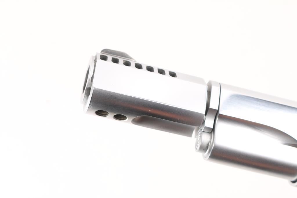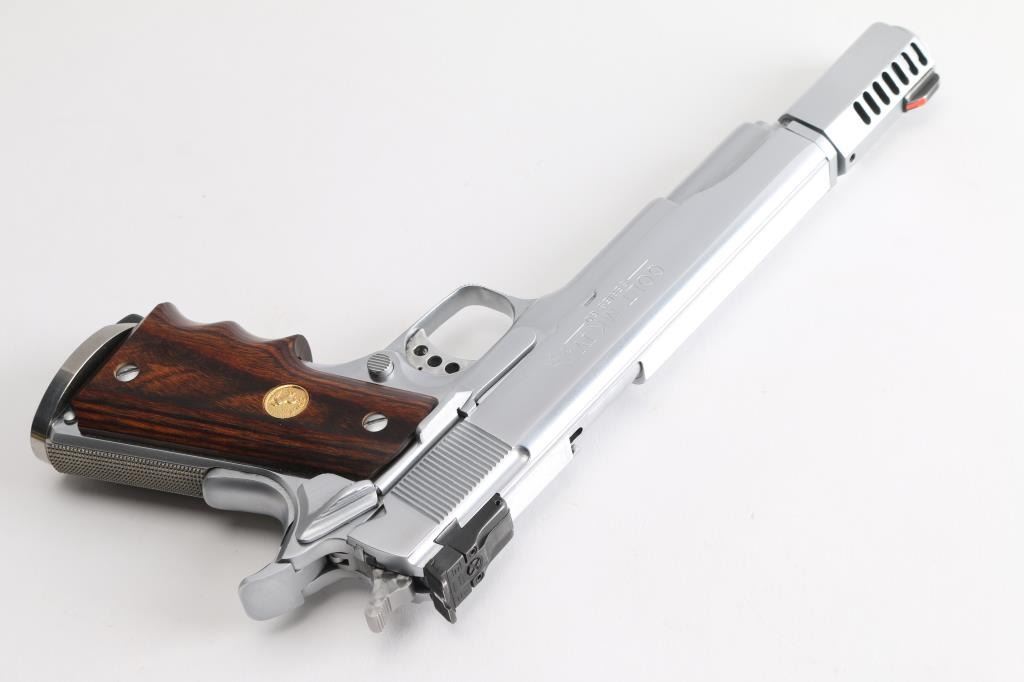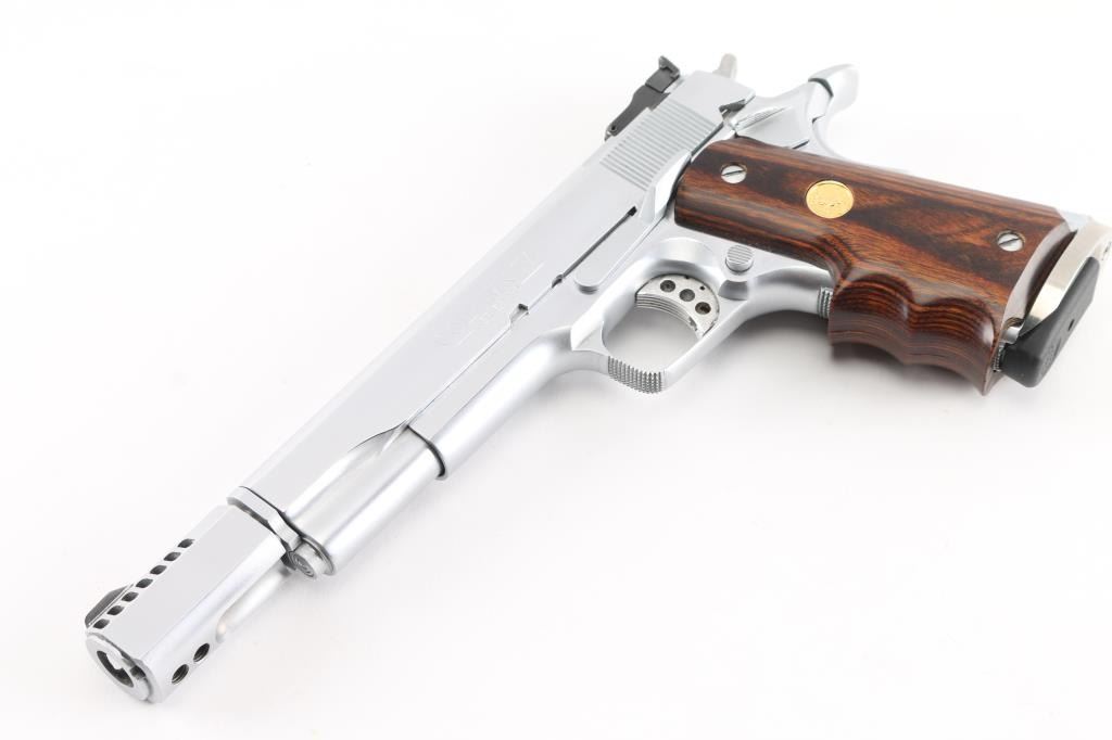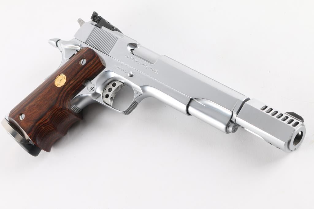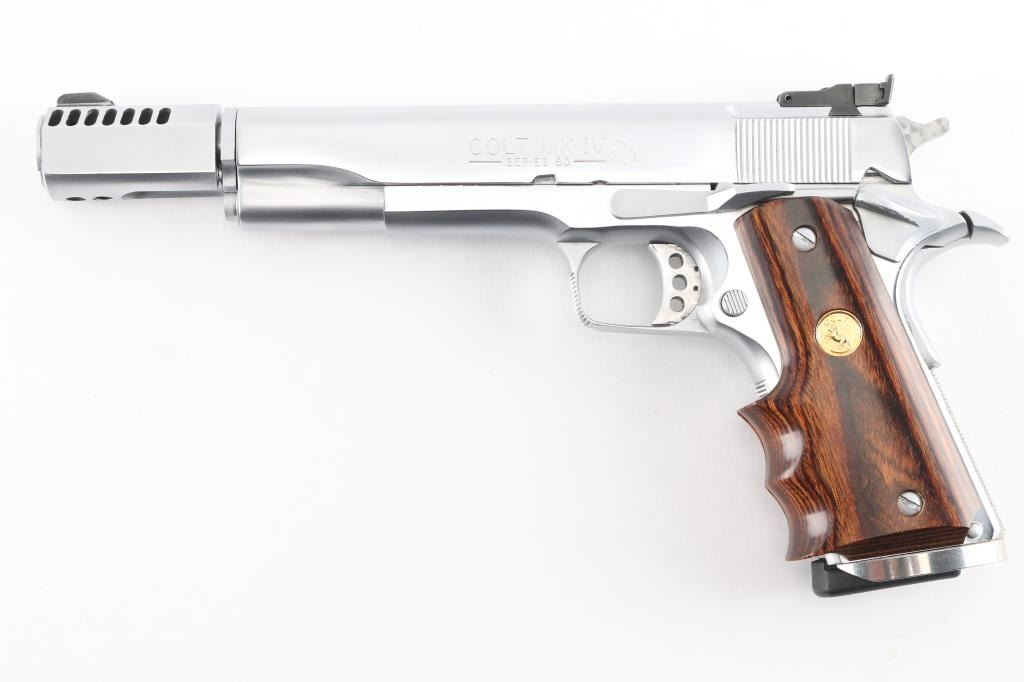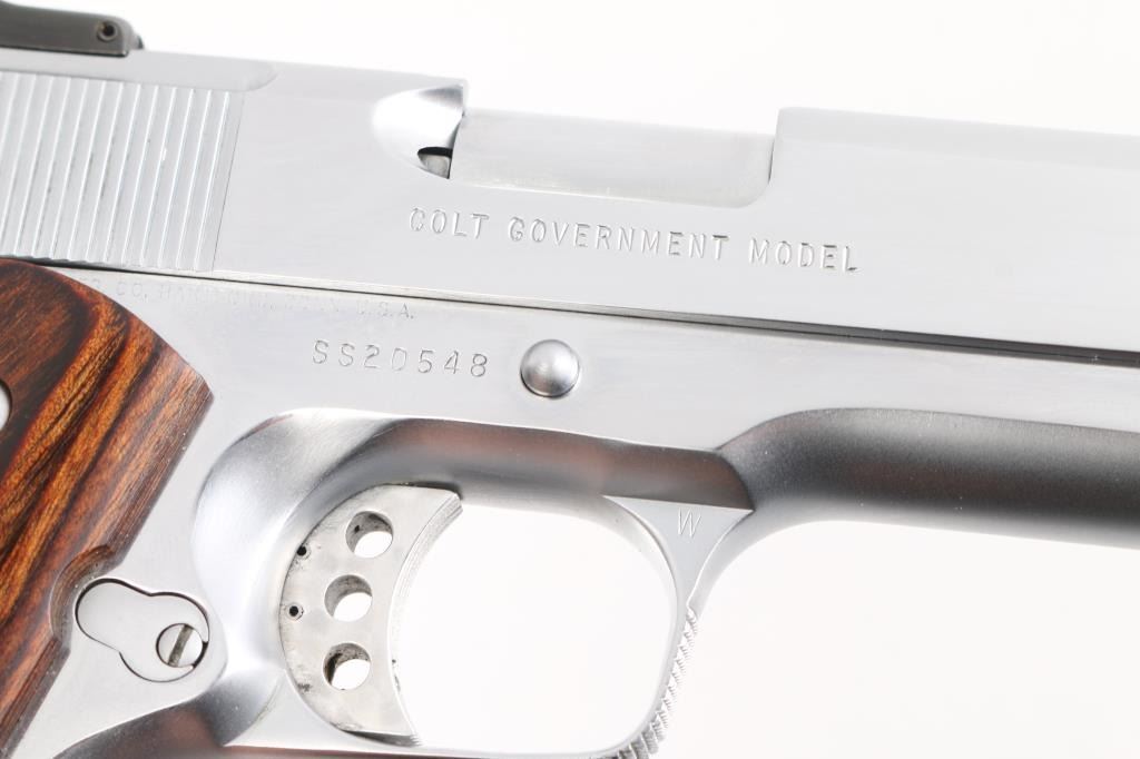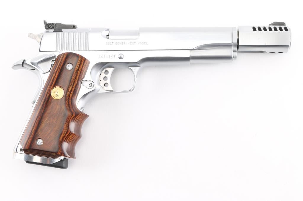 Colt Series 80 Government Model. Polished stainless steel frame, jewel hammer and trigger with custom slide top serrations and milling near rear sight, custom stainless steel compensator with target front sight on a 5 inch barrel. Bore is very good. Colt laminated wood target grip, mag well extension and trigger guard serrations. All custom work done by Caraville Arms, which is marked on the slide and barrel. Function is good and this is a very good custom 1911. Condition is NRA Excellent